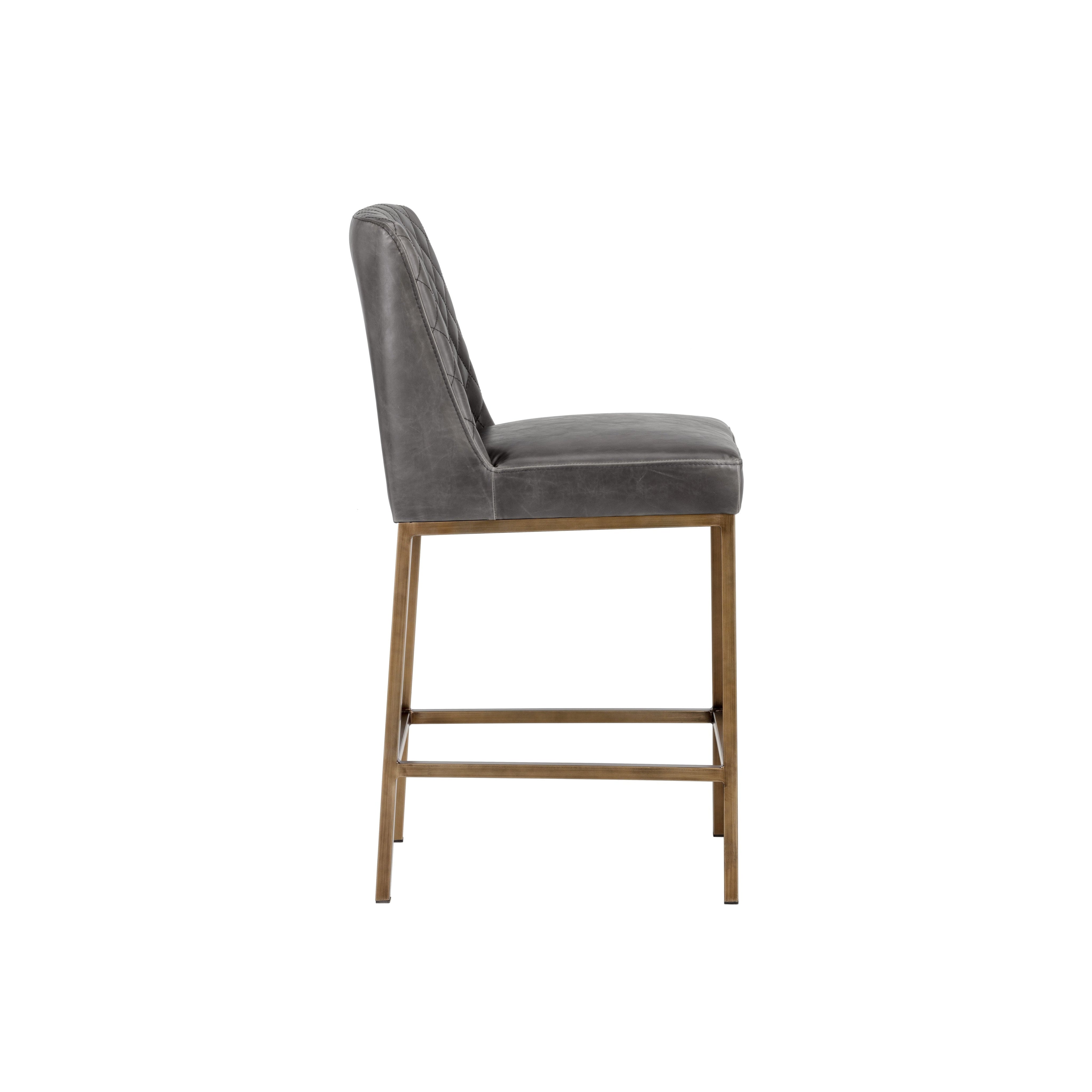 Transform bar and dining spaces with this classic counter stool. Stocked in overcast grey faux leather with diamond stitching on the interior seat back and an antique brass frame steel frame. Suitable for various dining, kitchen and bar spaces of all sizes. Handle With Care: This design has been crafted with faux leather. Faux leather is manufactured to reflect the natural characteristics of leather; as such, colour variations, markings, wrinkles, grooves, and light scratches are appreciated characteristics. No two pieces will be alike. Visit our Product Care page for more information on how to ensure the lasting beauty of this piece.