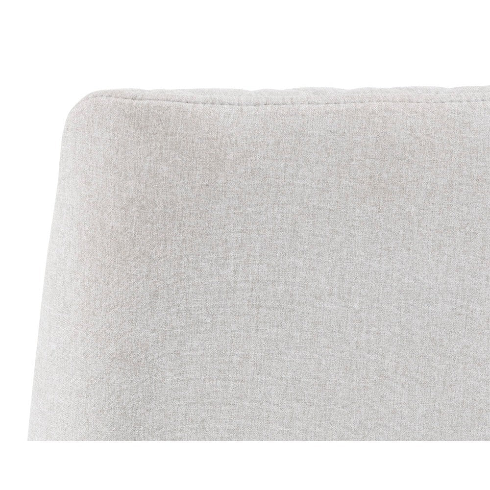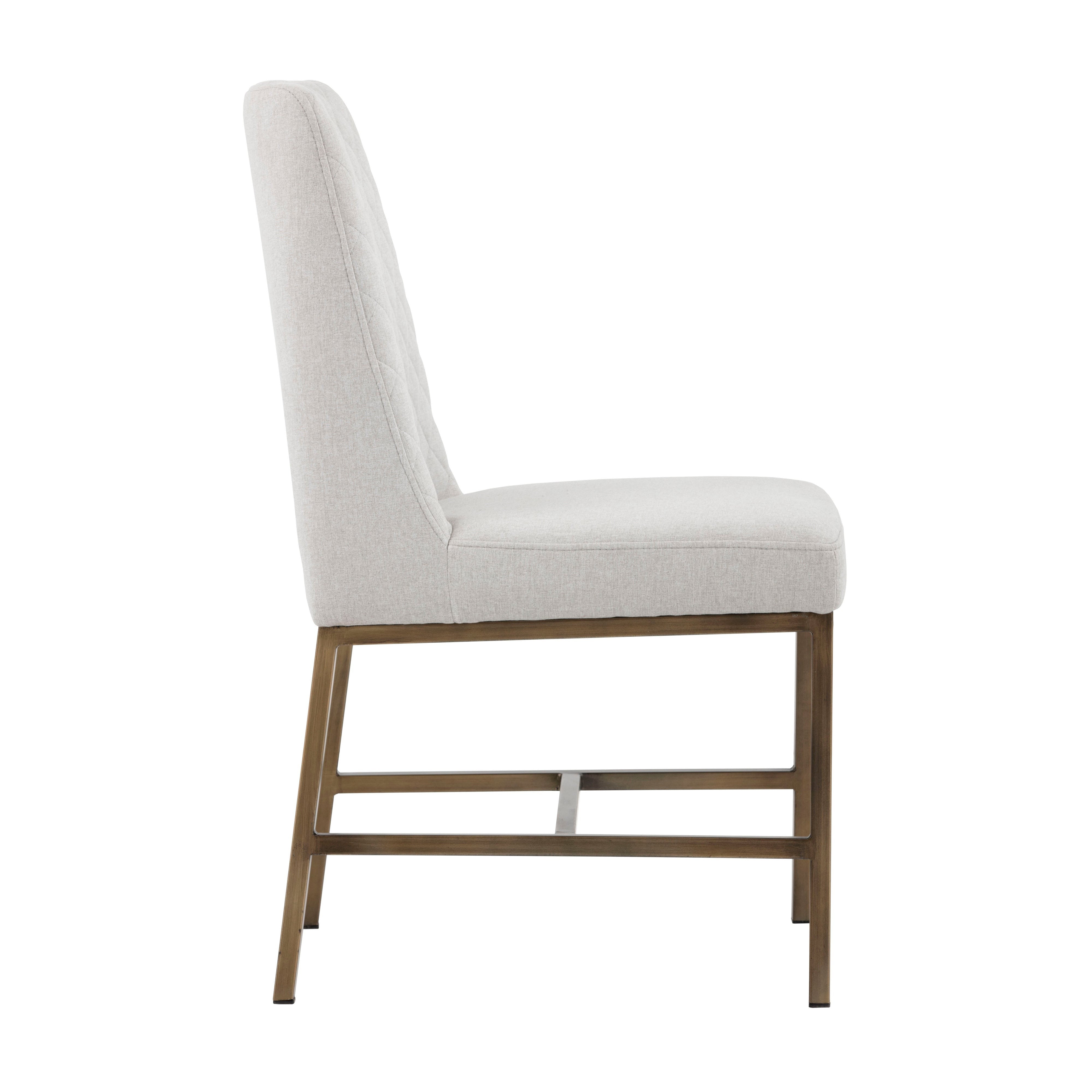 Invigorate dining spaces with this classic dining chair. Features beautiful diamond stitching on the interior seat back and an antique brass frame steel frame. Stocked in light grey fabric.