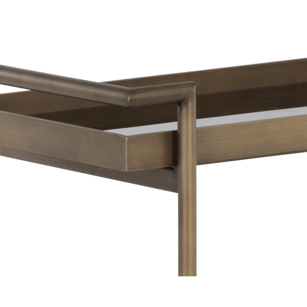 A truly versatile and stylish bar cart featuring sleek, black glass shelving with an antique brass stainless steel tubular frame and legs. Castors allow for easy mobility.