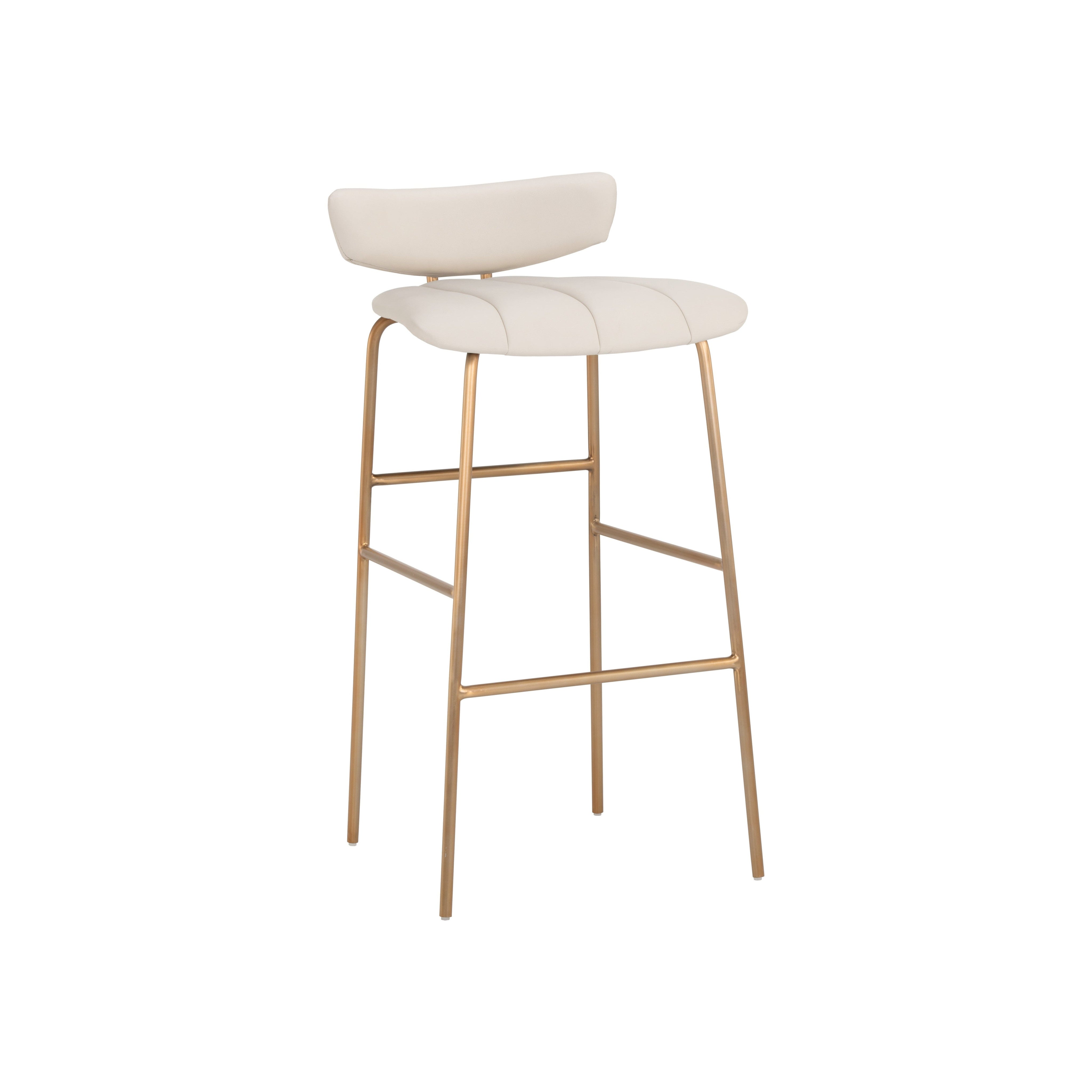 A chic barstool featuring a channel tufted seat and a low profile seatback in dillon cream faux leather. A brushed gold stainless steel frame completes this feminine look. Suitable for various dining, kitchen and bar spaces of all sizes. Handle With Care: This design has been crafted with faux leather. Faux leather is manufactured to reflect the natural characteristics of leather; as such, colour variations, markings, wrinkles, grooves, and light scratches are appreciated characteristics. No two pieces will be alike. Visit our Product Care page for more information on how to ensure the lasting beauty of this piece.