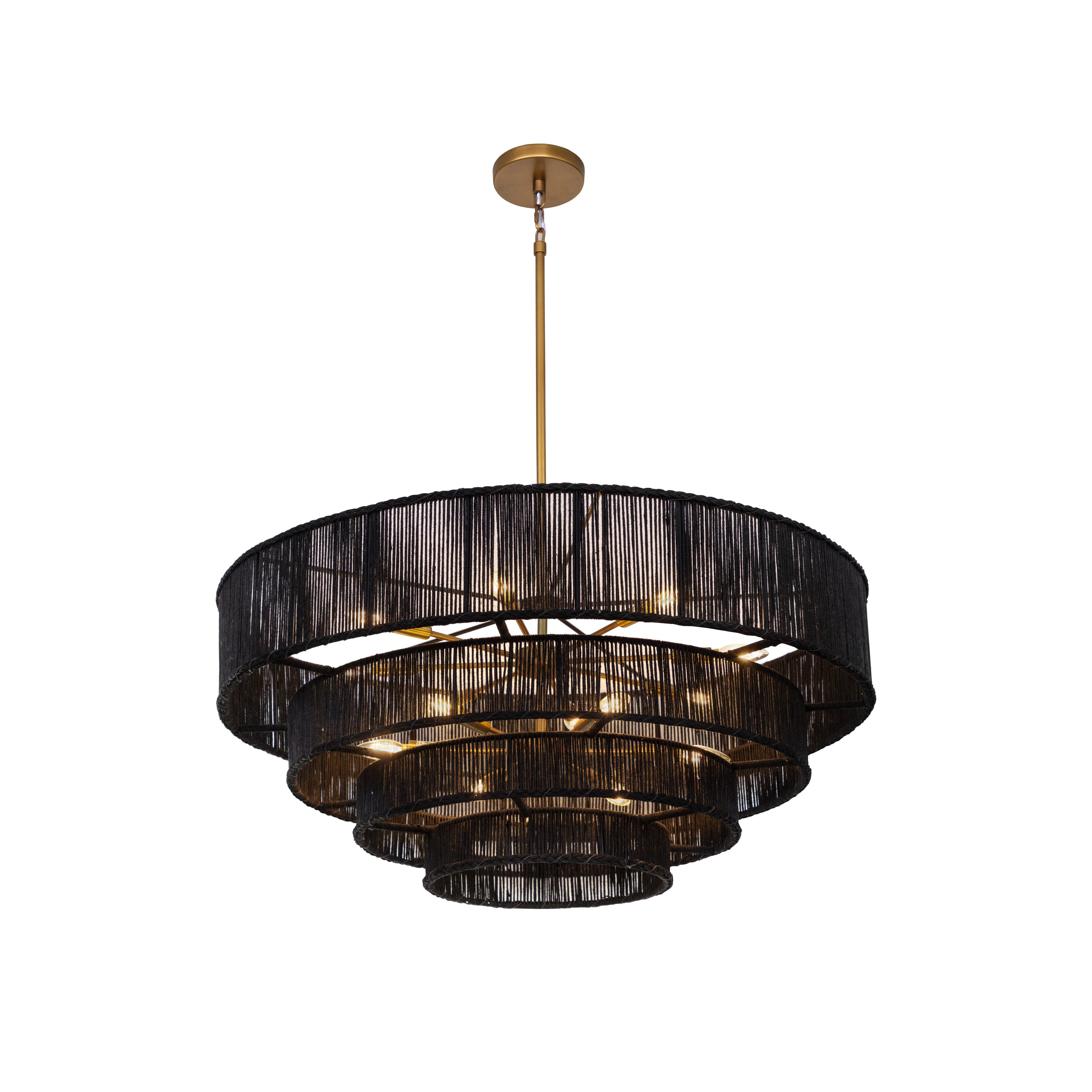 Brimming with rustic allure, the Lumina Chandelier adds a charming flair wherever it is placed. Handcrafted from black jute with a traditional tiered drum shape, this artisan-crafted piece allows soft light to filter through its open handwoven lines.