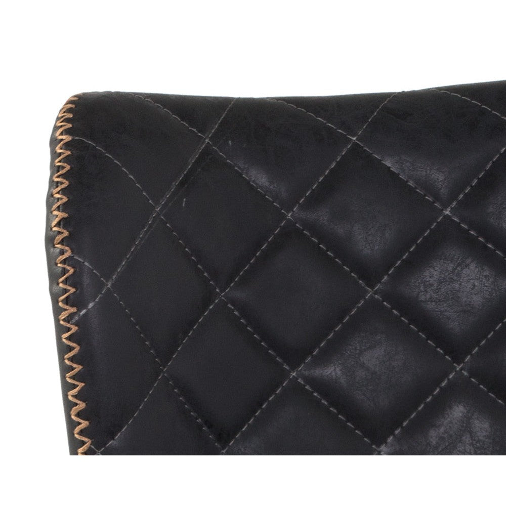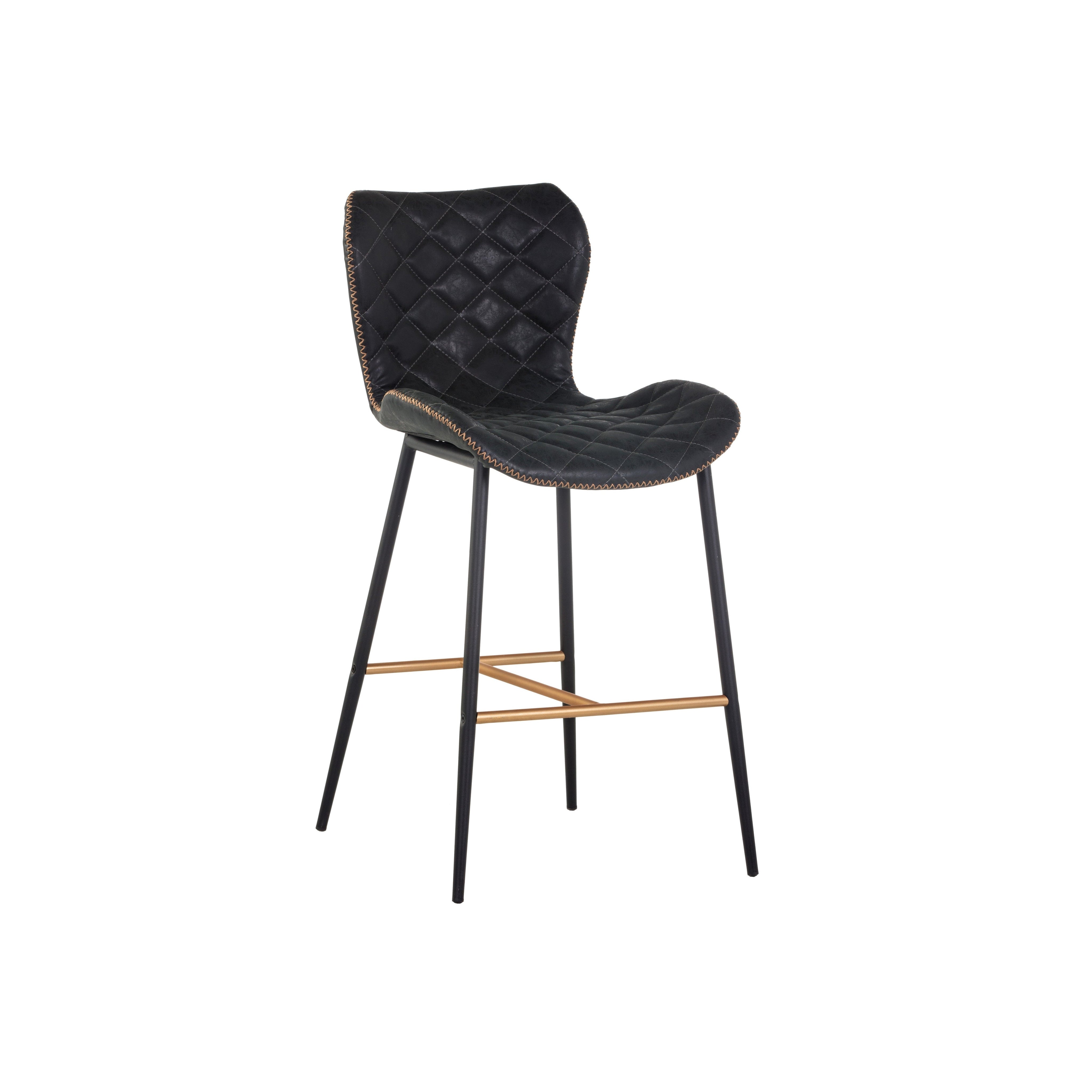 A stylish counter stool featuring a sculpted diamond-stitched seat and exposed zig-zag stitching along the seat frame. Stocked in antique black faux leather with black steel legs. Stretchers in a champagne gold painted finish complete the look. Suitable for various dining, kitchen and bar spaces of all sizes.