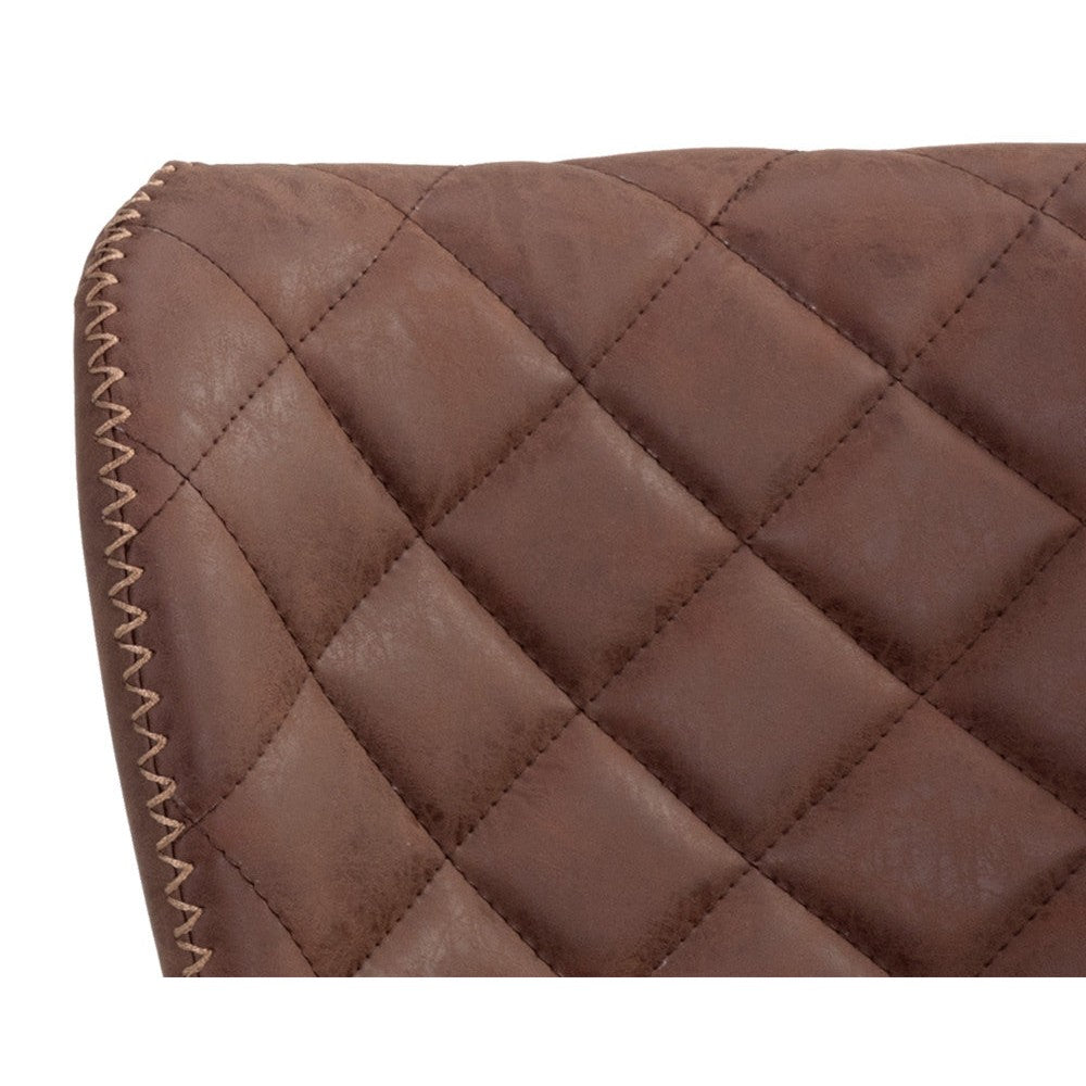A stylish counter stool featuring a sculpted diamond-stitched seat and exposed zig-zag stitching along the seat frame. Stocked in antique brown faux leather with black steel legs. Stretchers in a champagne gold painted finish complete the look. Suitable for various dining, kitchen and bar spaces of all sizes.