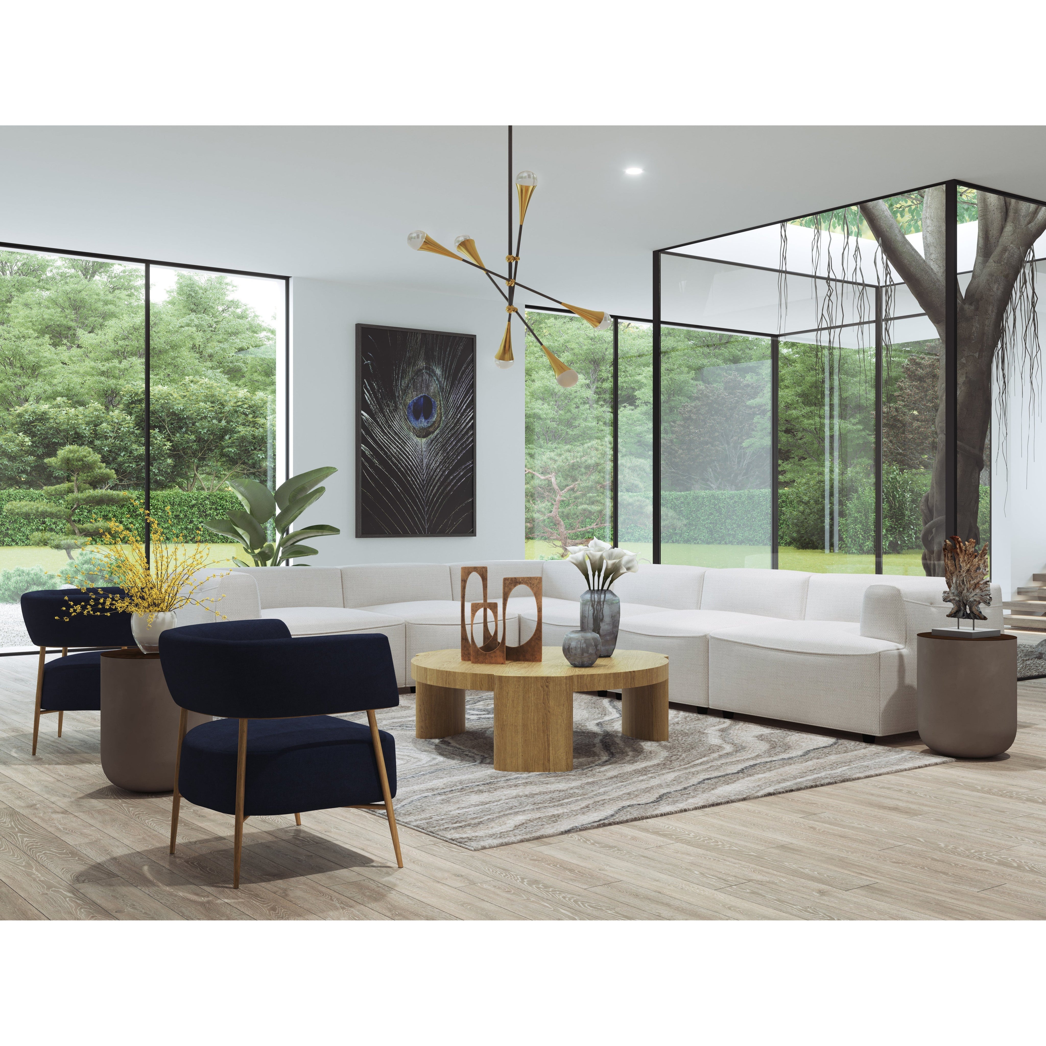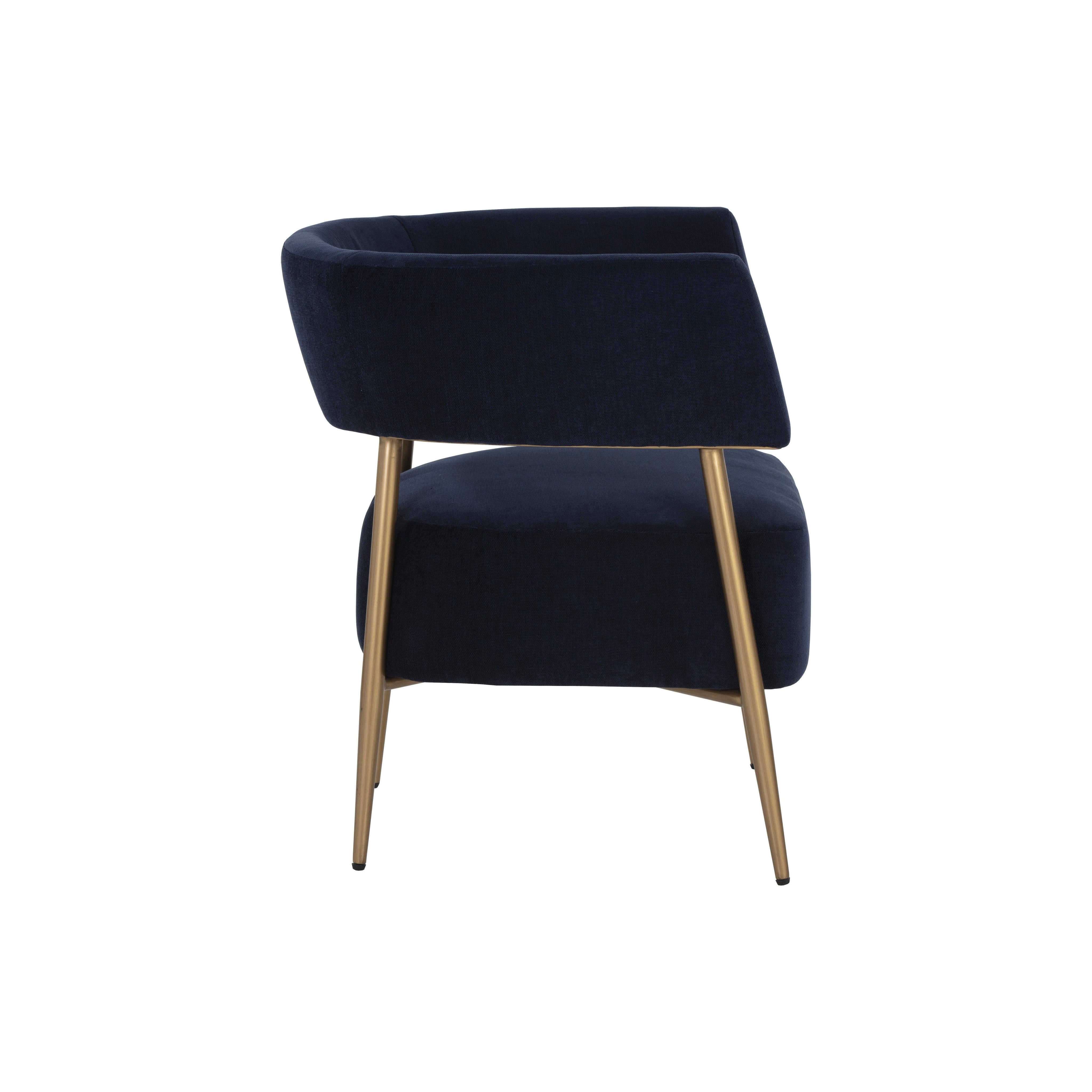 Turn heads with this contemporary lounge chair that exudes extravagance. Features a curved frame and upholstered in our danny navy and rust fabrics. Completed with antique brass legs. Also available in dove cream fabric.