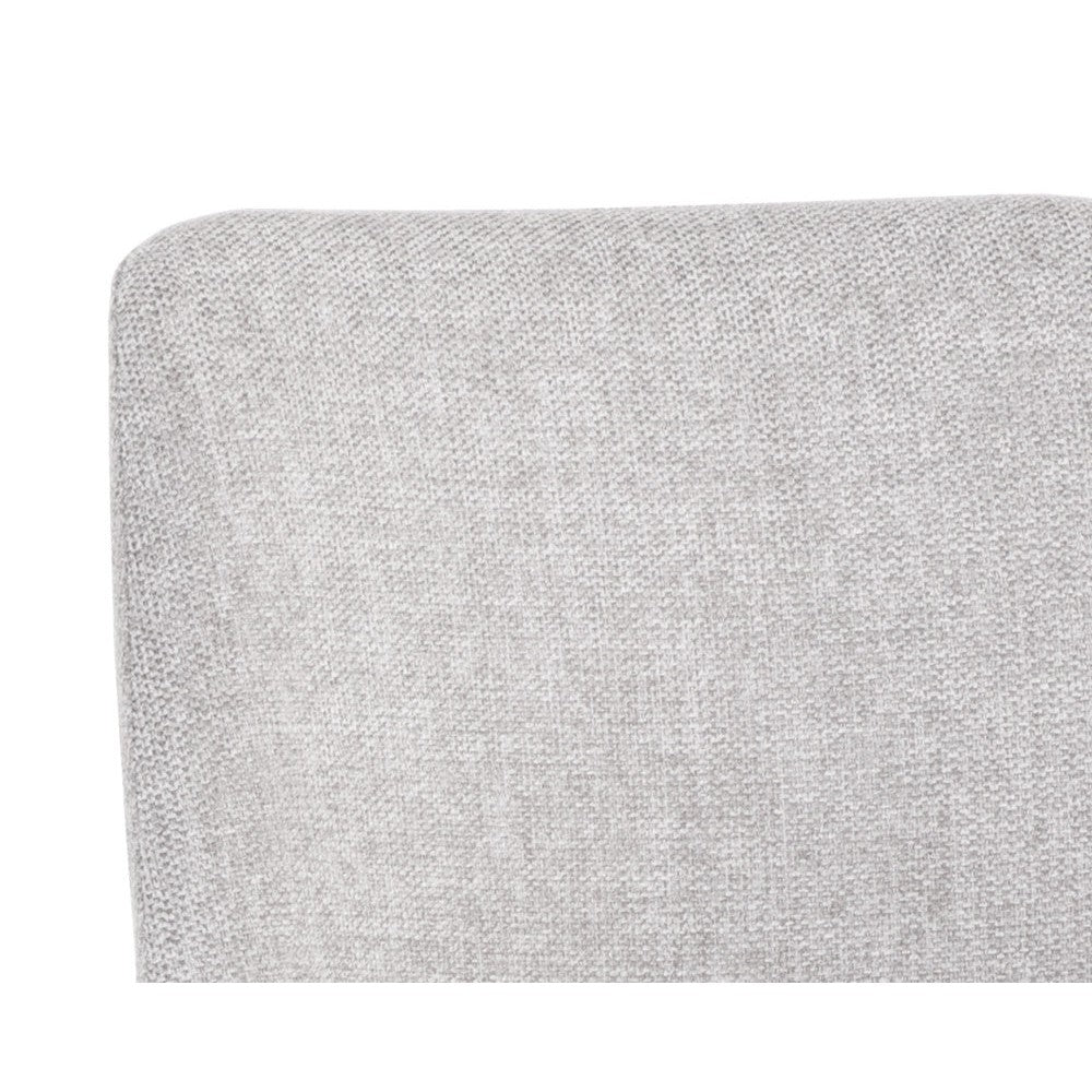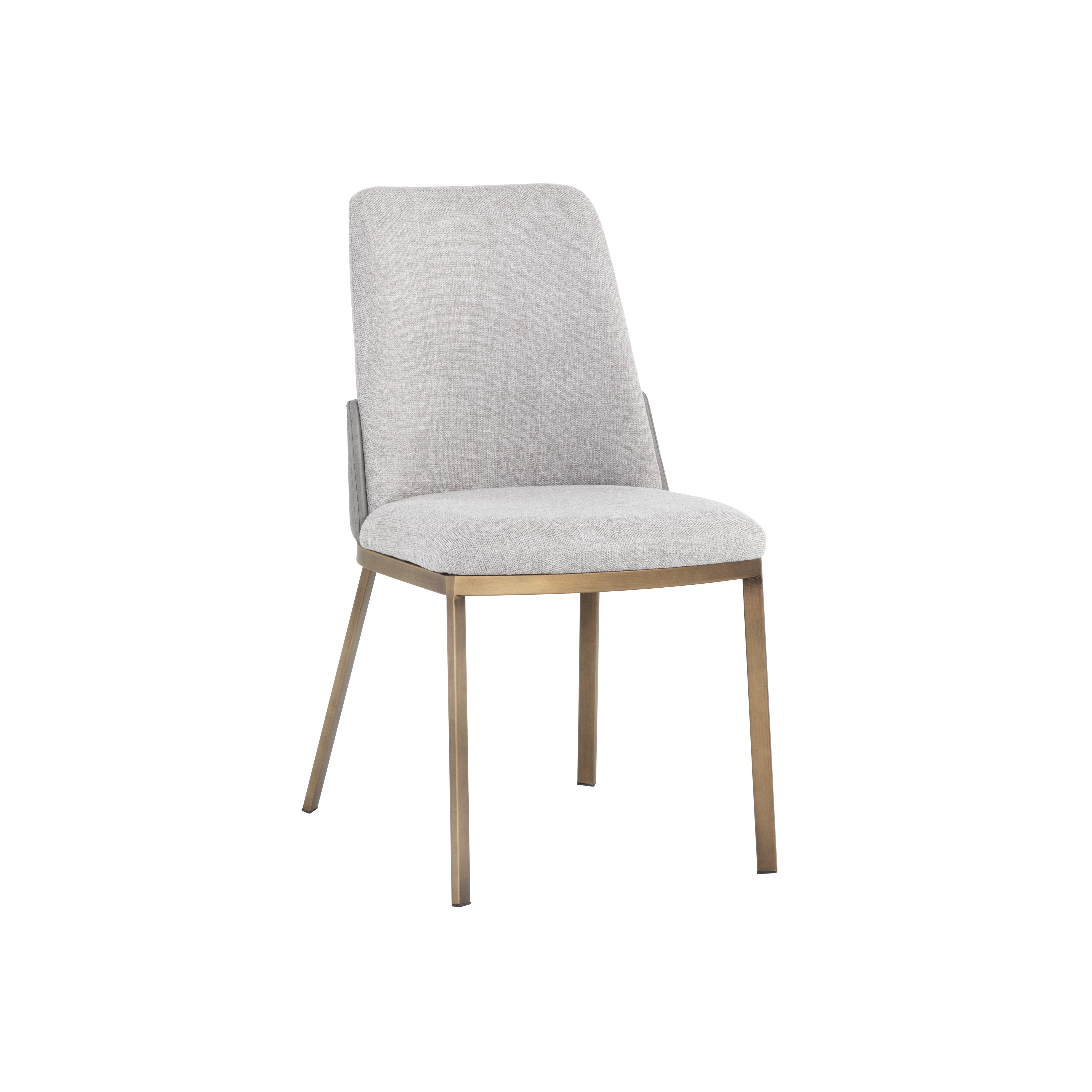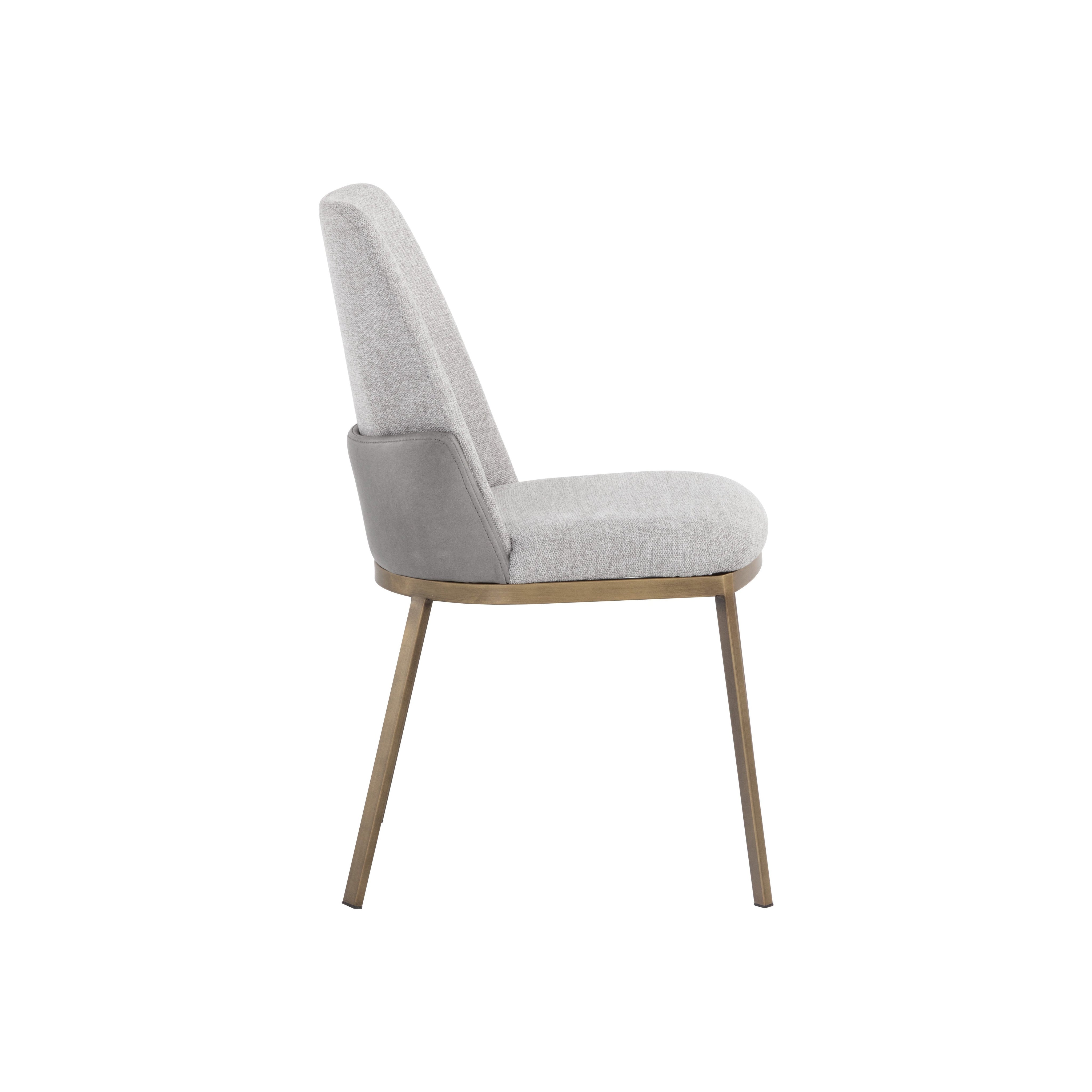 Make a bold statement with this modern dining chair that is full of luxe details. Stocked in belfast heather grey fabric with accenting on the back in bravo metal faux leather. Finished with brushed steel legs in antique brass.
