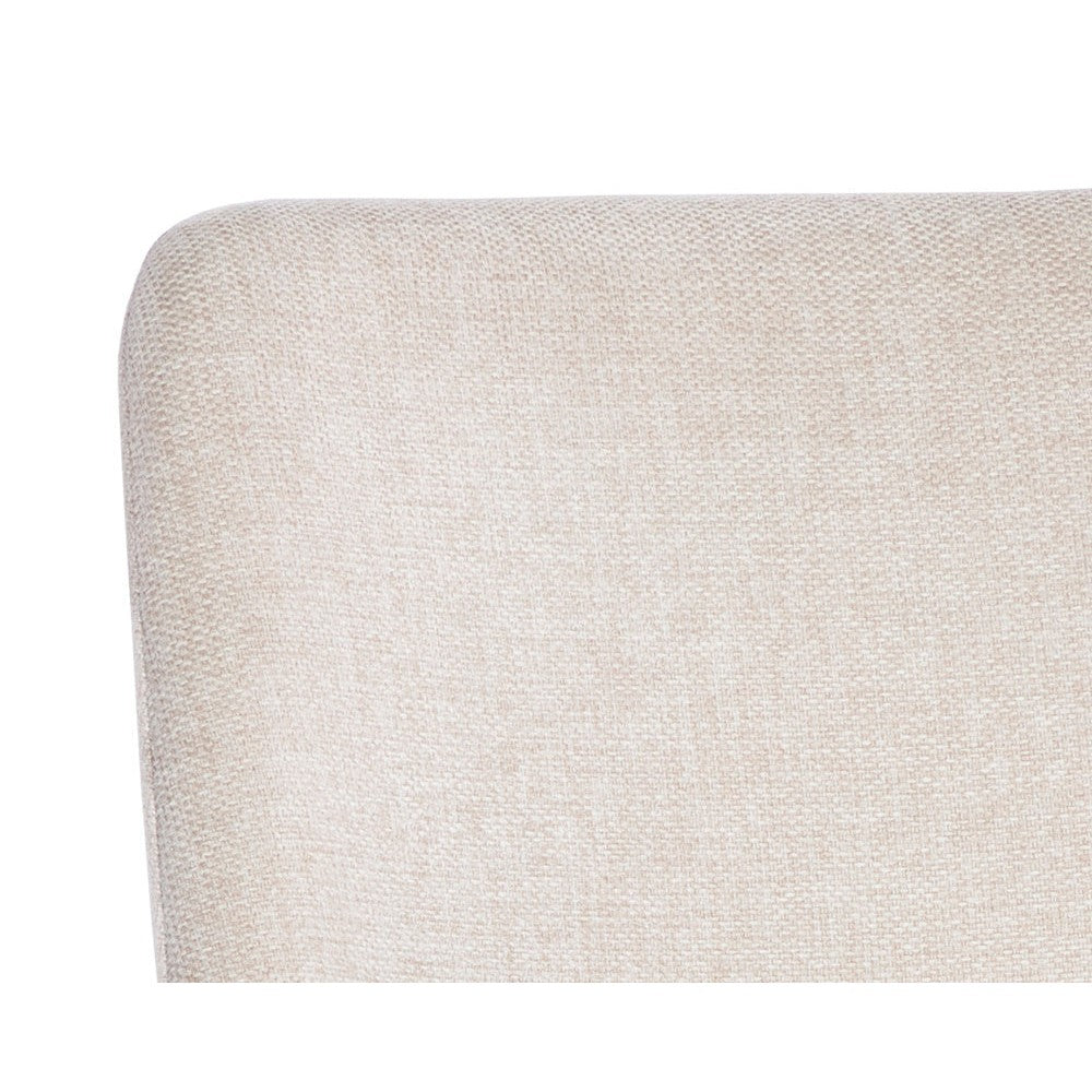 Make a bold statement with this modern dining chair that is full of luxe details. Stocked in belfast oatmeal fabric with accenting on the back in bravo cognac faux leather. Finished with brushed steel legs in antique brass.