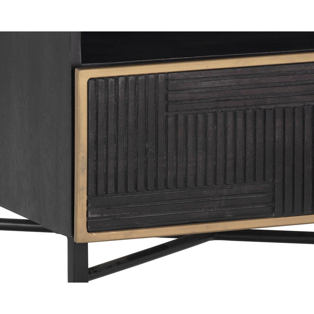 Influenced by global travels, skilled artisans use intricate woodworking techniques to bring the Markwood nightstand to life. The eye-catching dark brown mango wood and antique brass frame result in a modern look. Features shelving and a drawer for ample storage.
