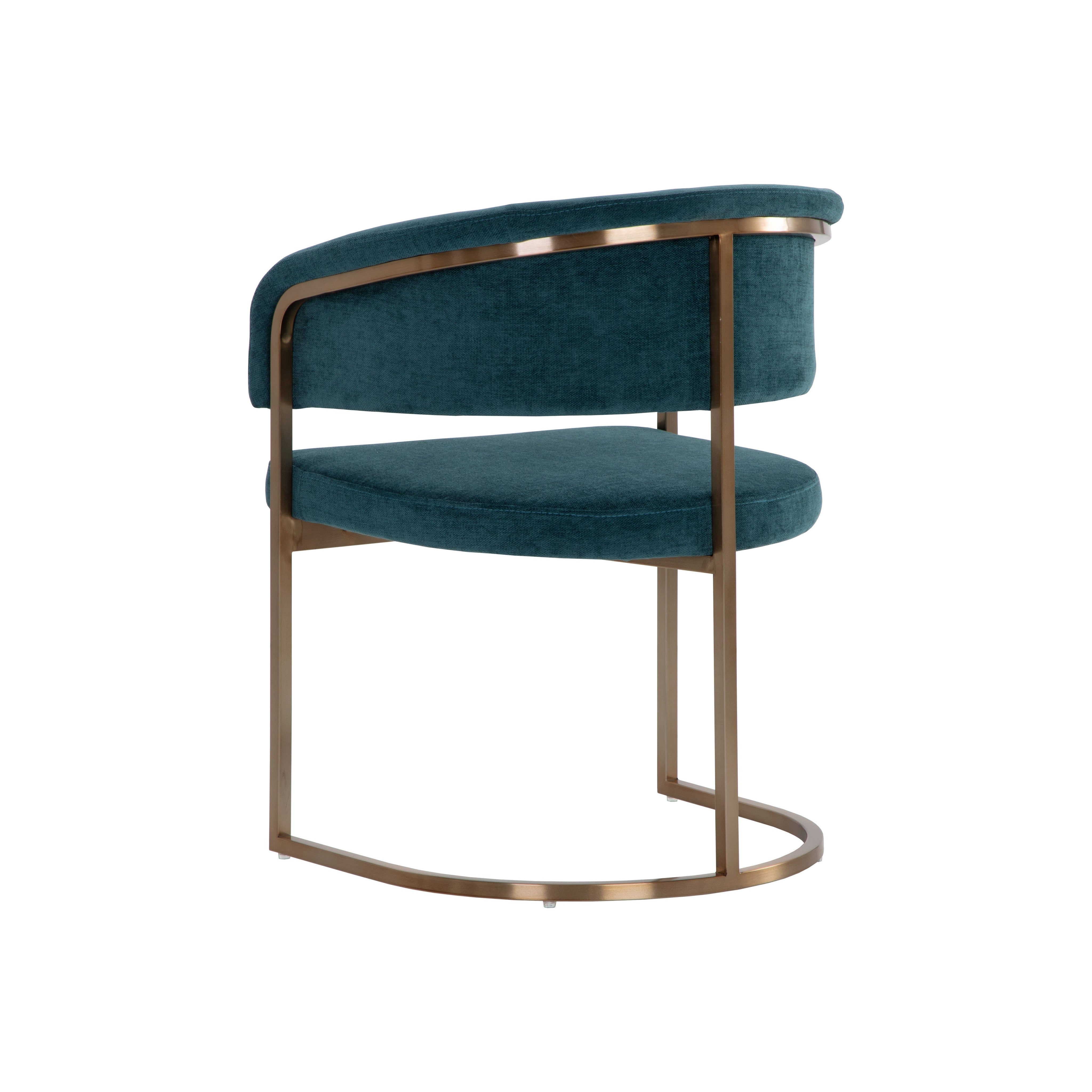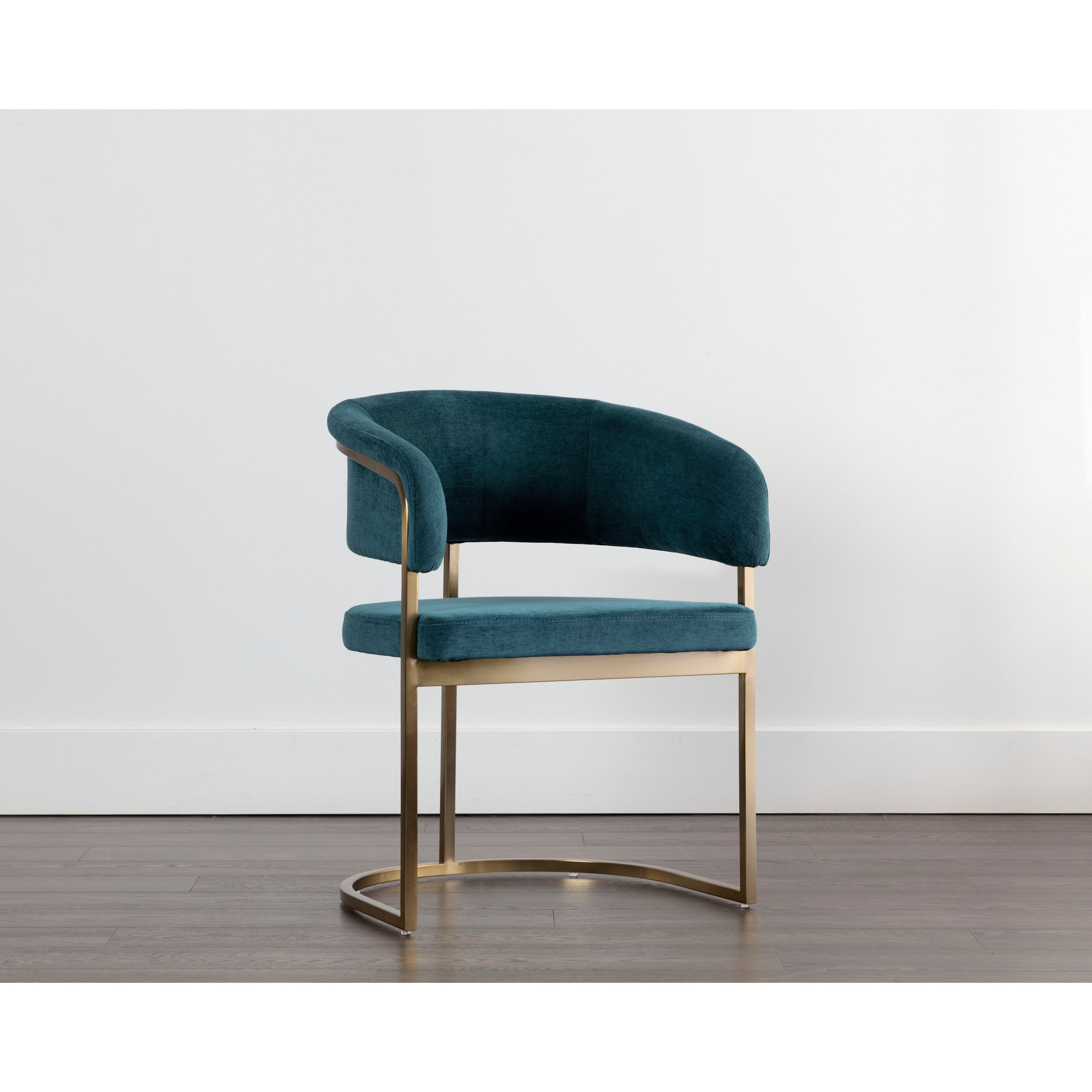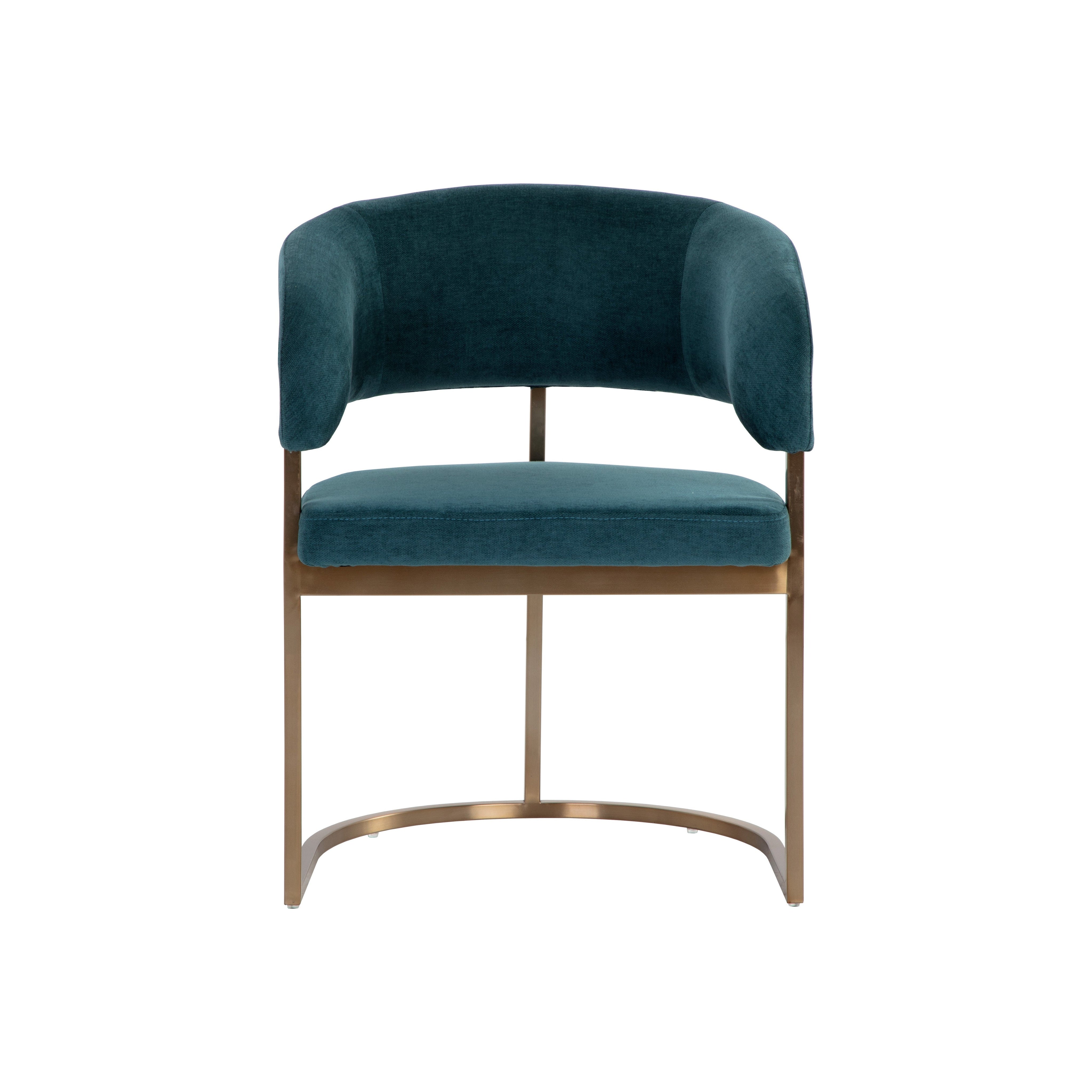 Uniting the beauty of sleek modern design with timeless elegance, the Marris Dining Armchair is a great addition to any dining space. Stocked in danny teal fabric and completed with a cantilever frame in a gold stainless steel finish.