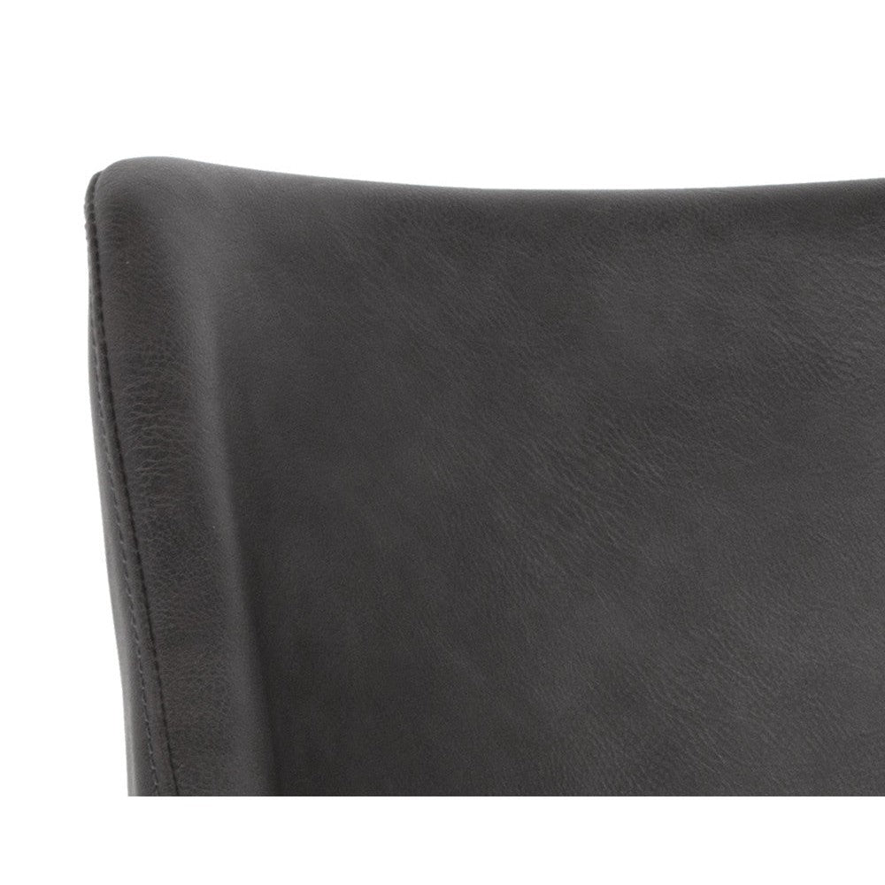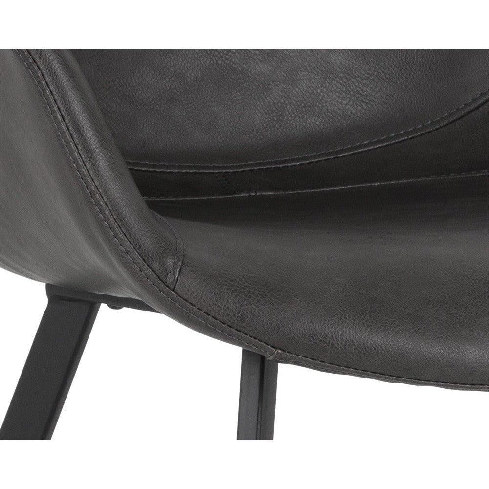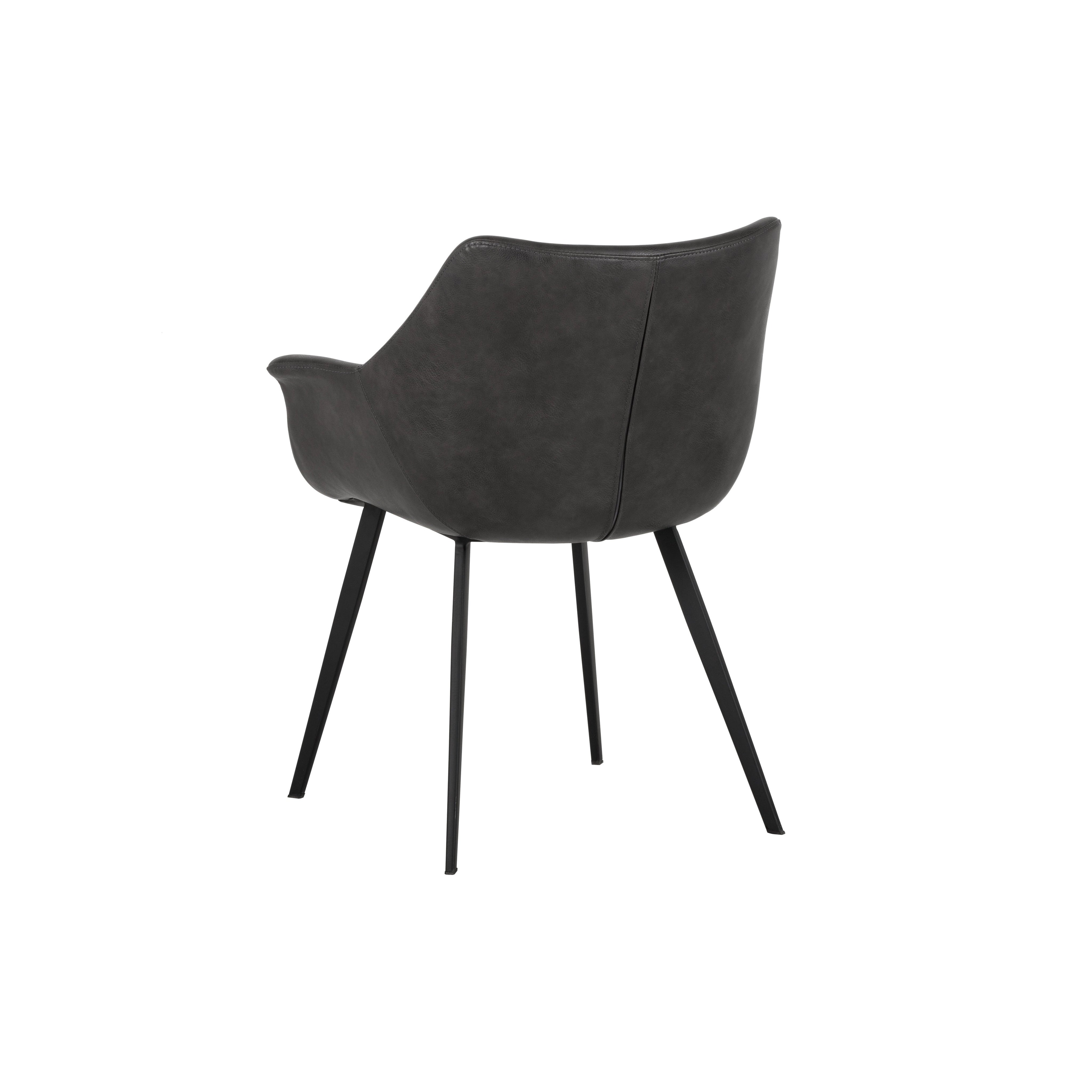 A sculpted yet comfortable dining armchair suitable for smaller urban spaces. This eye-catching design features a hearthstone brown or town grey faux leather seat with black powder-coated iron legs. Handle With Care: This design has been crafted with faux leather. Faux leather is manufactured to reflect the natural characteristics of leather; as such, colour variations, markings, wrinkles, grooves, and light scratches are appreciated characteristics. No two pieces will be alike. Visit our Product Care page for more information on how to ensure the lasting beauty of this piece.