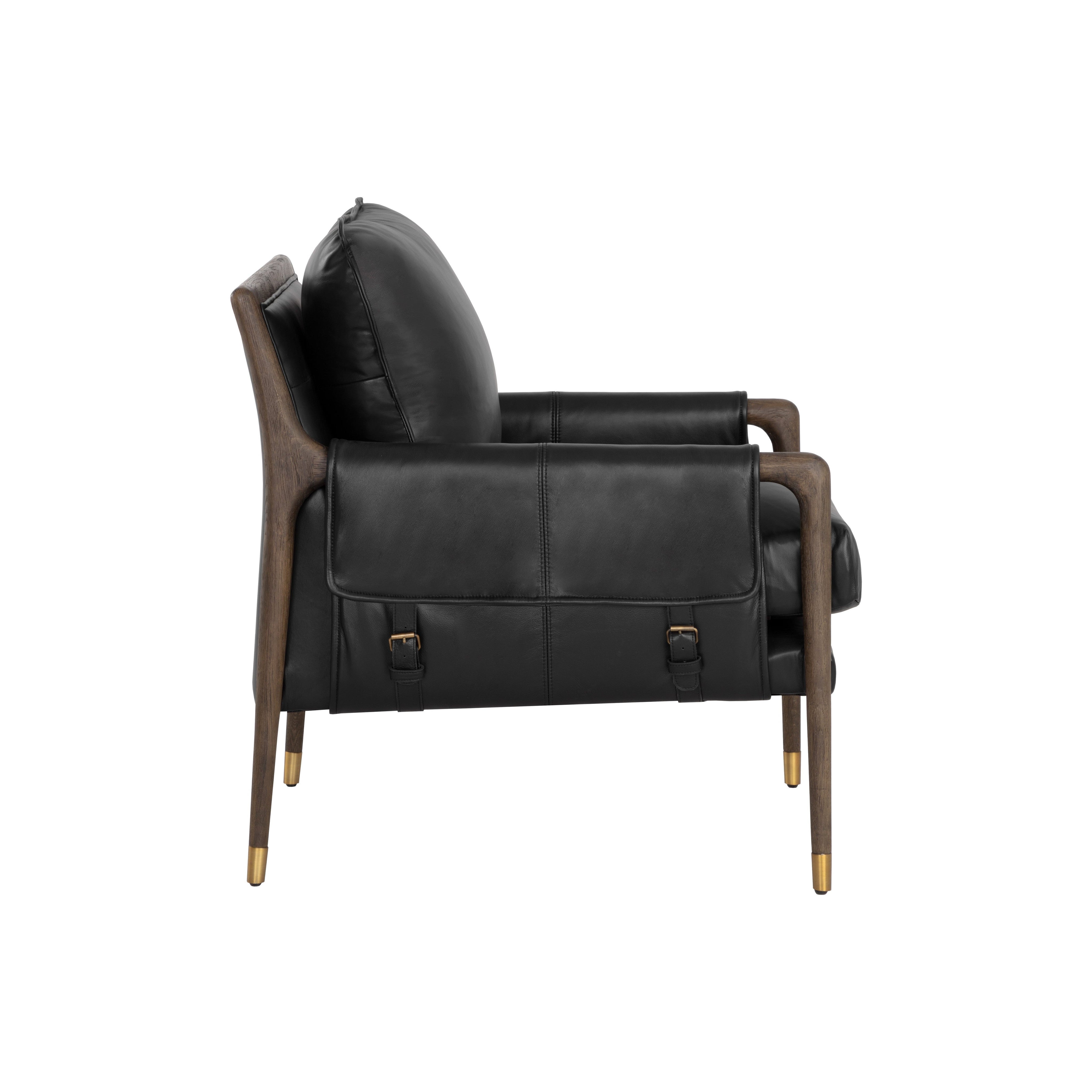 With influence from vintage design, this lounge chair evokes a charming and rustic mid-century appeal. Upholstered in cortina black leather with dual buckle flap detailing on the armrests. Completed with a distressed brown solid oak wood frame with gold finished metal foot caps. Handle with Care: This design has been crafted with 100% top grain leather. Leather is a natural material; as such, colour variations, markings, wrinkles, grooves and light scratches are acceptable and appreciated characteristics. No two pieces are alike. Visit our Product Care page for more information on how to ensure the lasting beauty of this piece. As wood is an organic, porous material, these pieces will contain natural variation of texture and may also exhibit fine indentations and cracks. Wood pieces will also display a disparity of colour and grain, and visible knots and burls that add to the character of each piece.