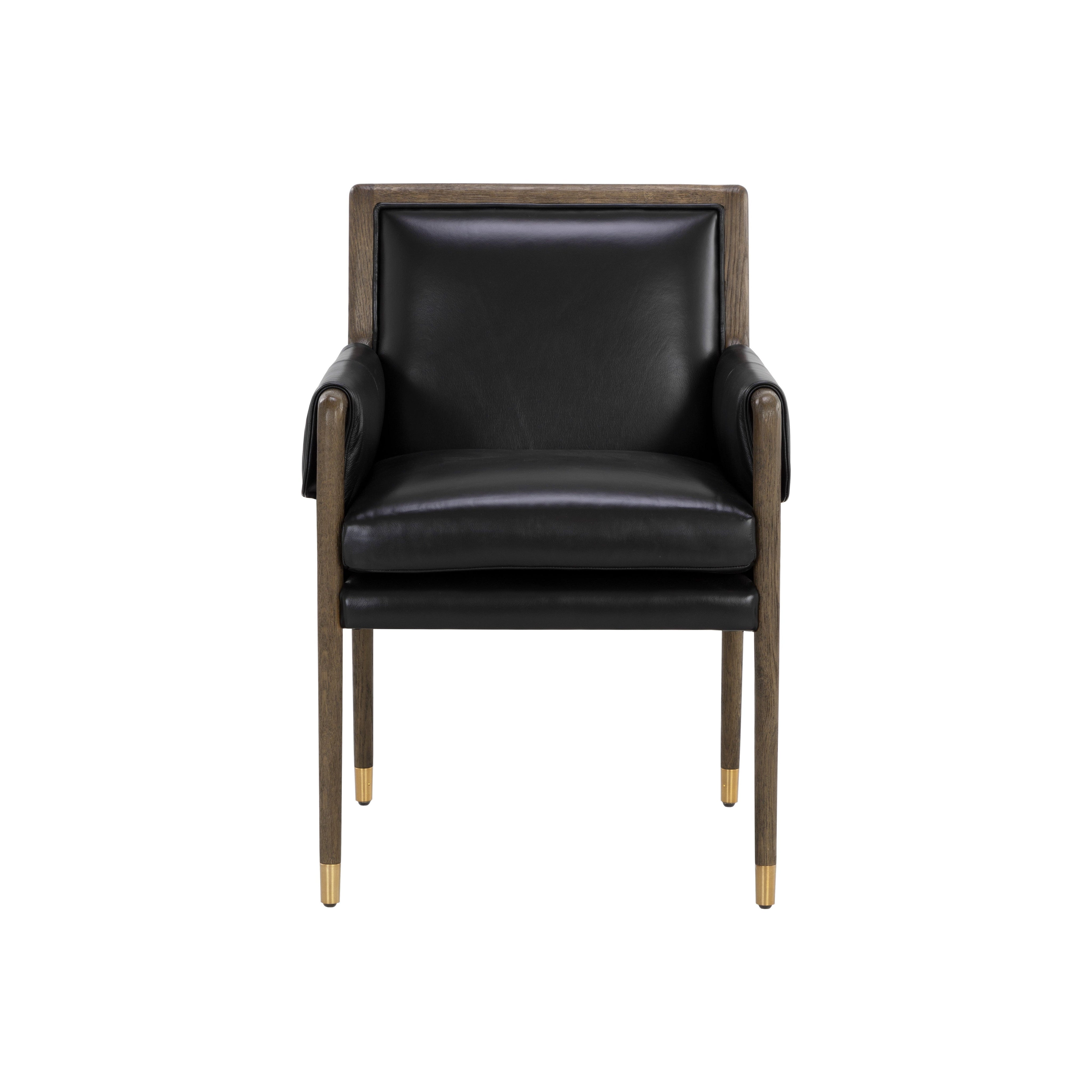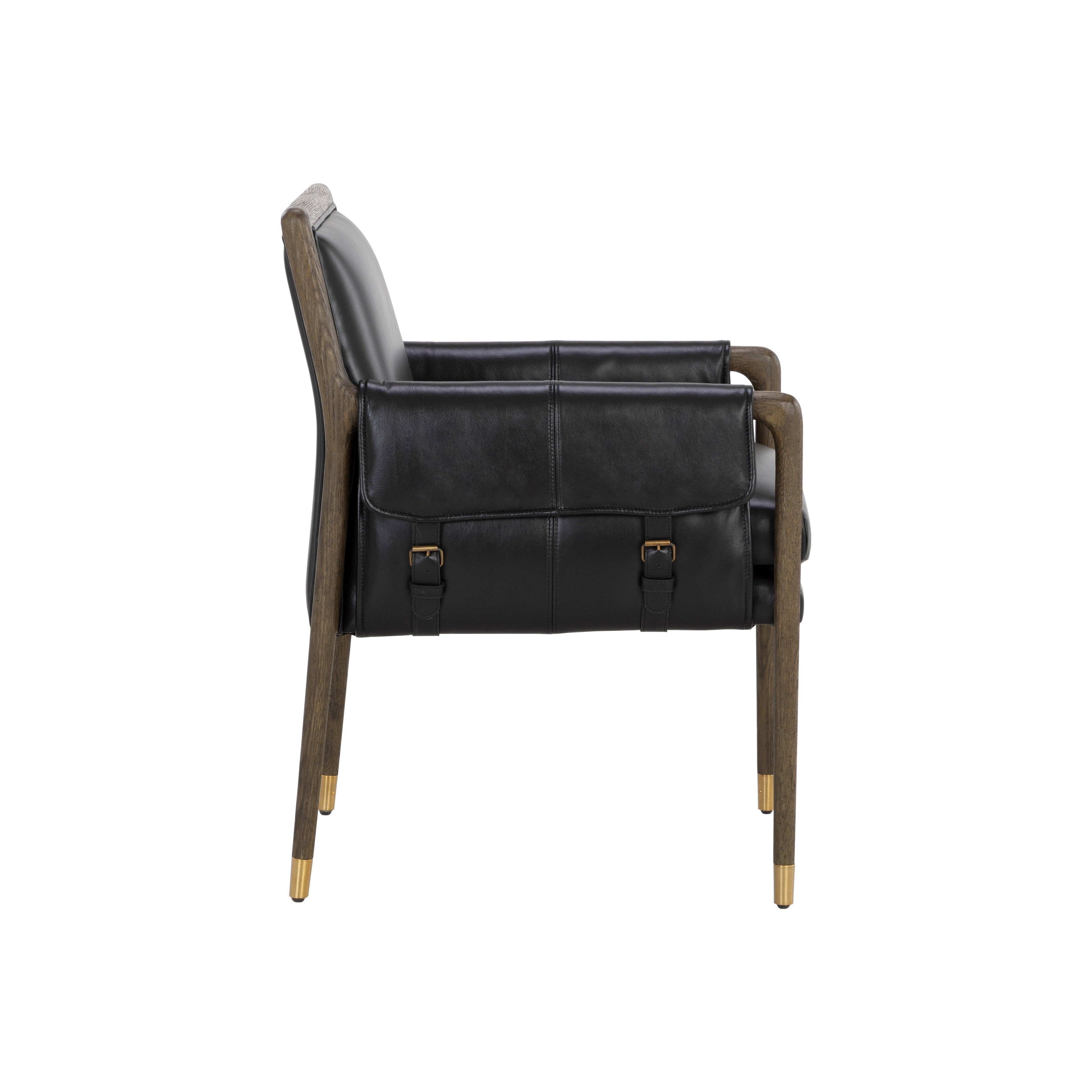 With influence from vintage design, the Mauti Dining Armchair evokes a charming and rustic mid-century appeal. Upholstered in cortina black leather with dual buckle flap detailing on the armrests. Completed with a distressed brown solid oak wood frame with brushed gold metal foot caps. Handle with Care: This design has been crafted with 100% top grain leather. Leather is a natural material; as such, colour variations, markings, wrinkles, grooves and light scratches are acceptable and appreciated characteristics. No two pieces are alike. Visit our Product Care page for more information on how to ensure the lasting beauty of this piece. As wood is an organic, porous material, these pieces will contain natural variation of texture and may also exhibit fine indentations and cracks. Wood pieces will also display a disparity of colour and grain, and visible knots and burls that add to the character of each piece.