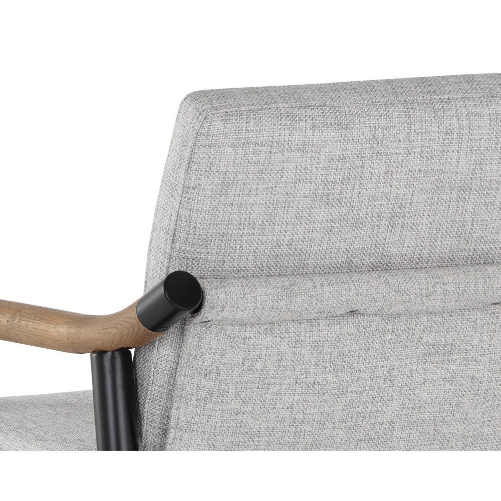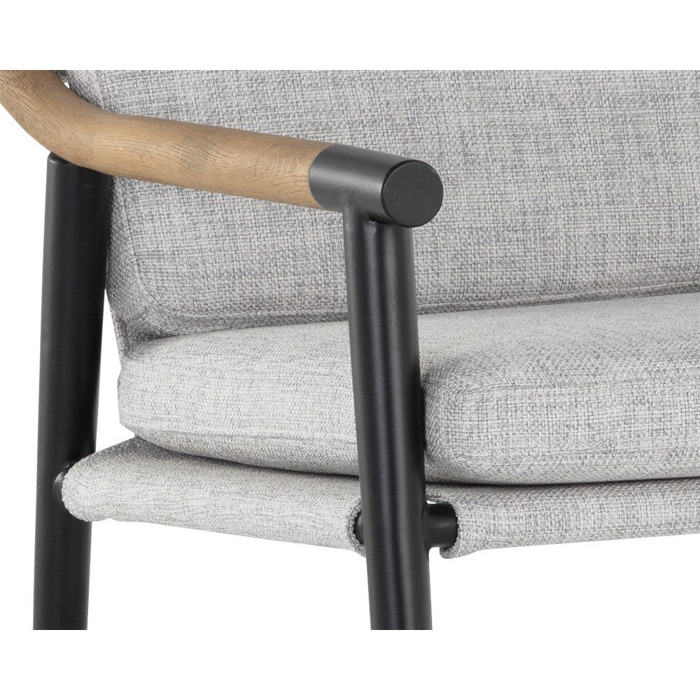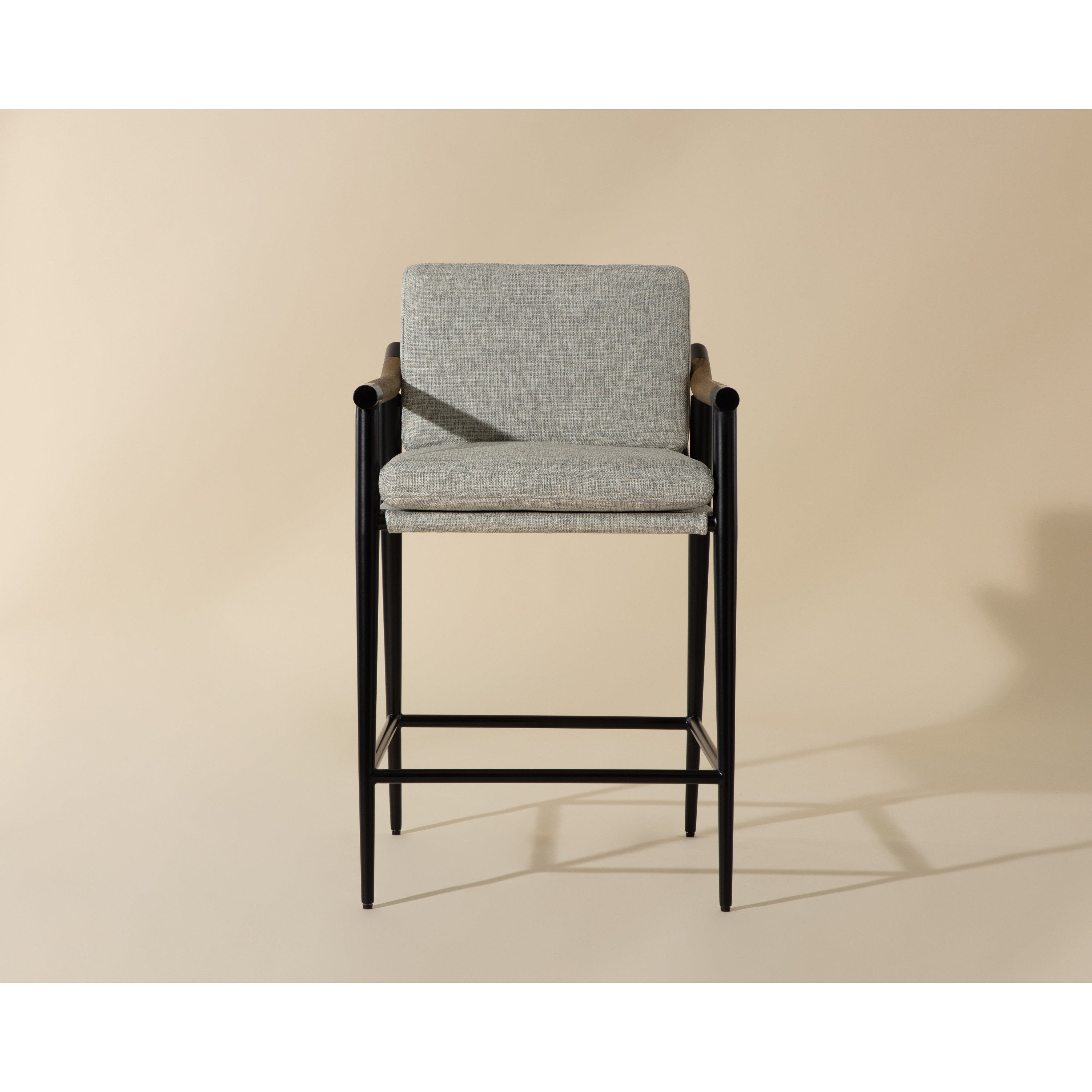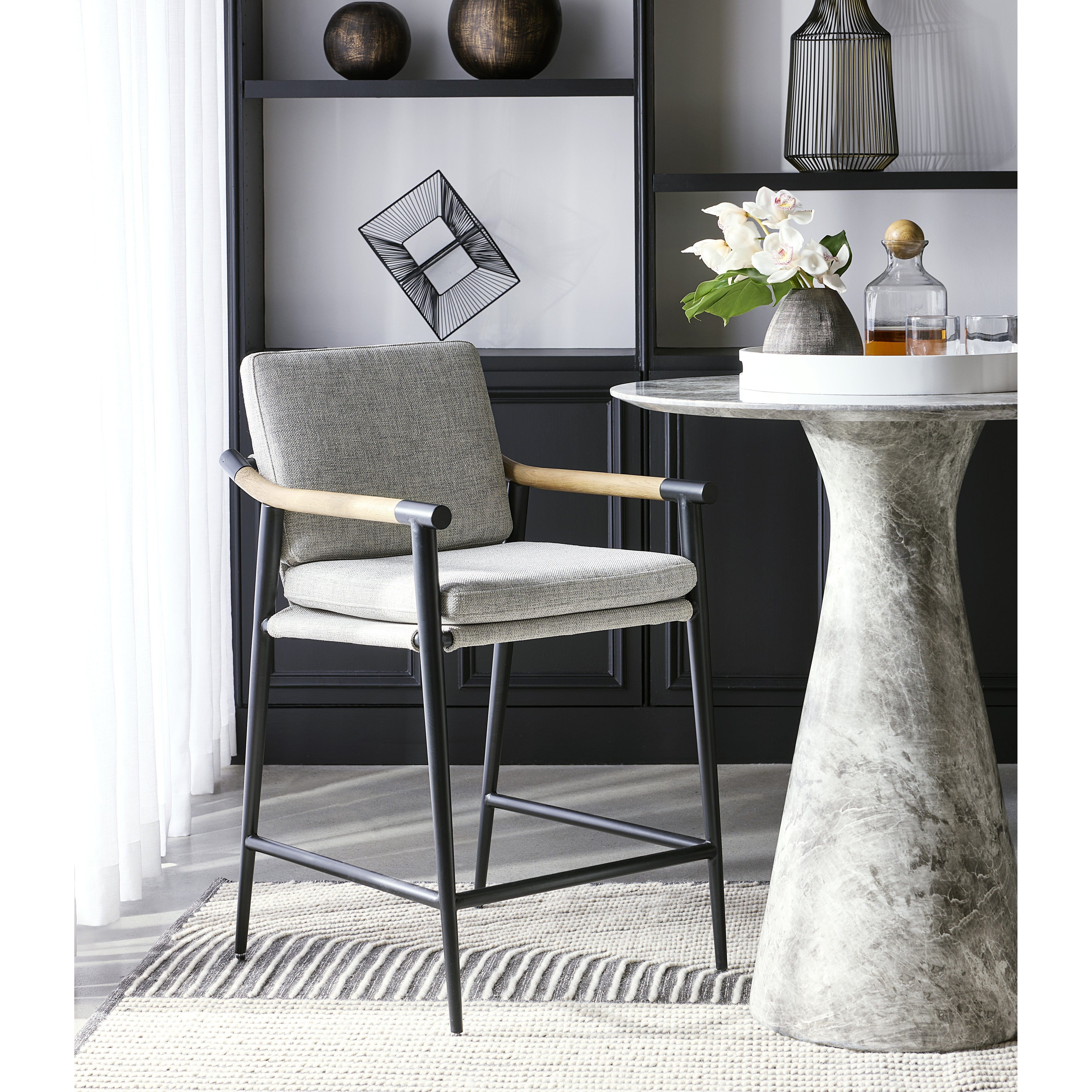 Functional with a timeless design, this mid-century style counter stool offers a clean silhouette that will suit any space. Stocked in vault fog fabric with solid oak wood armrests. Completed with a black iron frame. Performance fabric is moisture repellent, durable and easy to clean. As wood is an organic, porous material, these pieces will contain natural variations of texture and may also exhibit fine indentations and cracks. Wood pieces will also display a disparity of colour and grain, and visible knots and burls that add to the character of each piece.