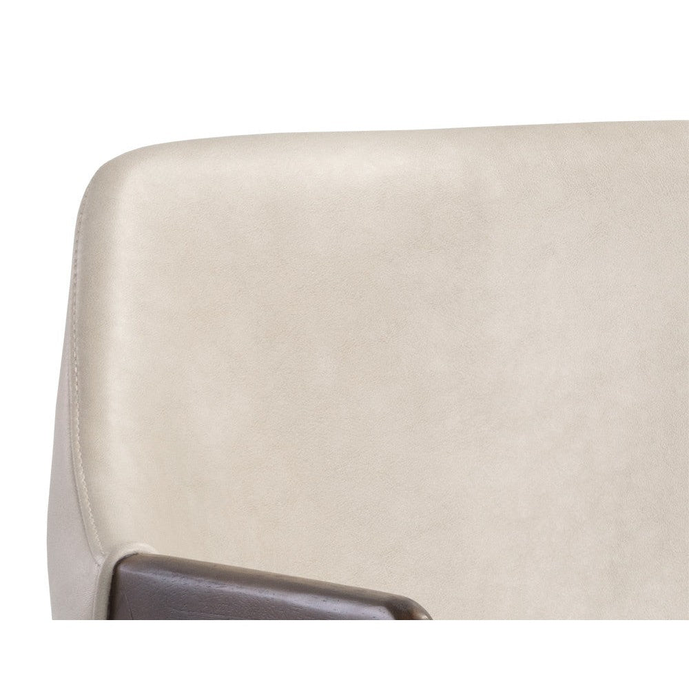 This mid-century modern dining chair combines luxury and warmth. Stocked in bravo cream faux leather with an exposed solid rubber wood frame and antique brass stretchers. Handle With Care: This design has been crafted with faux leather. Faux leather is manufactured to reflect the natural characteristics of leather; as such, colour variations, markings, wrinkles, grooves, and light scratches are appreciated characteristics. No two pieces will be alike. Visit our Product Care page for more information on how to ensure the lasting beauty of this piece