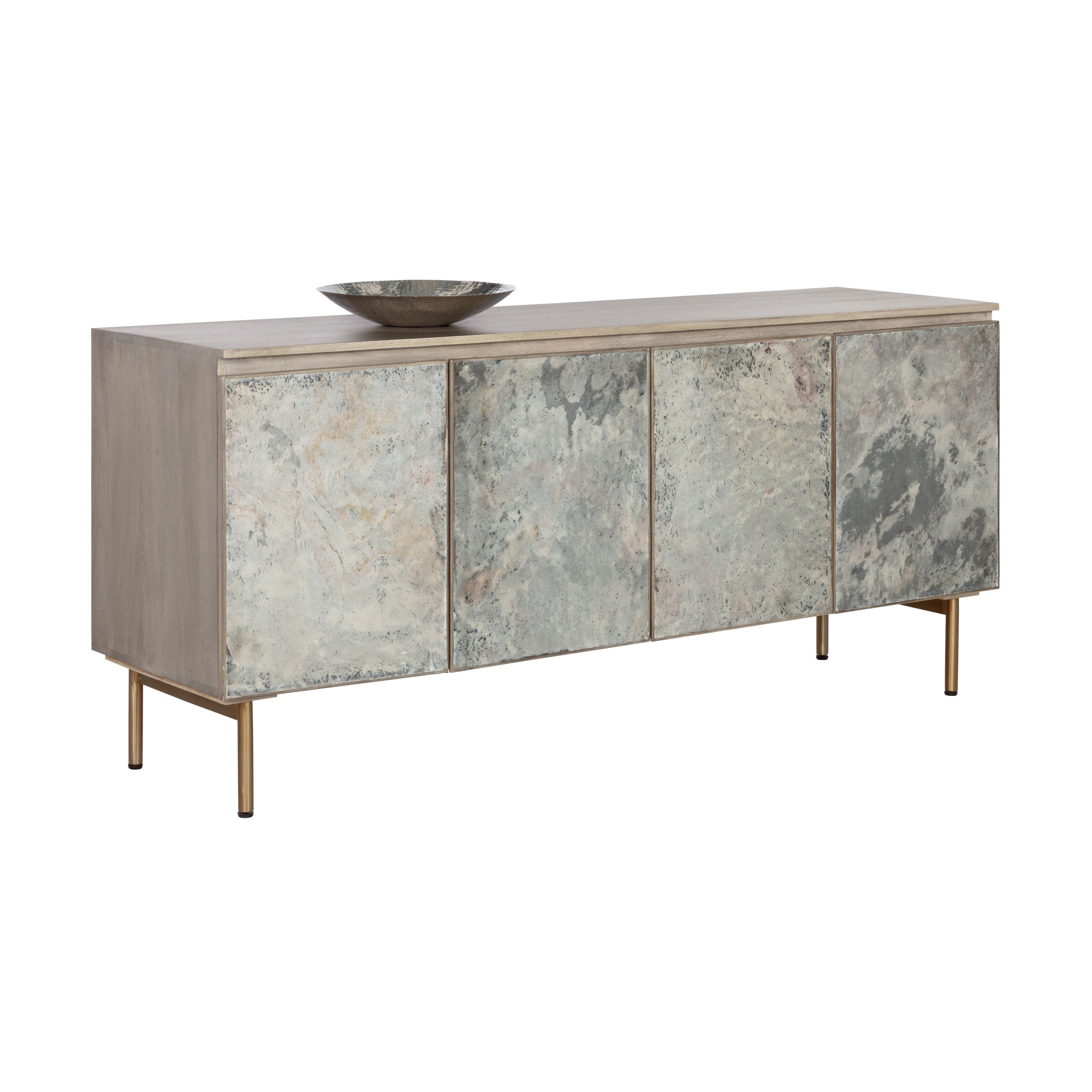 Rich with texture, this unique sideboard illustrates the beauty of mixed materials coming together in harmony. Features a grey solid mango wood frame with slate veneer on the door fronts. Completed with stainless steel legs in a brass finish. Made in India: with refined craftsmanship, this design was brought to life by skilled local artisans. By nature, these materials develop unique imperfections such as fissures, markings and colour variations for a truly one-of-a-kind piece. As wood is an organic, porous material, these pieces will contain natural variation of texture and may also exhibit fine indentations and cracks. Wood pieces will also display a disparity of colour and grain, and visible knots and burls that add to the character of each piece. Due to the organic material on the cabinet doors, variations in colour may occur on actual product.