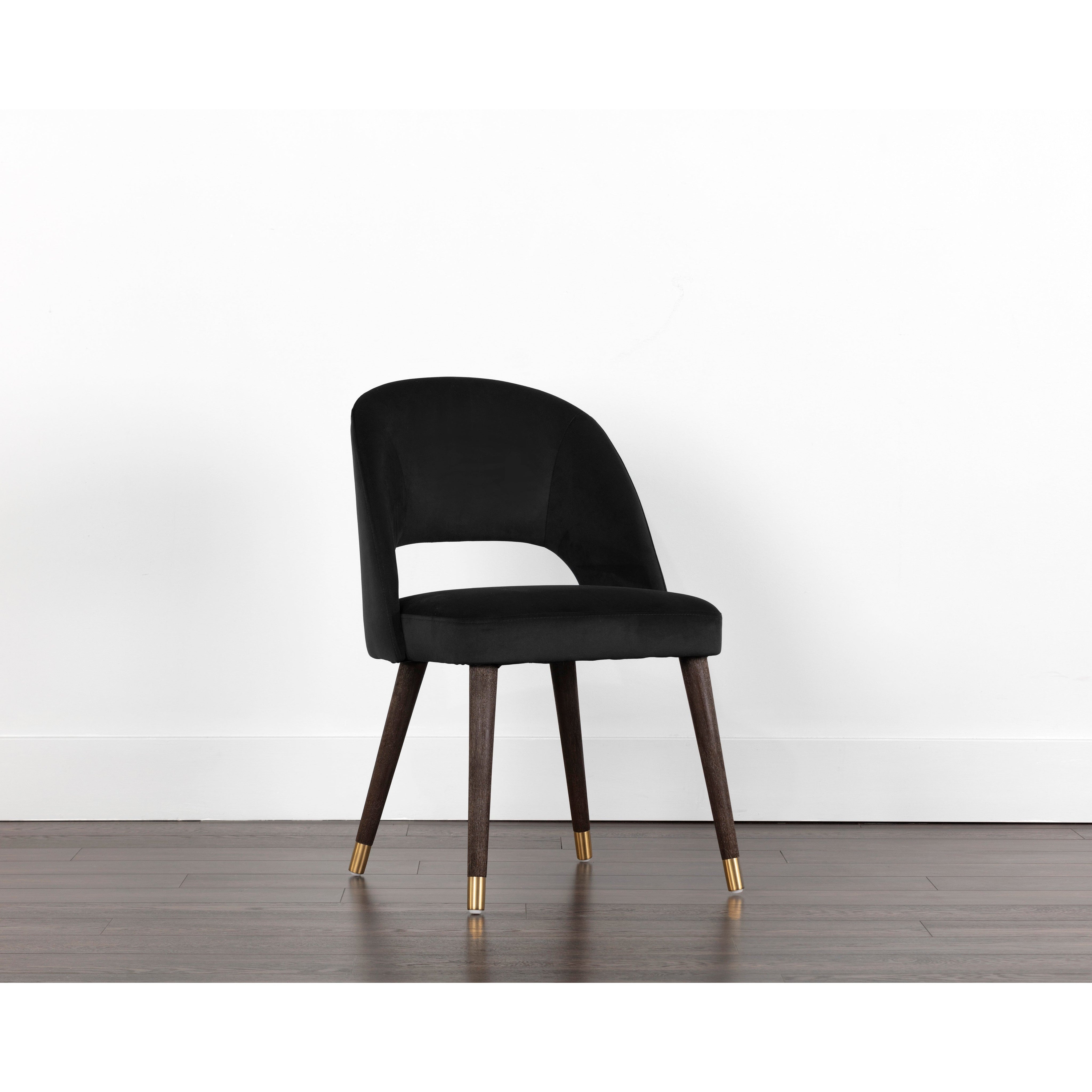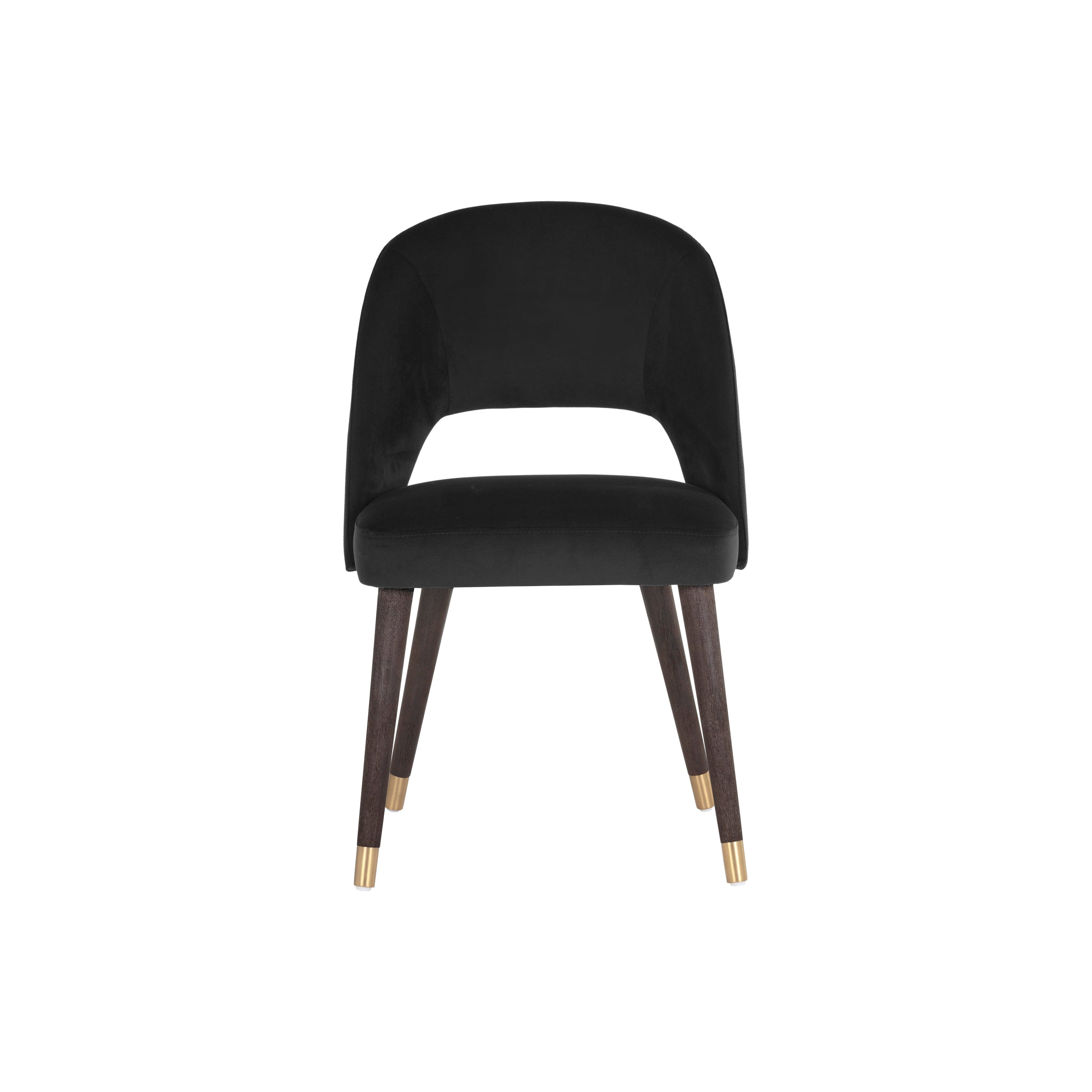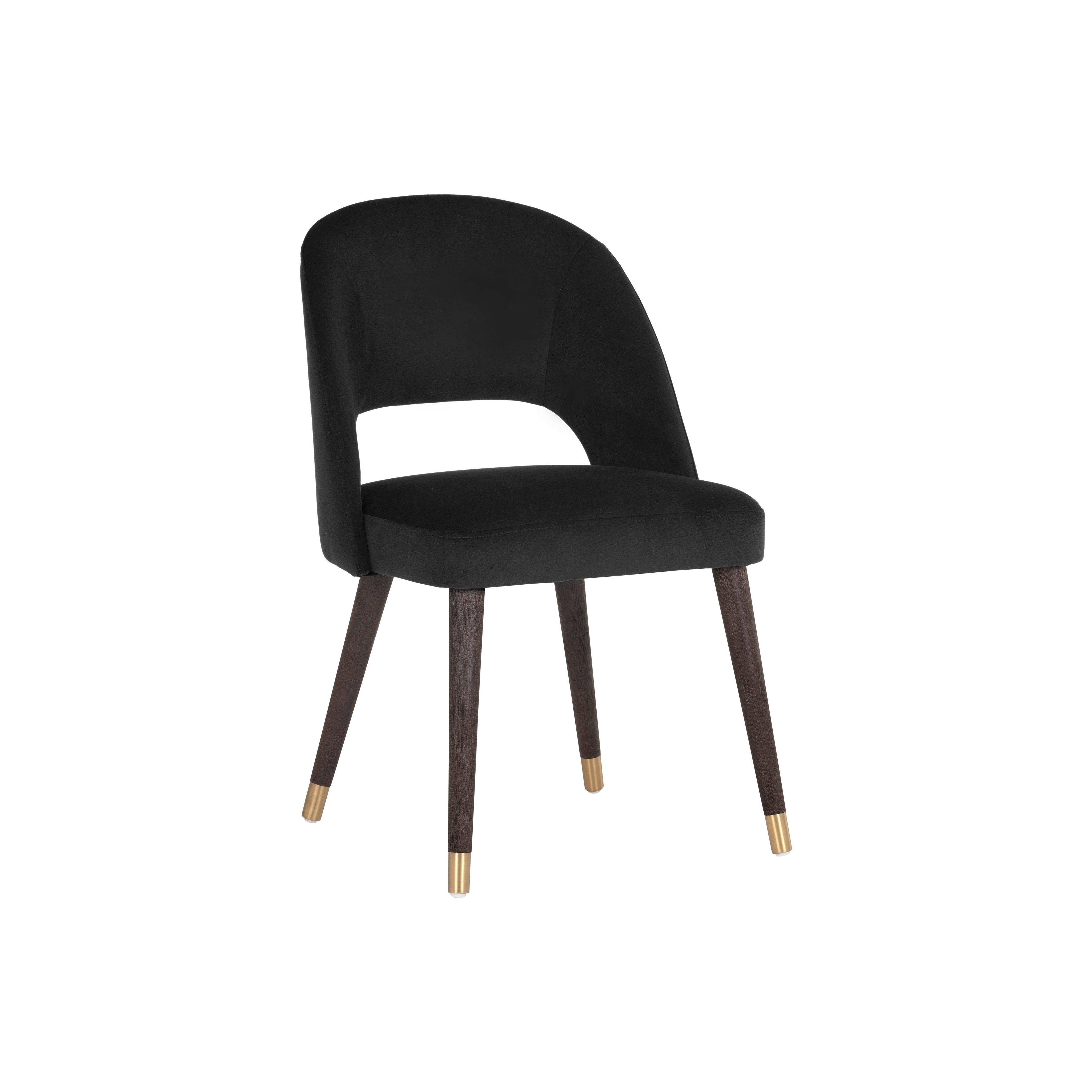 A chic barrel back dining chair with vintage influence. Crafted with abbington black fabric and finished with brown birch wood legs and antique brass caps. Suitable for various dining and kitchen spaces of all sizes.