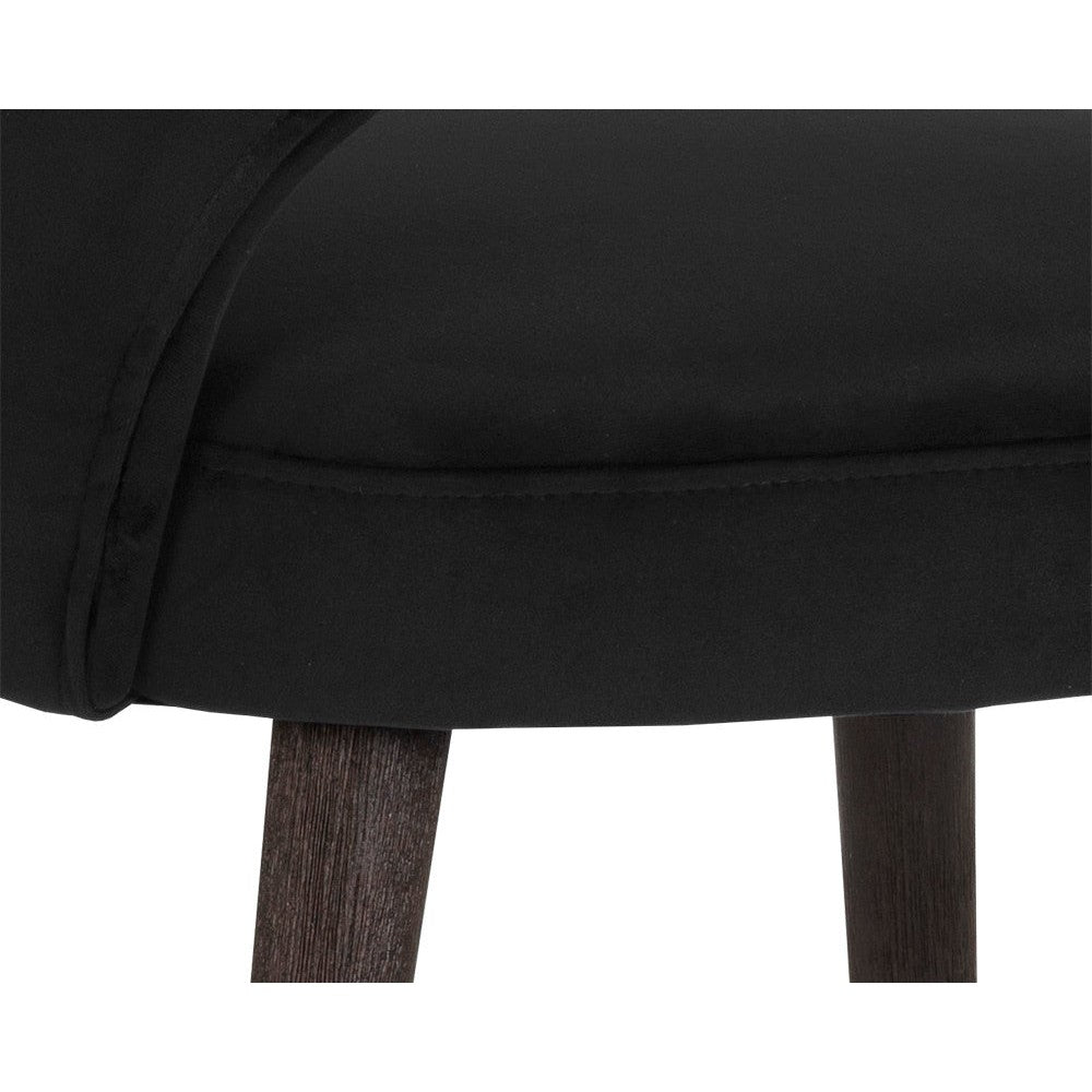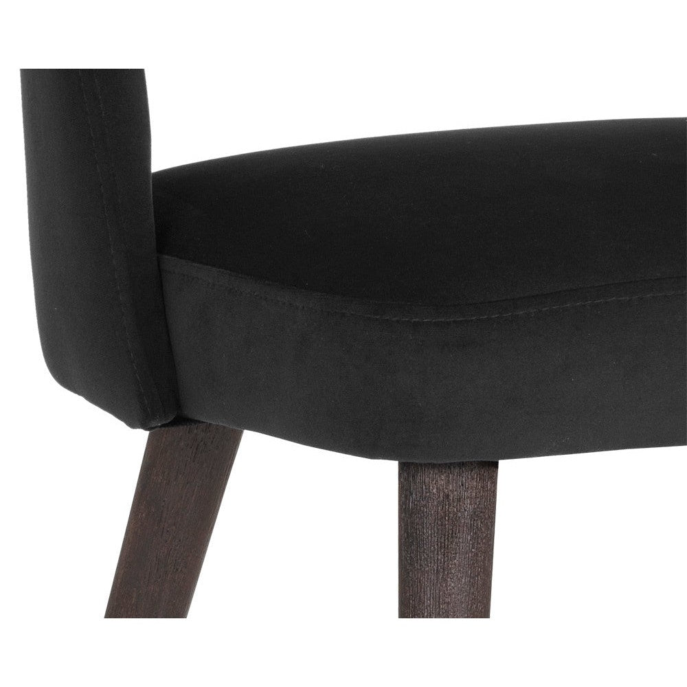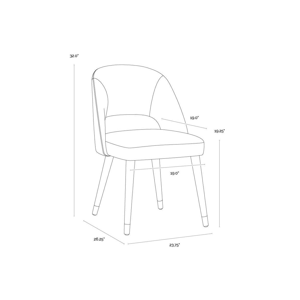 A chic barrel back dining chair with vintage influence. Crafted with abbington black fabric and finished with brown birch wood legs and antique brass caps. Suitable for various dining and kitchen spaces of all sizes.