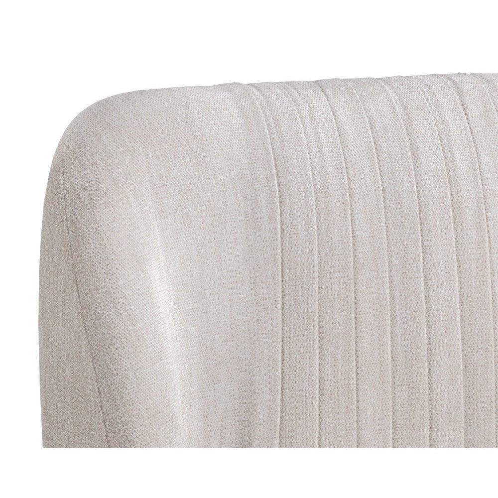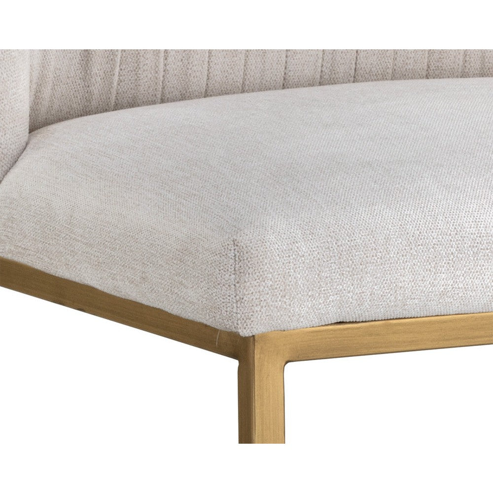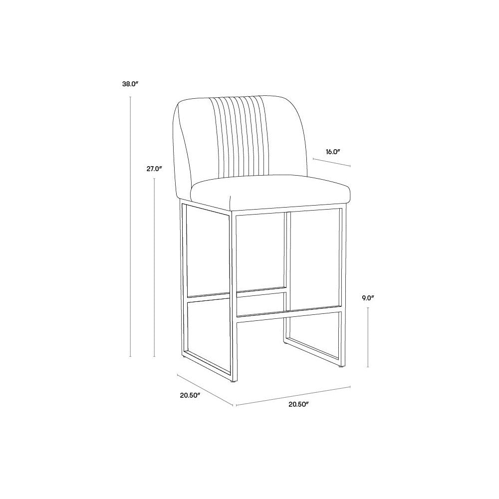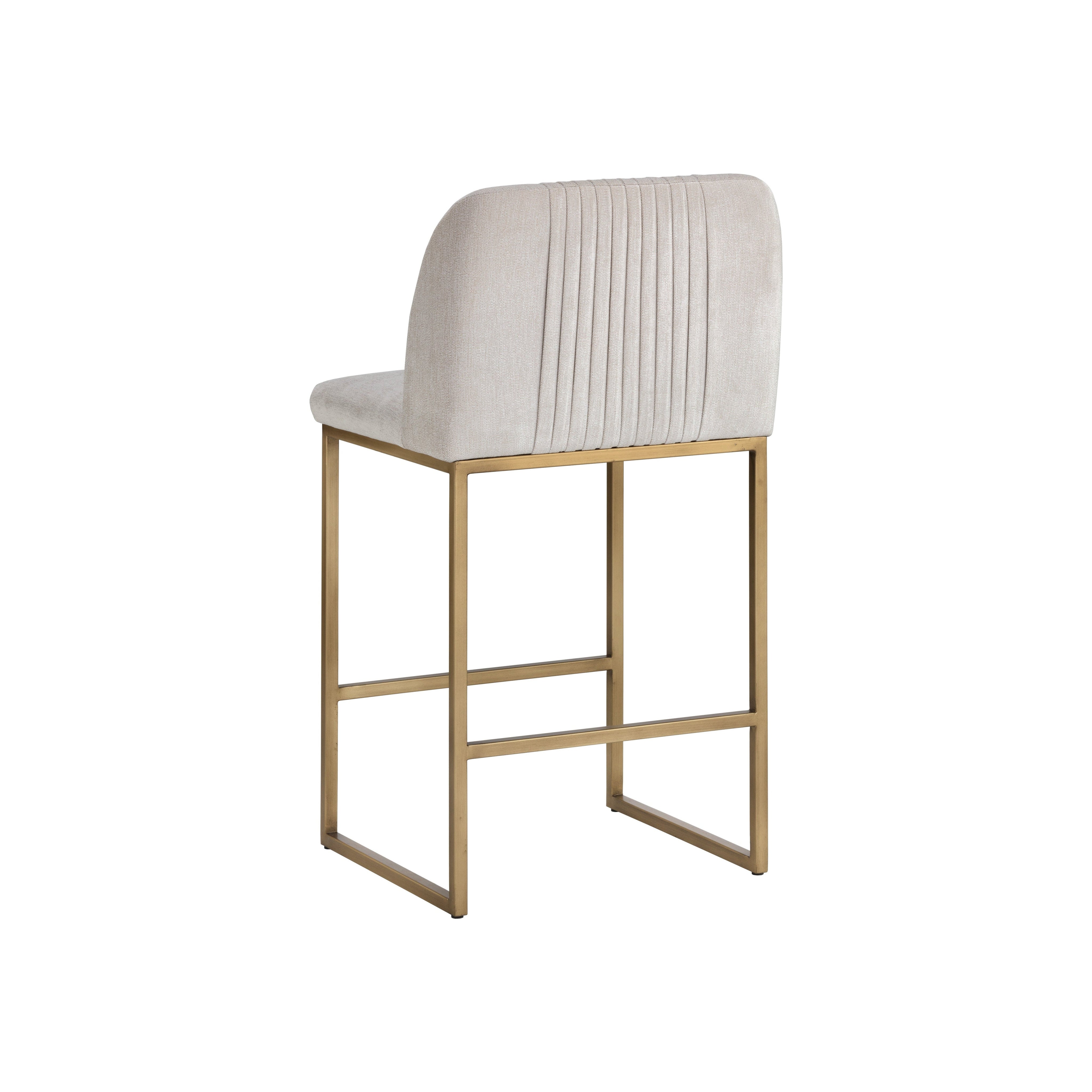 A modern counter stool that offers style and comfort. Features delicate ruching on the rounded seatback and exposed antique brass legs. Stocked in polo club muslin performance fabric. Performance fabric is moisture repellent, durable and easy to clean. Suitable for various dining, kitchen and bar spaces of all sizes.