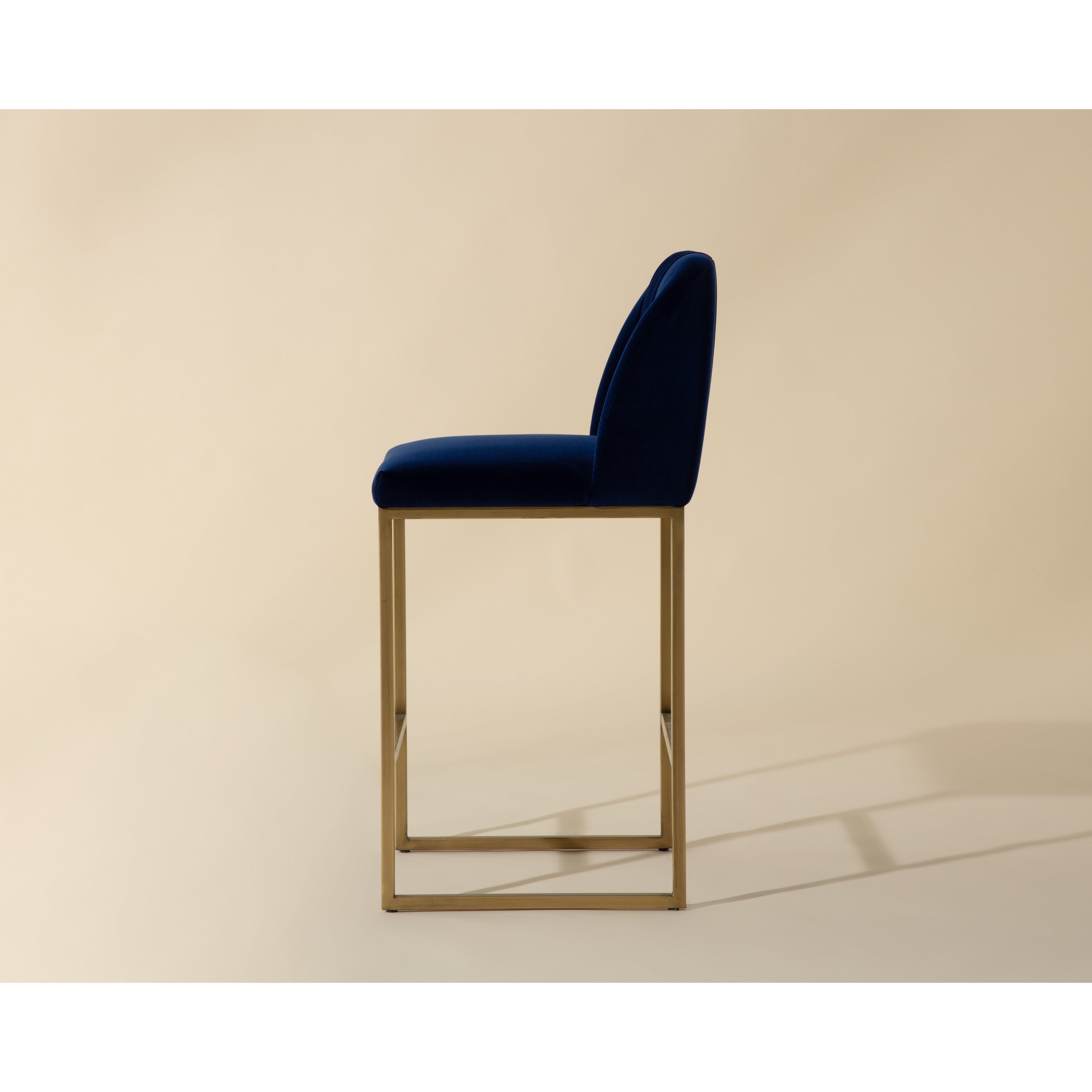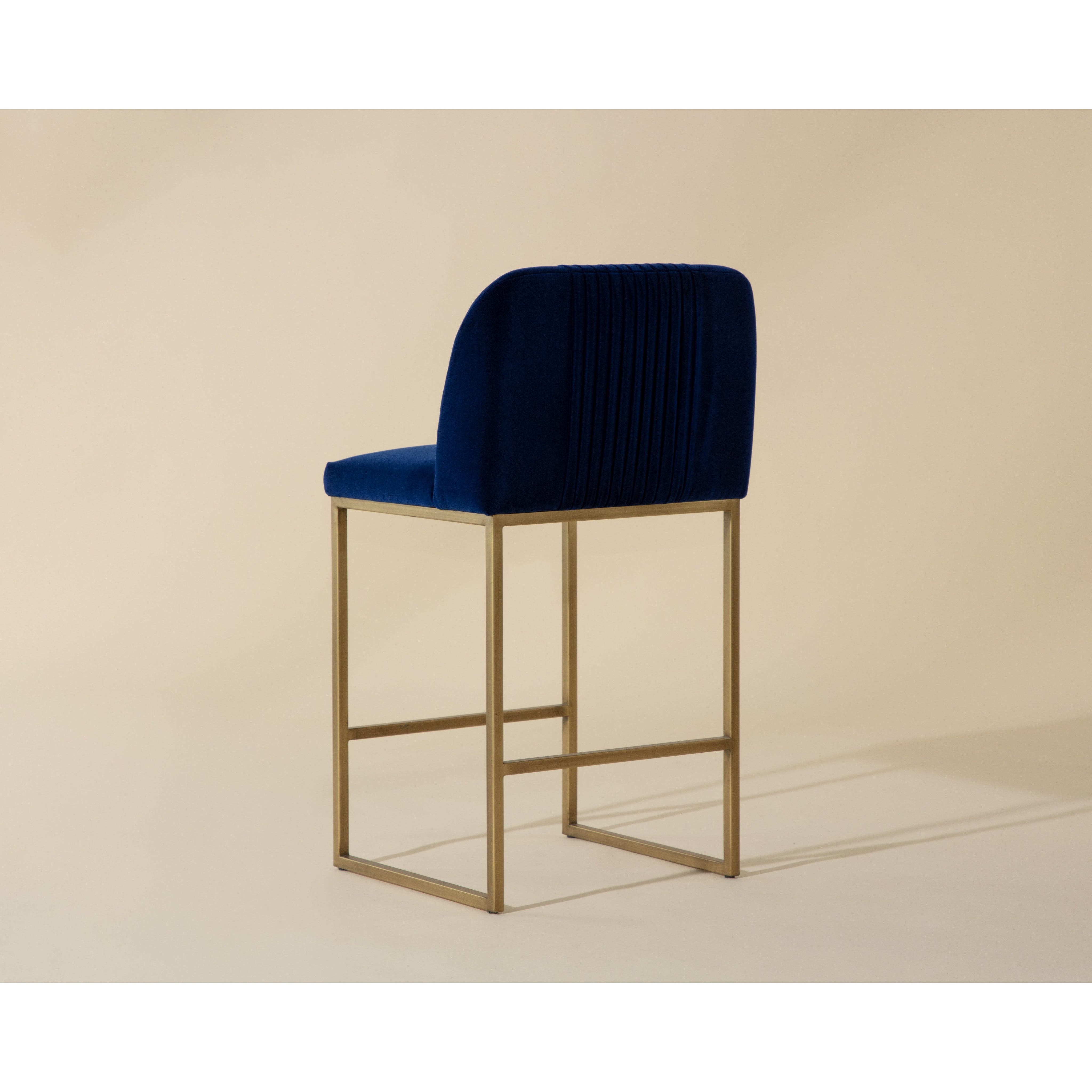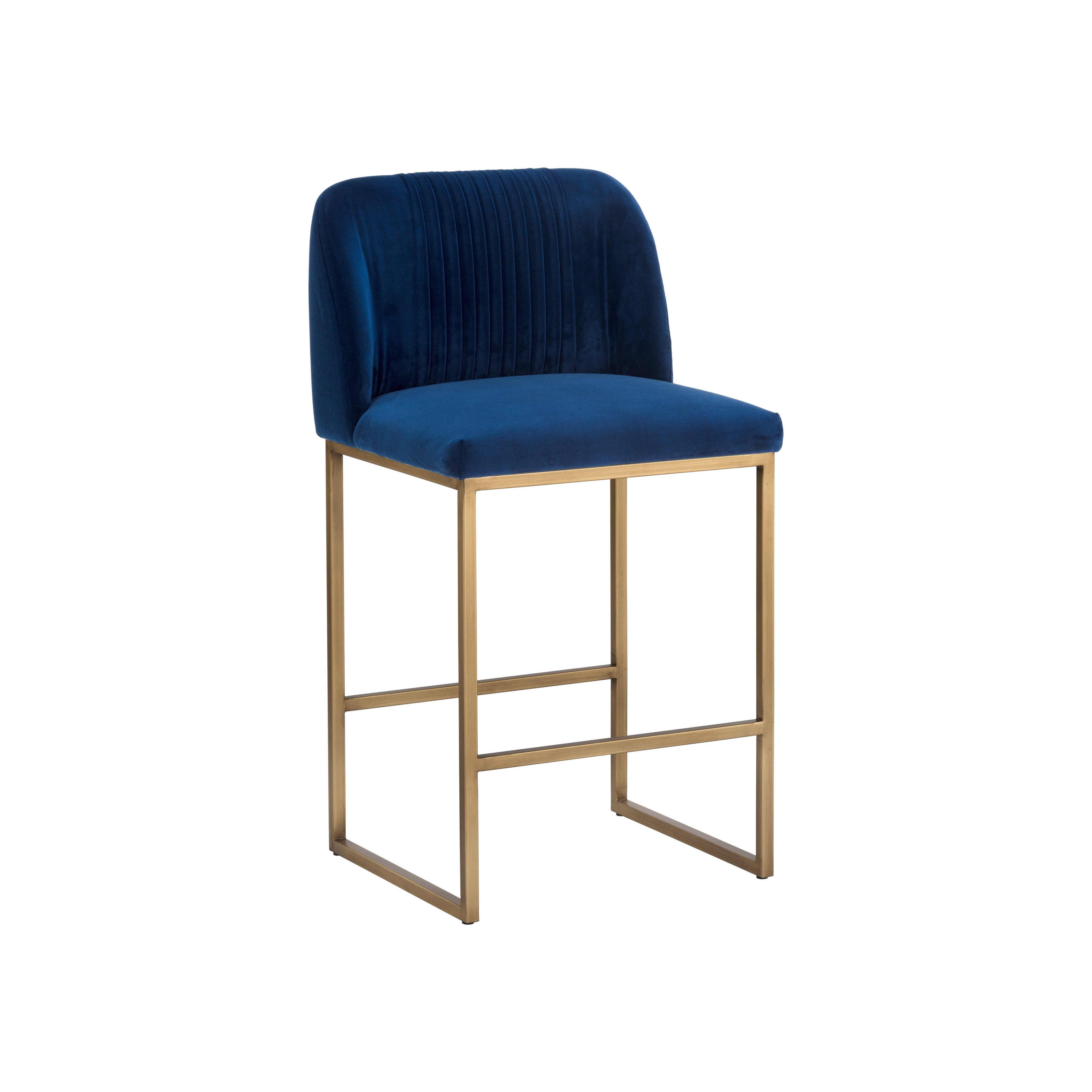 A modern counter stool that offers style and comfort. Features delicate ruching on the rounded seatback and exposed antique brass legs. Stocked in sapphire blue fabric. Suitable for various dining, kitchen and bar spaces of all sizes.