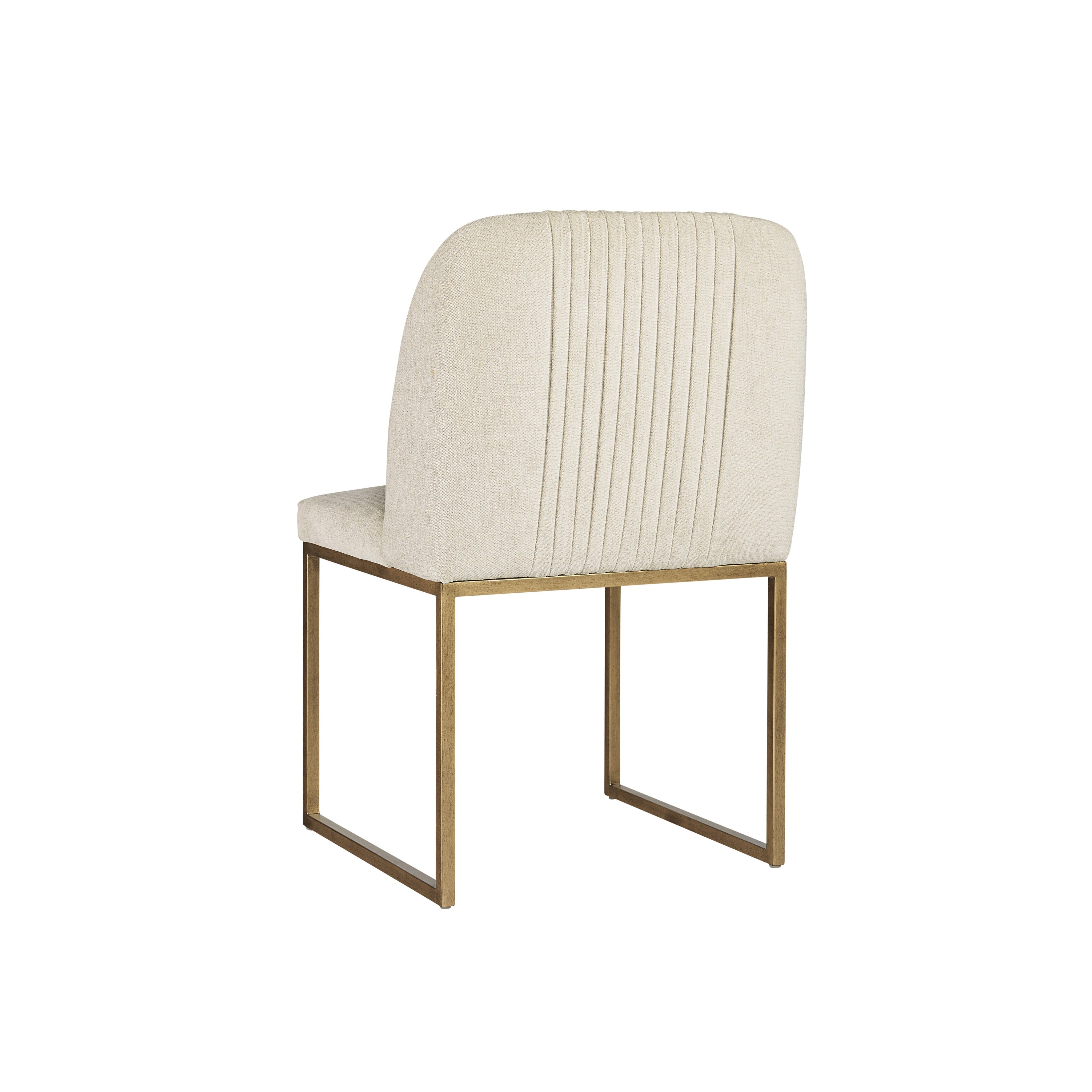 A modern dining chair that offers style and comfort. Features delicate ruching on the rounded seatback and exposed antique brass legs. Stocked in polo club muslin performance fabric. Performance fabric is moisture repellent, durable and easy to clean.