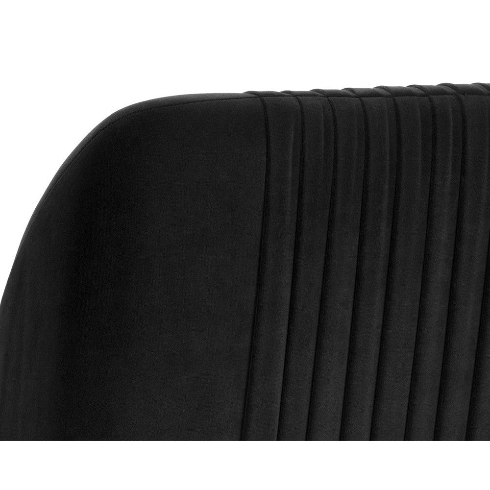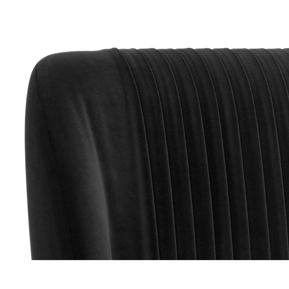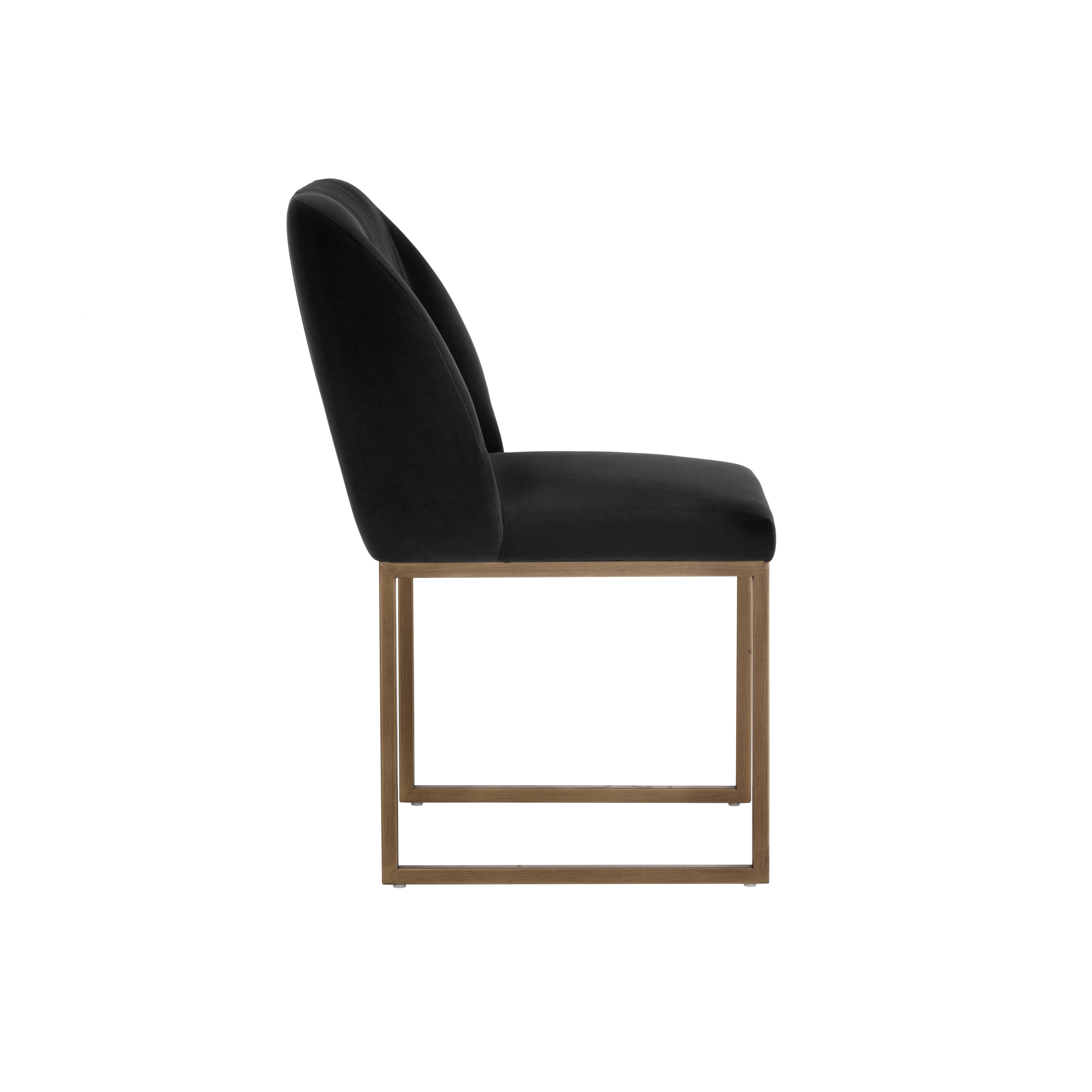 A transitional dining chair that offers style and comfort. Features delicate ruching on the rounded seatback and exposed antique brass legs. Stocked in shadow grey fabric.