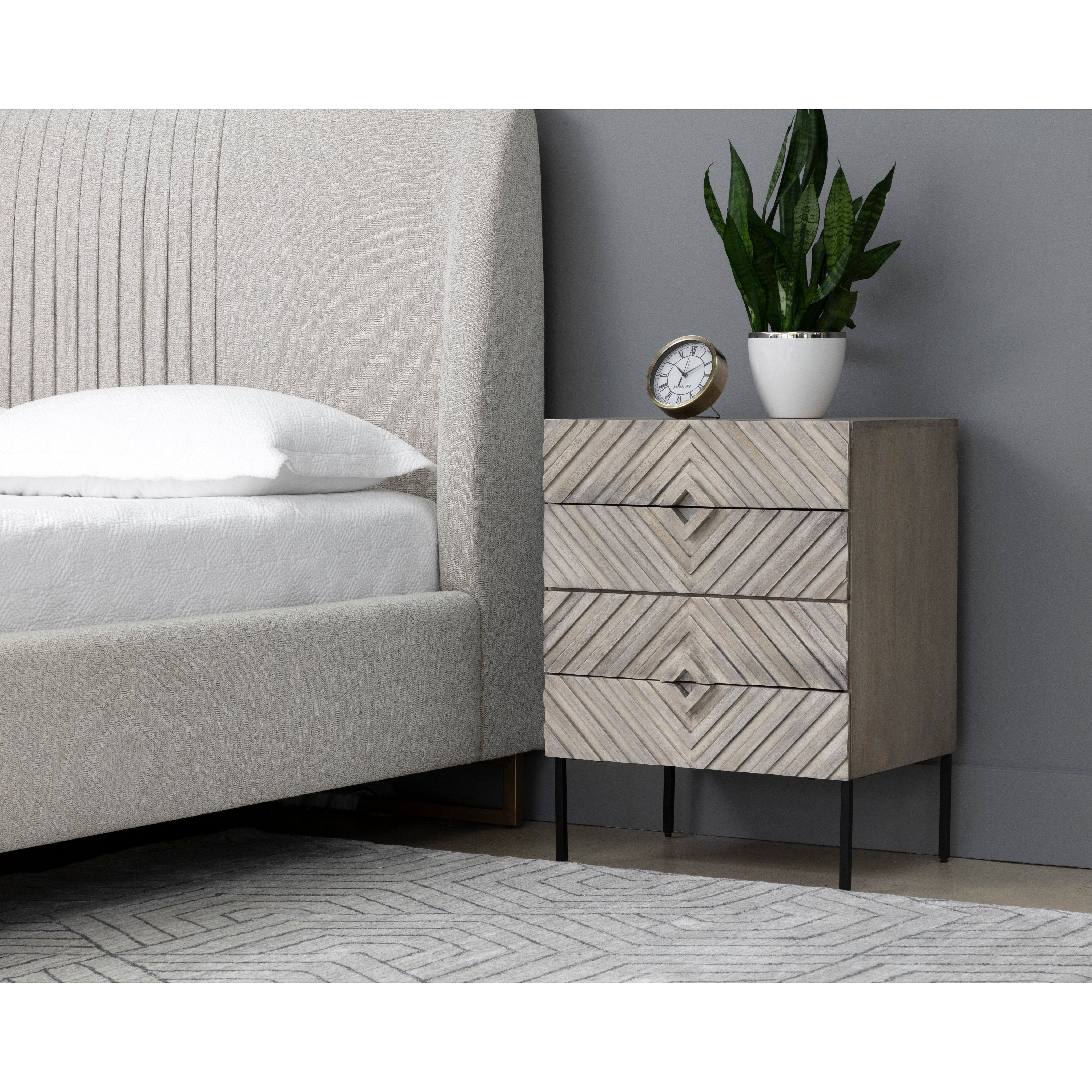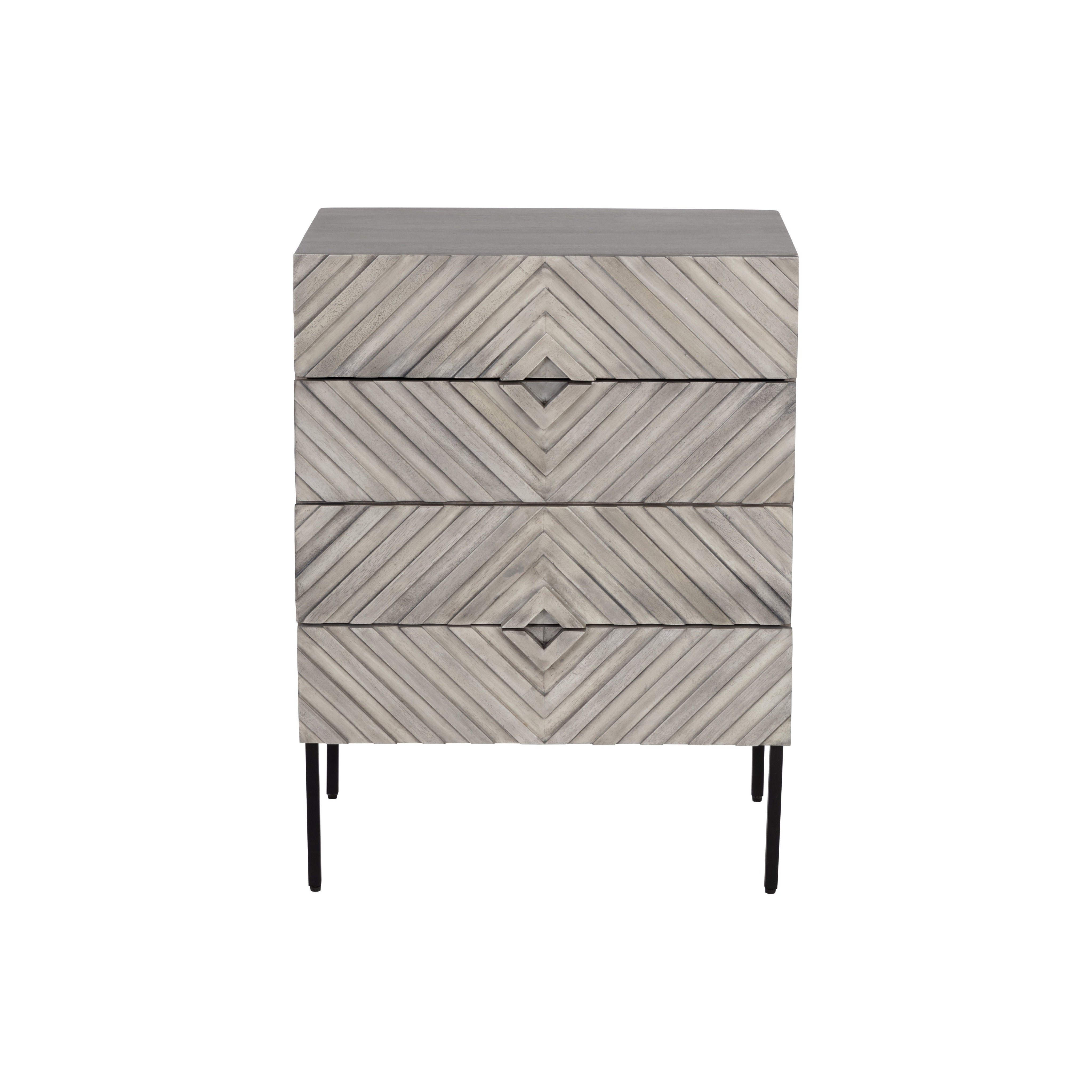 Incorporate an exotic touch to any bedroom space with this nightstand that is inspired by global travels. Made with grey solid mango wood with a hand crafted chevron pattern. Includes four drawers and completed with a black powder-coated steel base. Made in India: With refined craftsmanship, this design was brought to life by skilled local artisans. By nature, these materials develop unique imperfections such as fissures, markings and colour variations for a truly one-of-a-kind piece. As wood is an organic, porous material, these pieces will contain natural variation of texture and may also exhibit fine indentations and cracks. Wood pieces will also display a disparity of colour and grain, and visible knots and burls that add to the character of each piece.