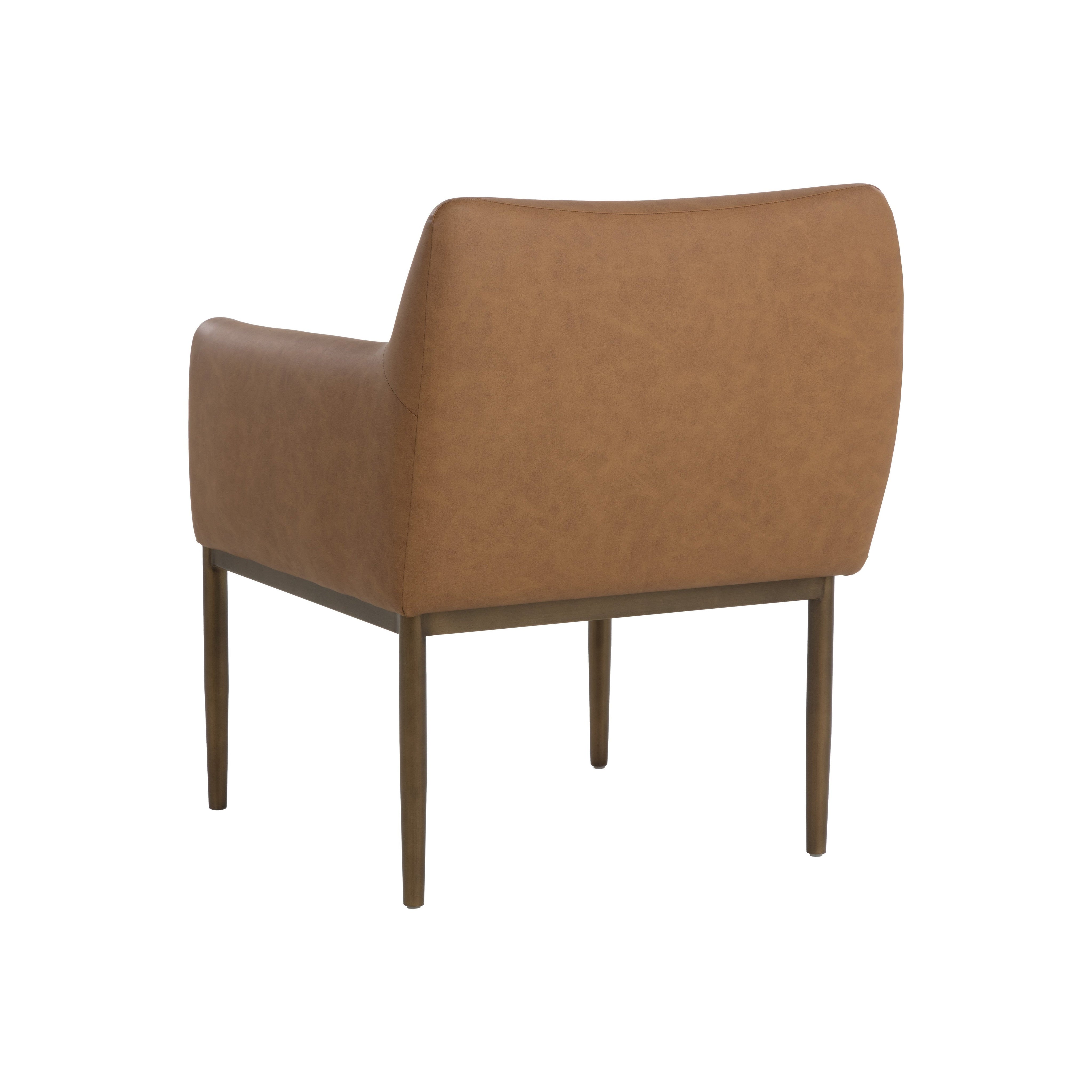 The Olea Dining Armchair is the masterful union of mid-century technique and contemporary ease. Versatile enough to accompany any space and boasting a charming silhouette with bronze powder-coated steel legs that emphasize the smooth texture of milliken cognac faux leather.