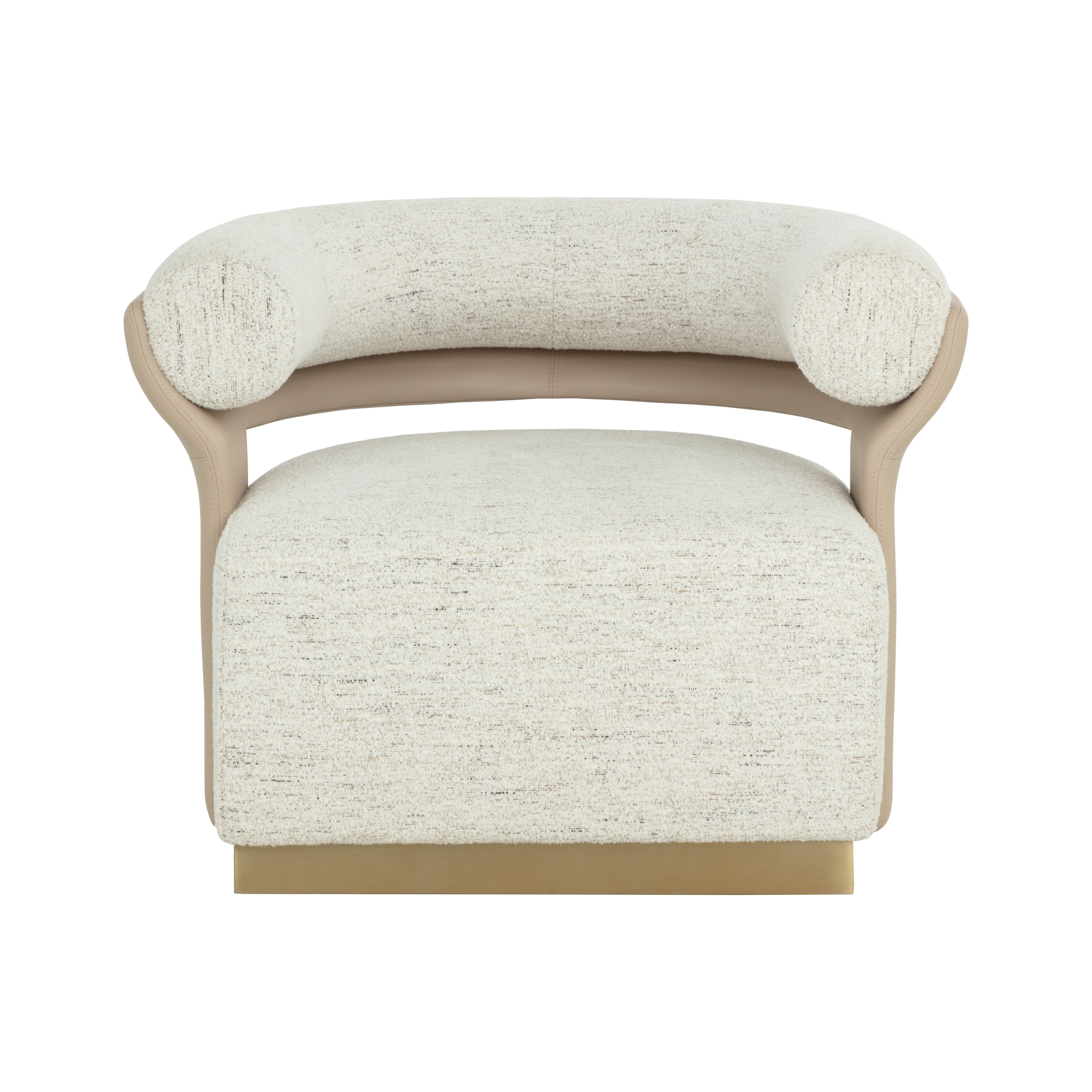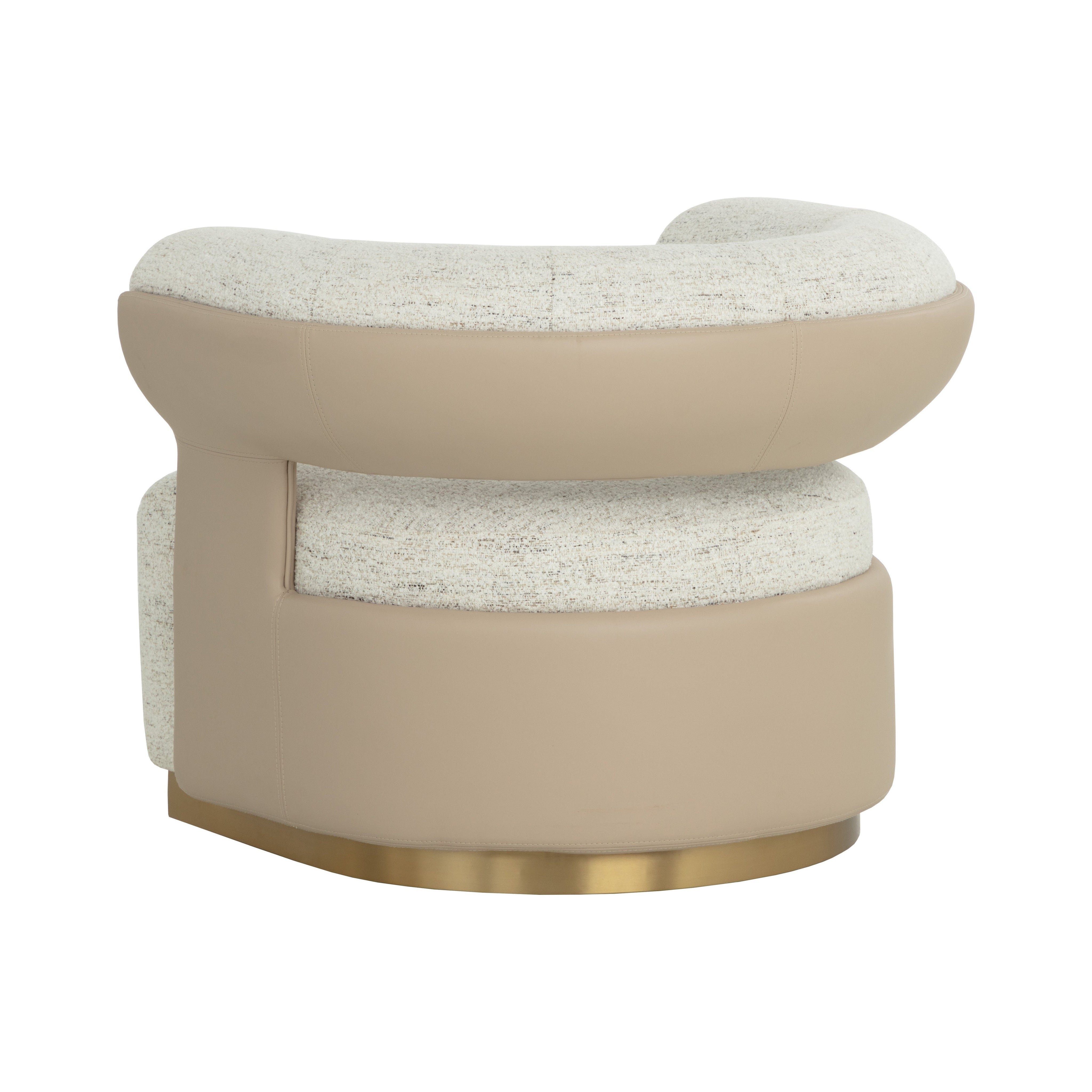 Generously curved and sculpted, the Olida Swivel Lounge Chair is a great show of contemporary style and personality. Expertly upholstered in hailey moon fabric and accented with nappa beige faux leather and a polished metal base for a demonstration of sharp and shapely ingenuity.