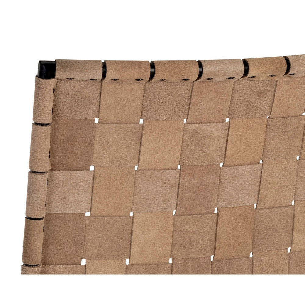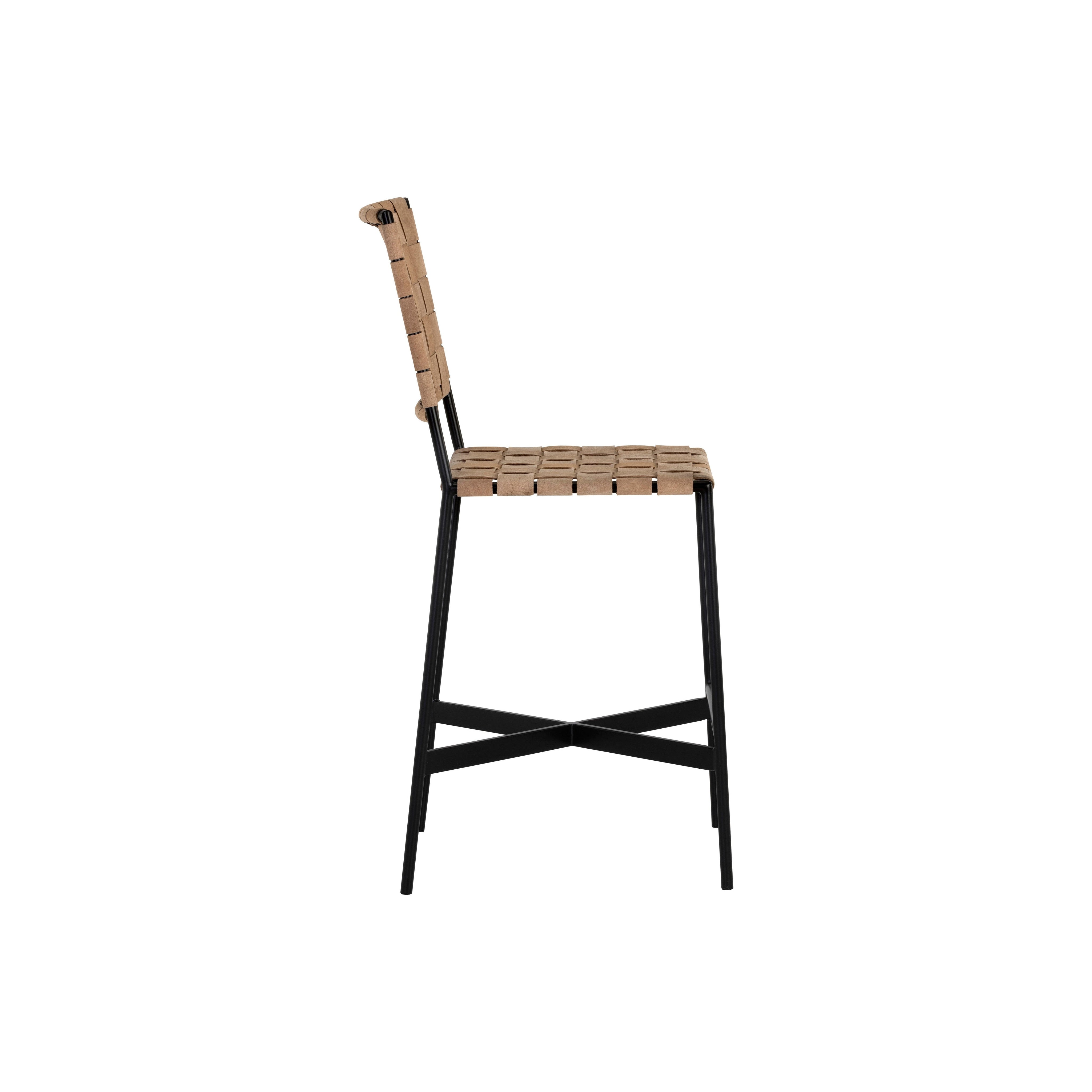 This elevated counter stool offers comfortable seating and unique style. Features a weaved seat in light tan suede leather and finished with a black iron frame.