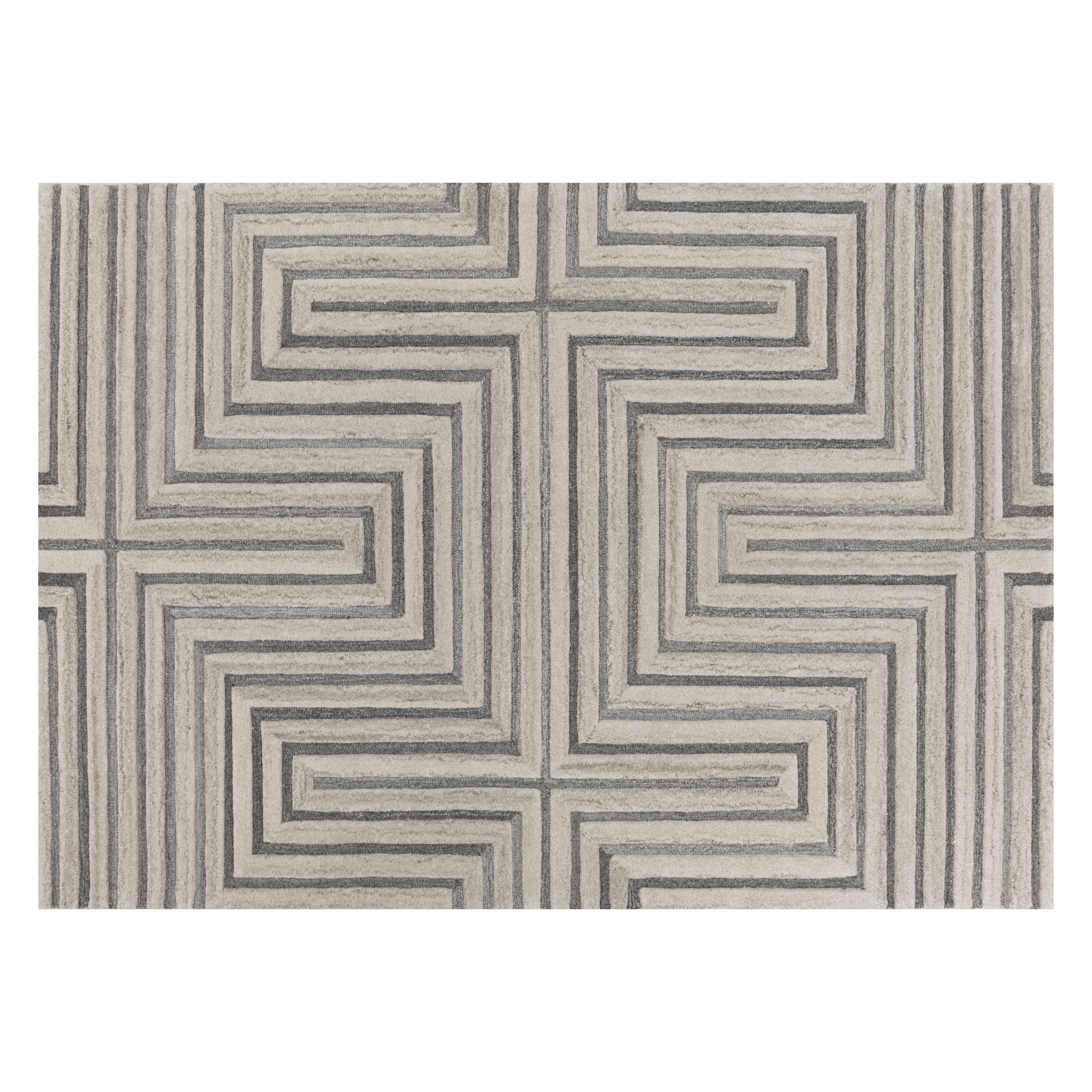 Bold lines create a maze-like pattern on this hand-tufted rug made by skilled local artisans. With its wool composition in complementing beige and grey hues, this rug is sure to impress. Available in four sizes. Variations in colour, design and size are to be expected and embraced in each rug due to the distinctive weaving process followed by each artisan, resulting in a truly one-of-a-kind piece. Shedding is inherent to wool rugs and will subside over time with regular vacuuming.