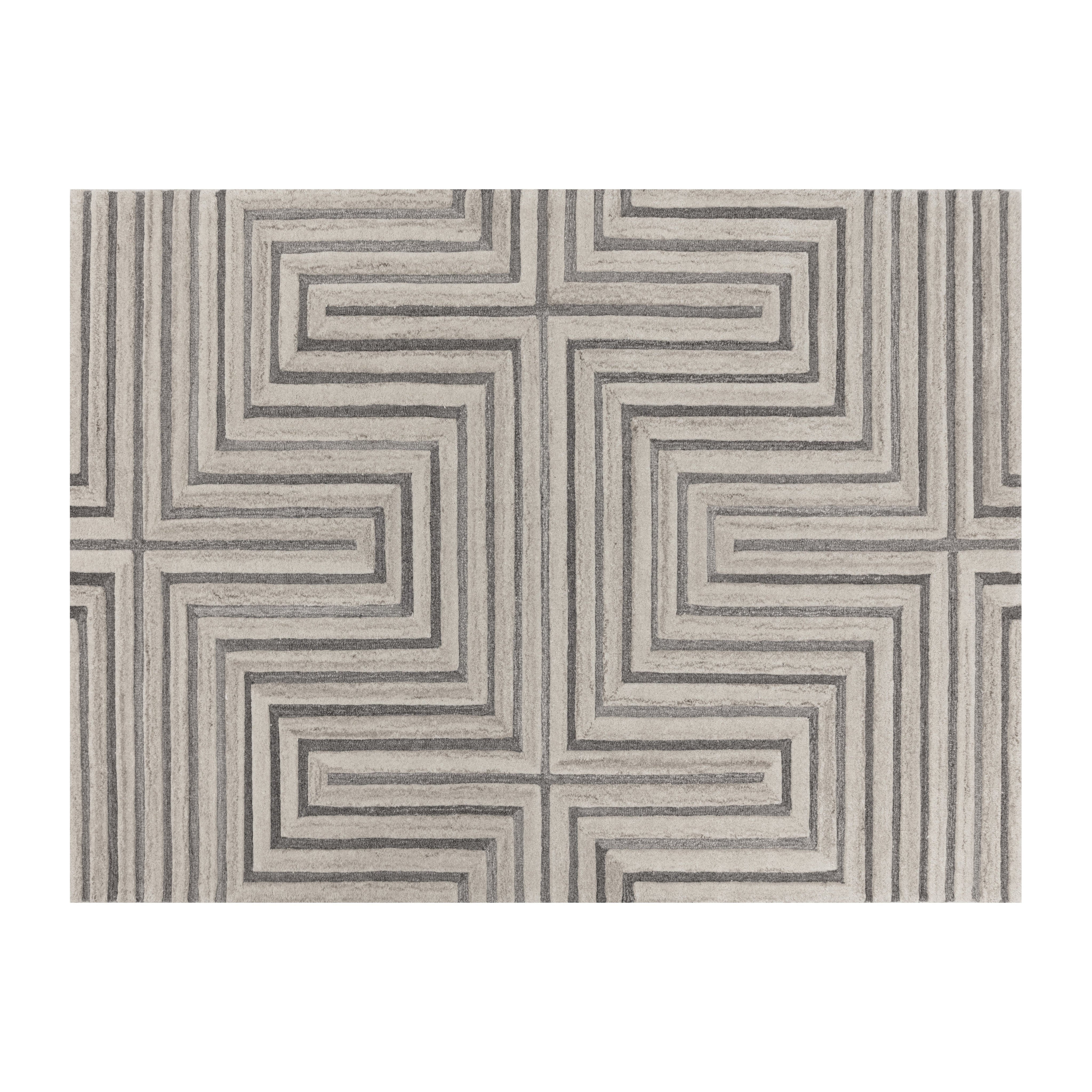 Bold lines create a maze-like pattern on this hand-tufted rug made by skilled local artisans. With its wool composition in complementing beige and grey hues, this rug is sure to impress. Available in four sizes. Variations in colour, design and size are to be expected and embraced in each rug due to the distinctive weaving process followed by each artisan, resulting in a truly one-of-a-kind piece. Shedding is inherent to wool rugs and will subside over time with regular vacuuming.
