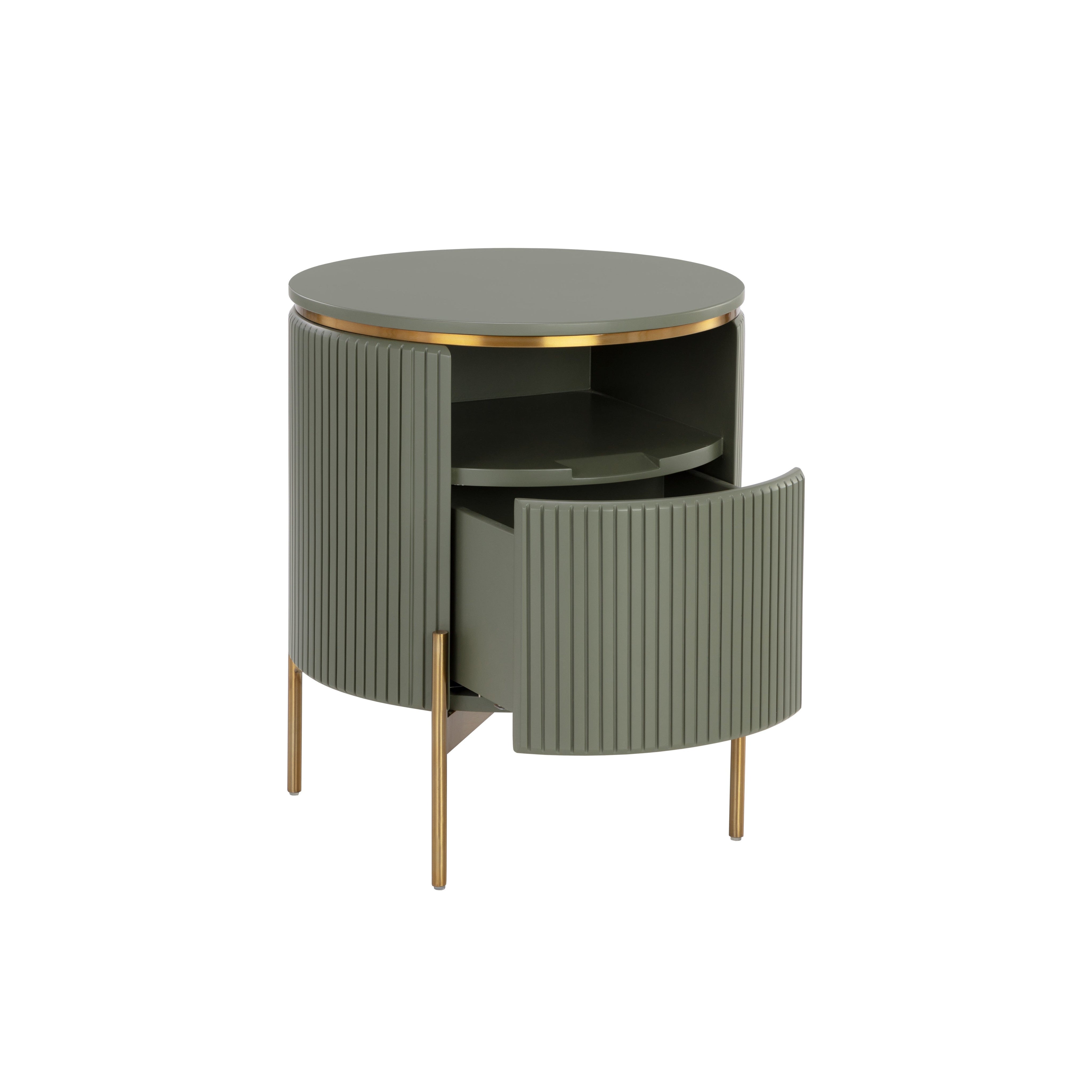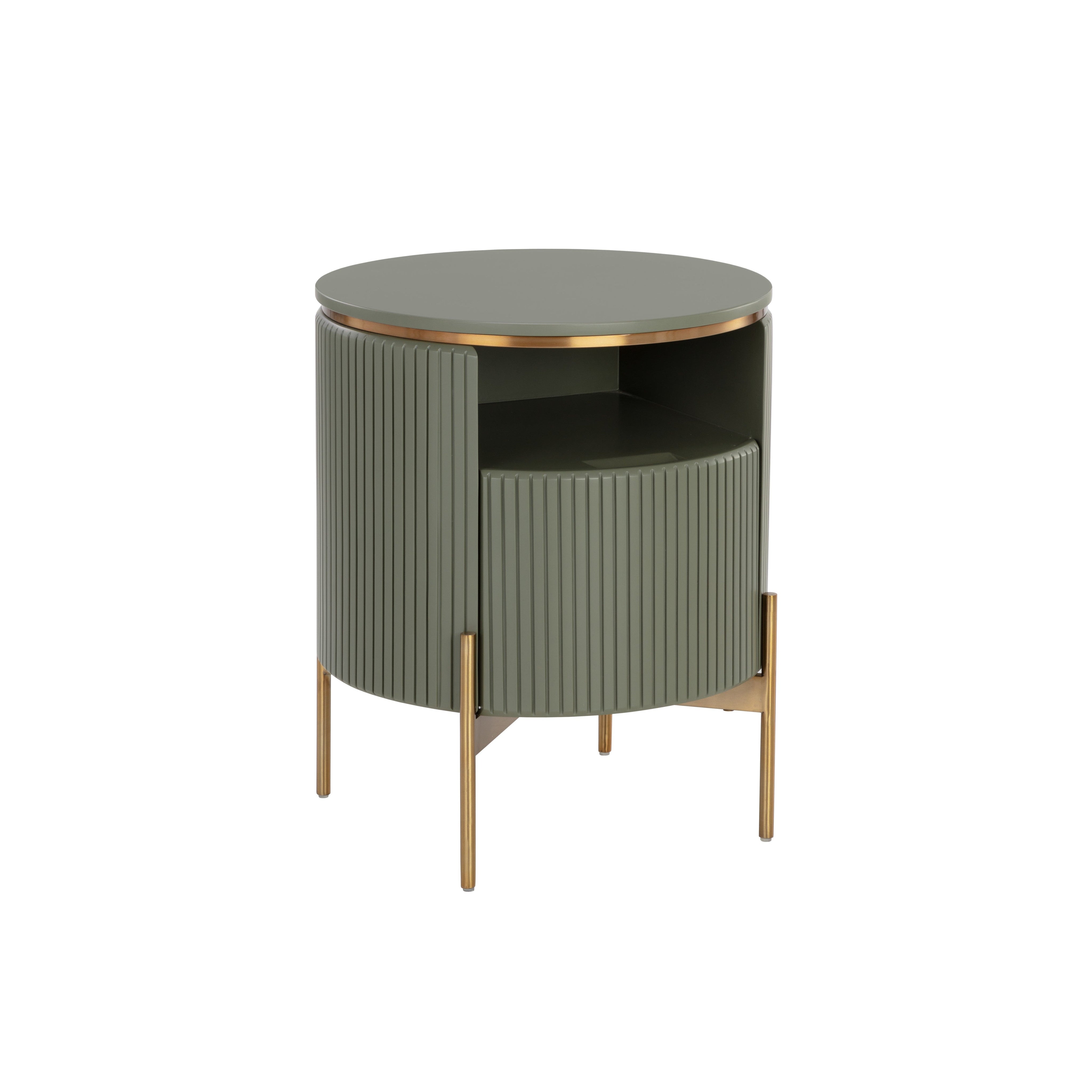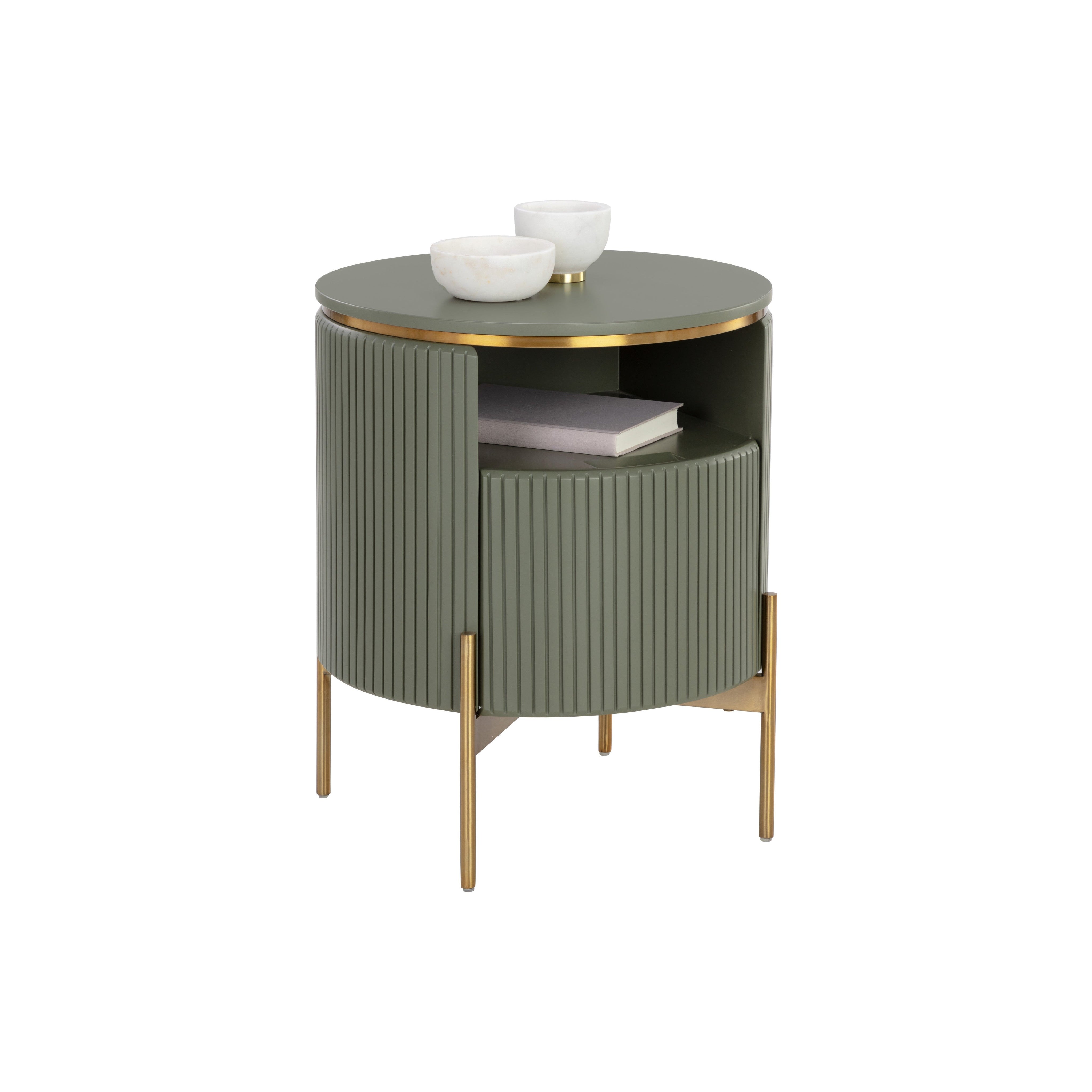 This luxurious end table will bring a sculptural spirit to any space. The round frame, finished in sage green, is contrasted with intricate vertical reeding. Gold stainless steel legs and inlay create added definition.