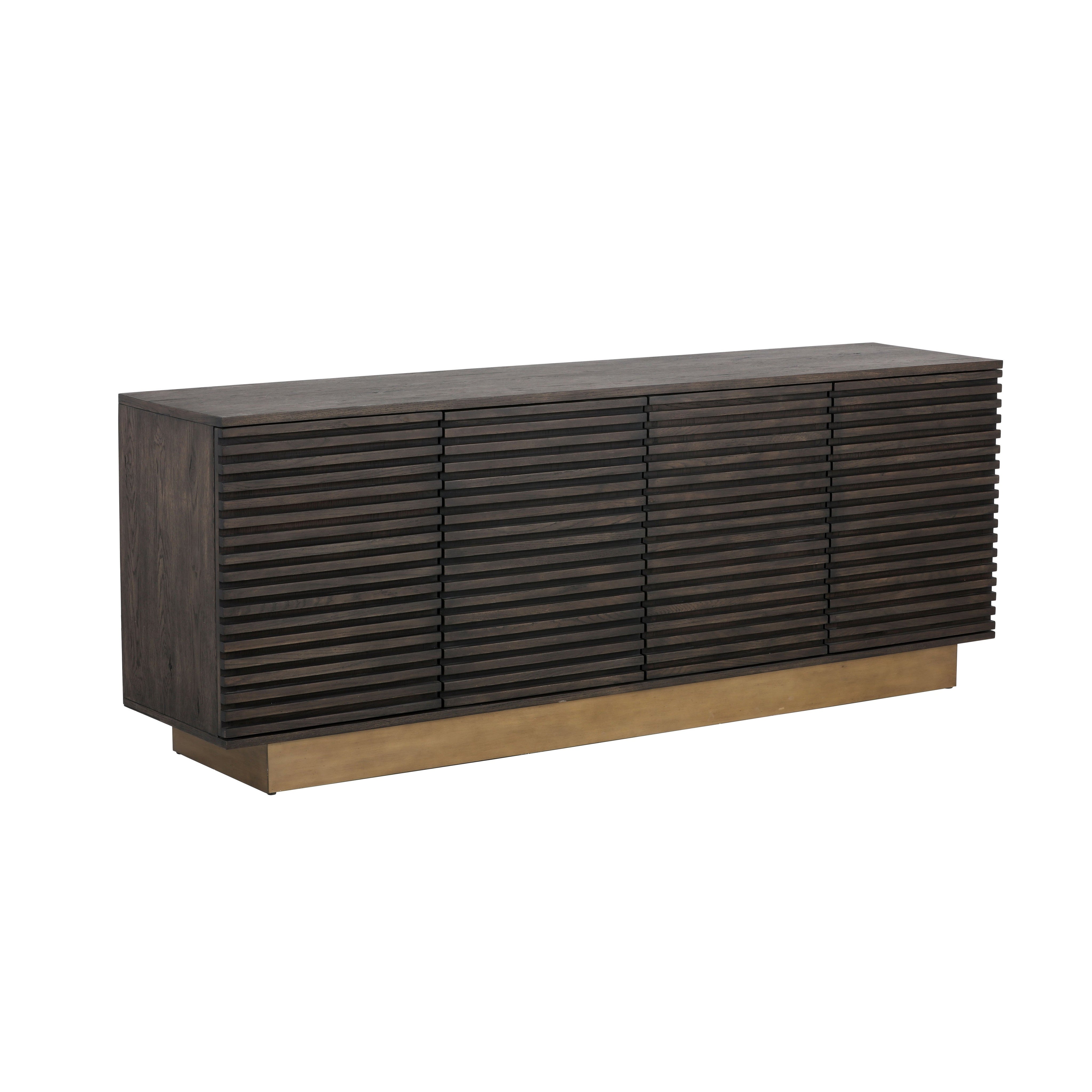 This beautifully crafted sideboard will add allure to any dining space. Designed with four large paneled cabinet doors and shelving for ample storage. An antique brass steel base completes the look. Distressed finish will have visible cracks and dents are part of the finish.