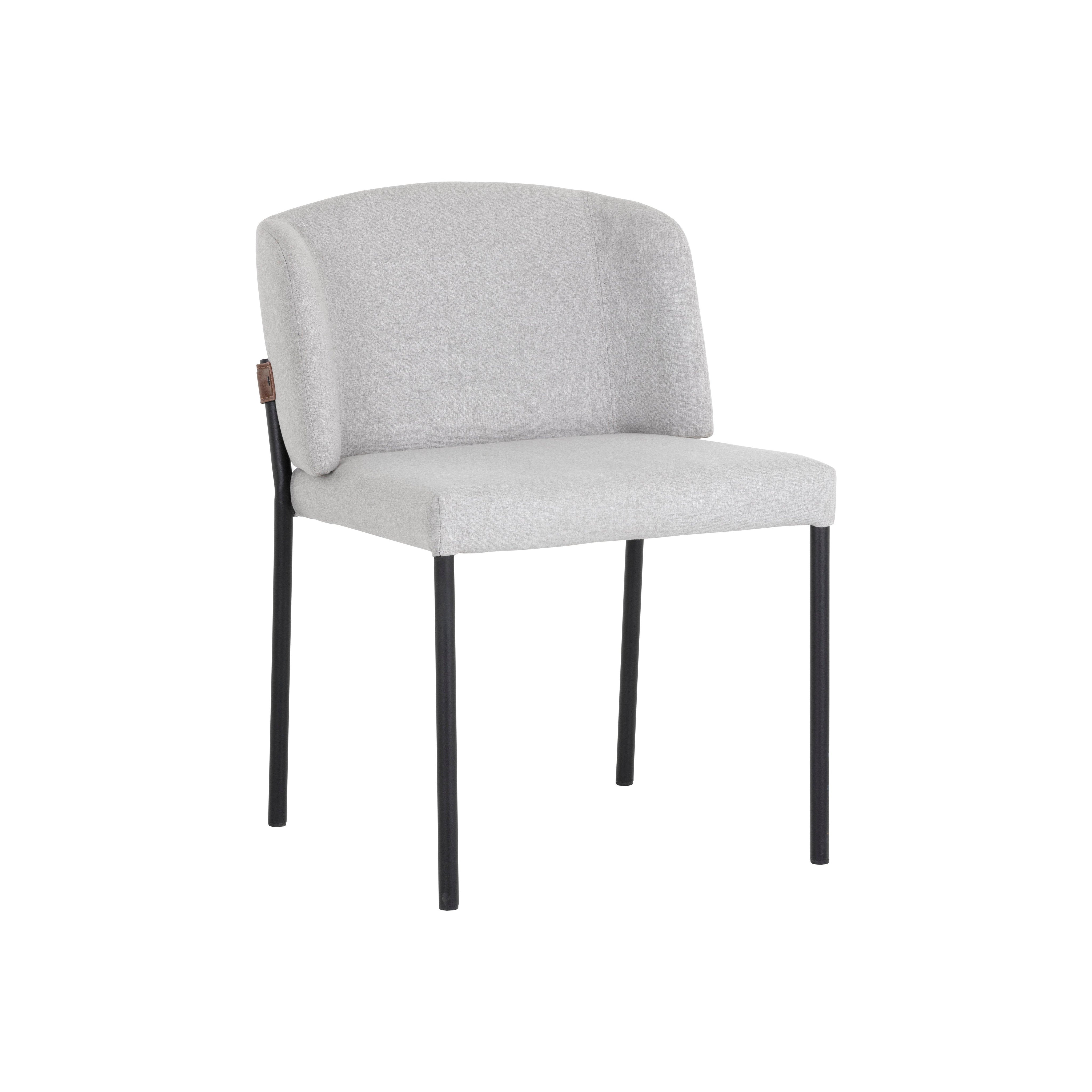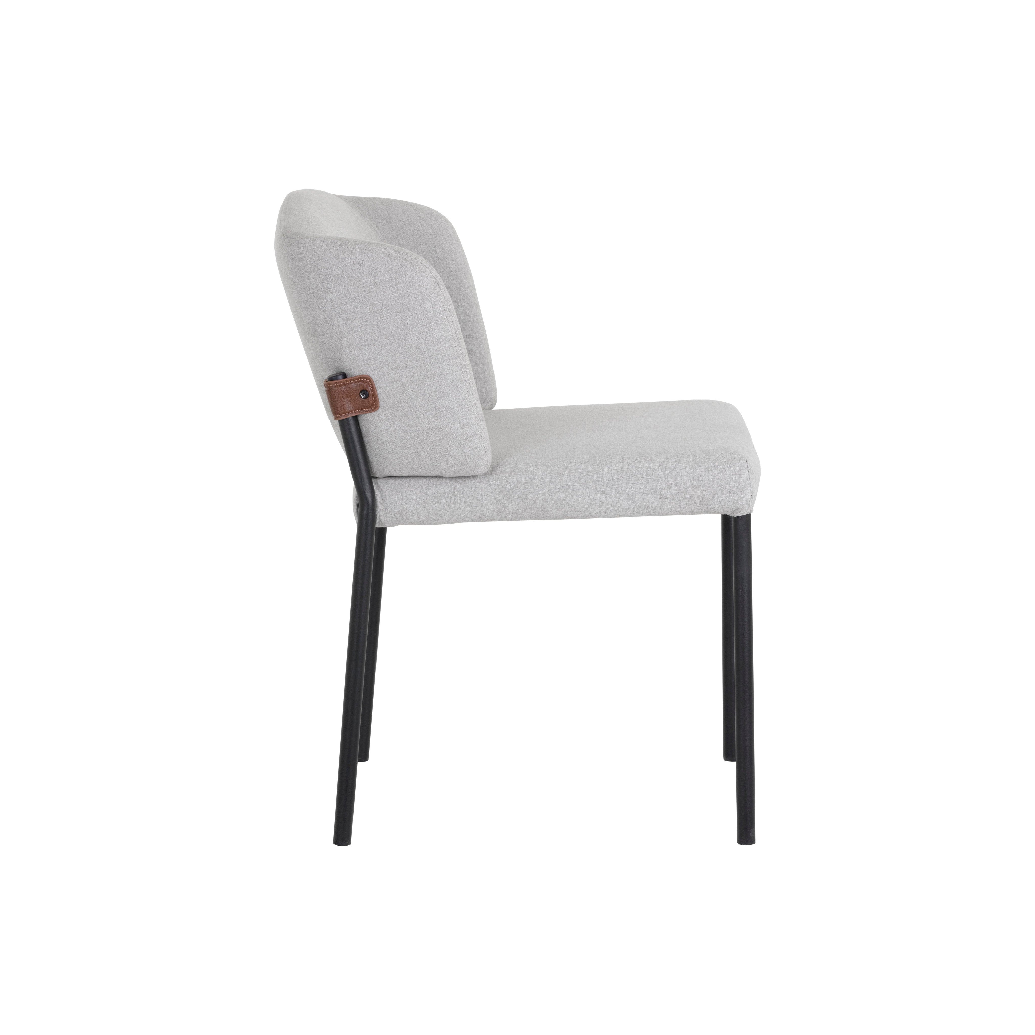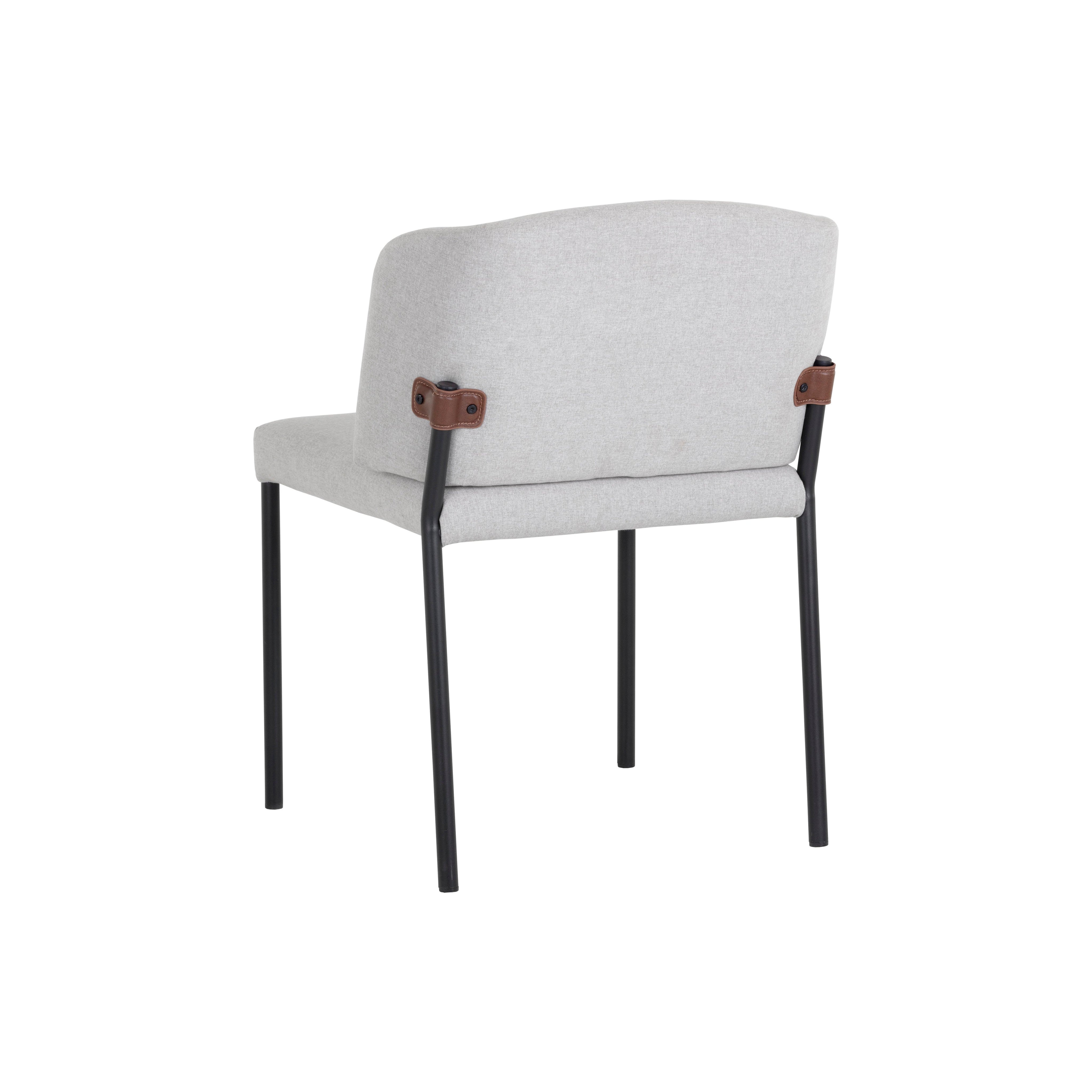 With a clean cut design, this modern dining chair illustrates the beauty of minimalism. Features a two-toned seatback with light grey fabric on the interior, and bravo cognac faux leather straps on the exterior. Completed with a black powder-coated iron frame.