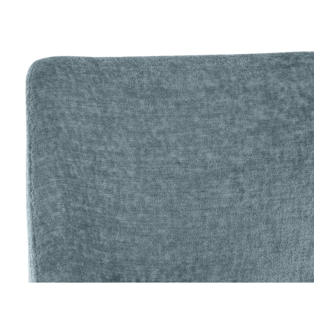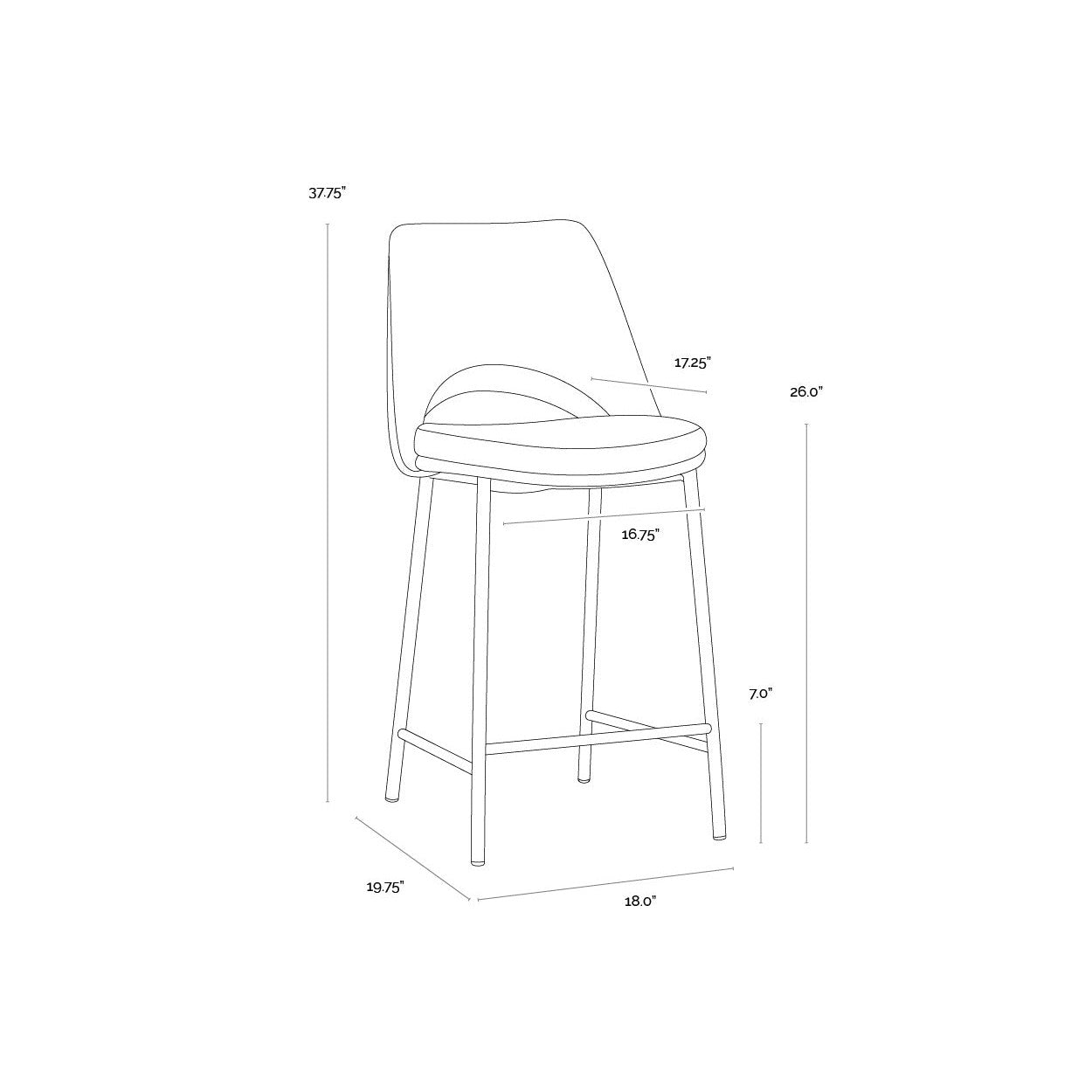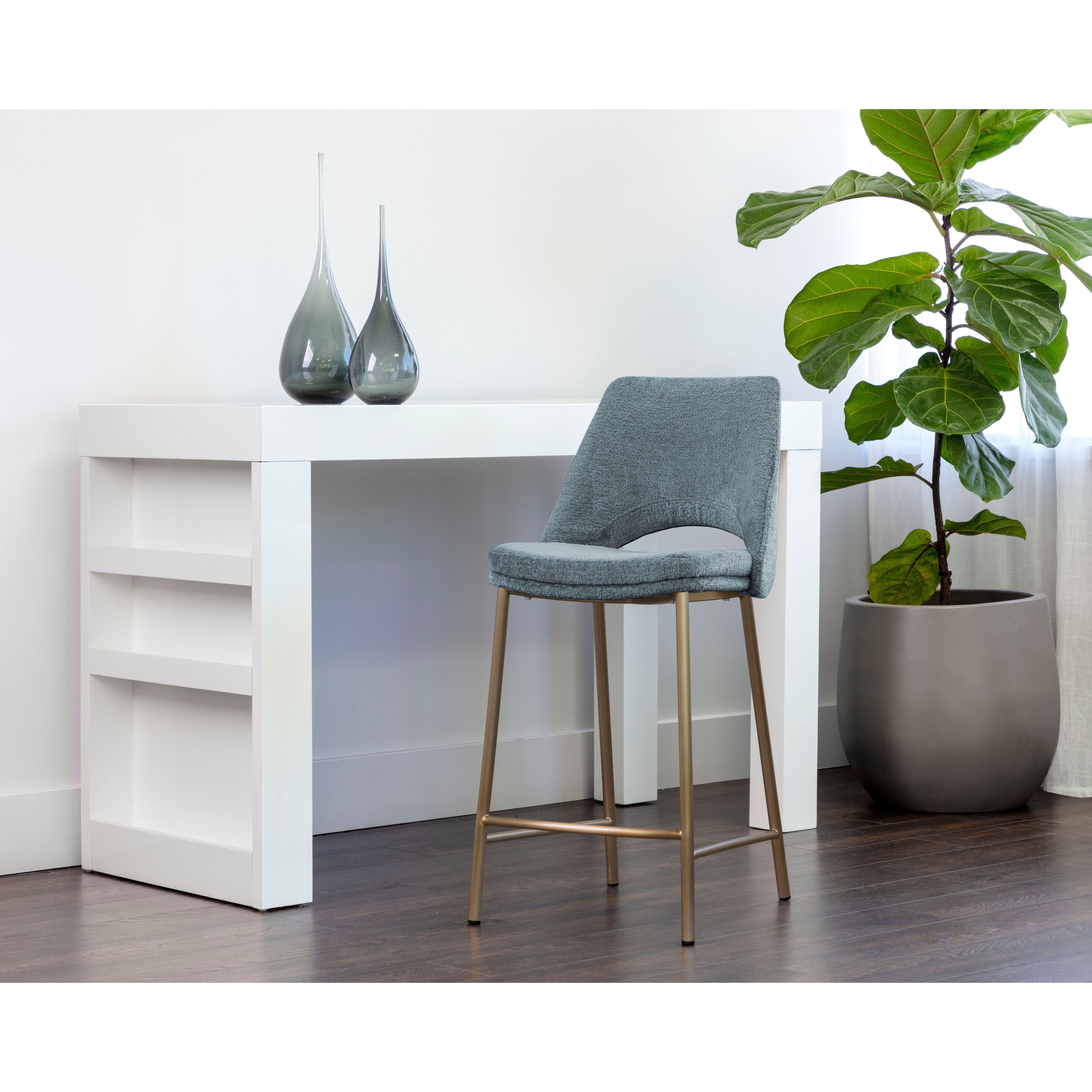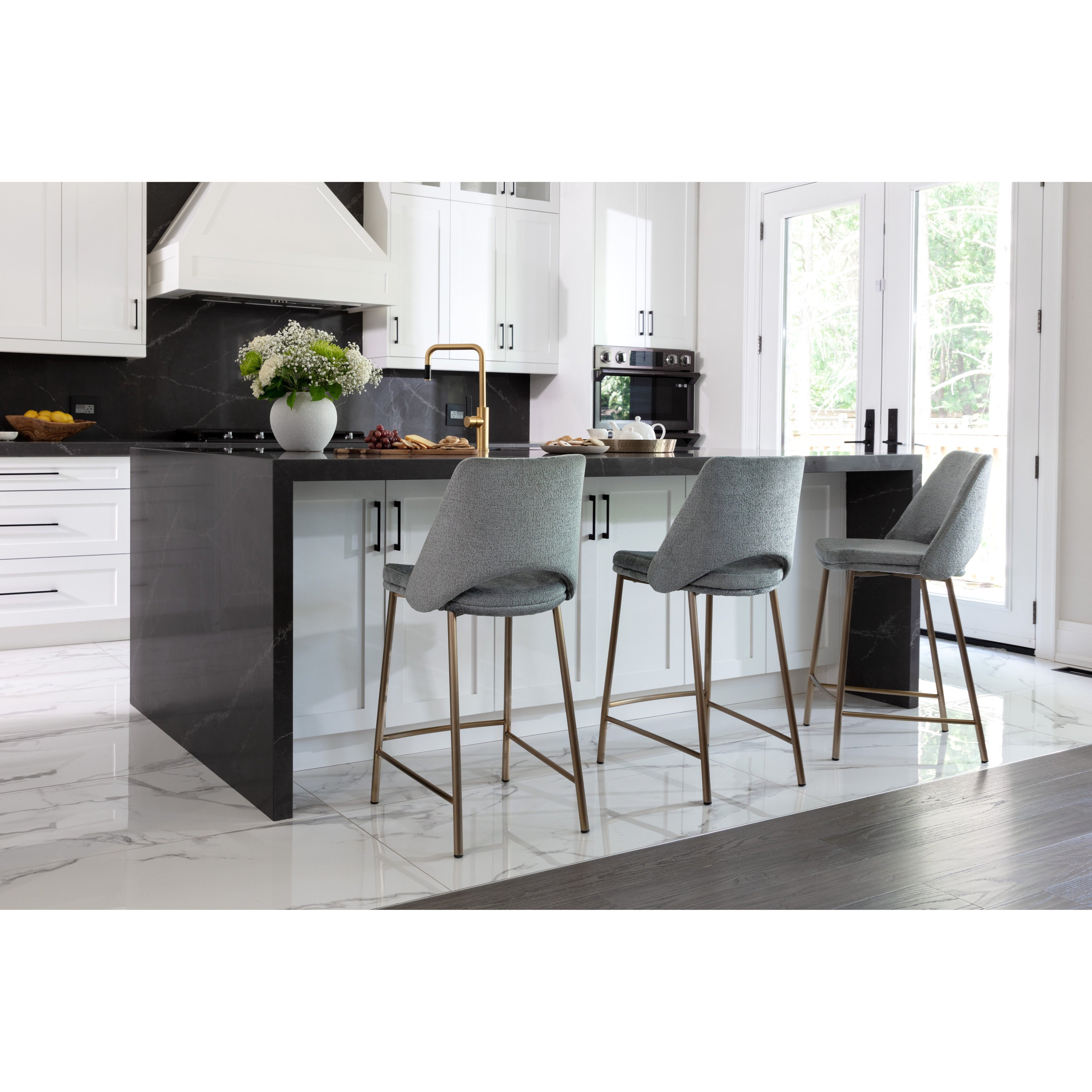 Dashing with contemporary style, this counter stool is designed with a refined touch. Upholstered in bergen french blue fabric with a stylish cutout on the seatback. Completed with an antique brass stainless steel base.