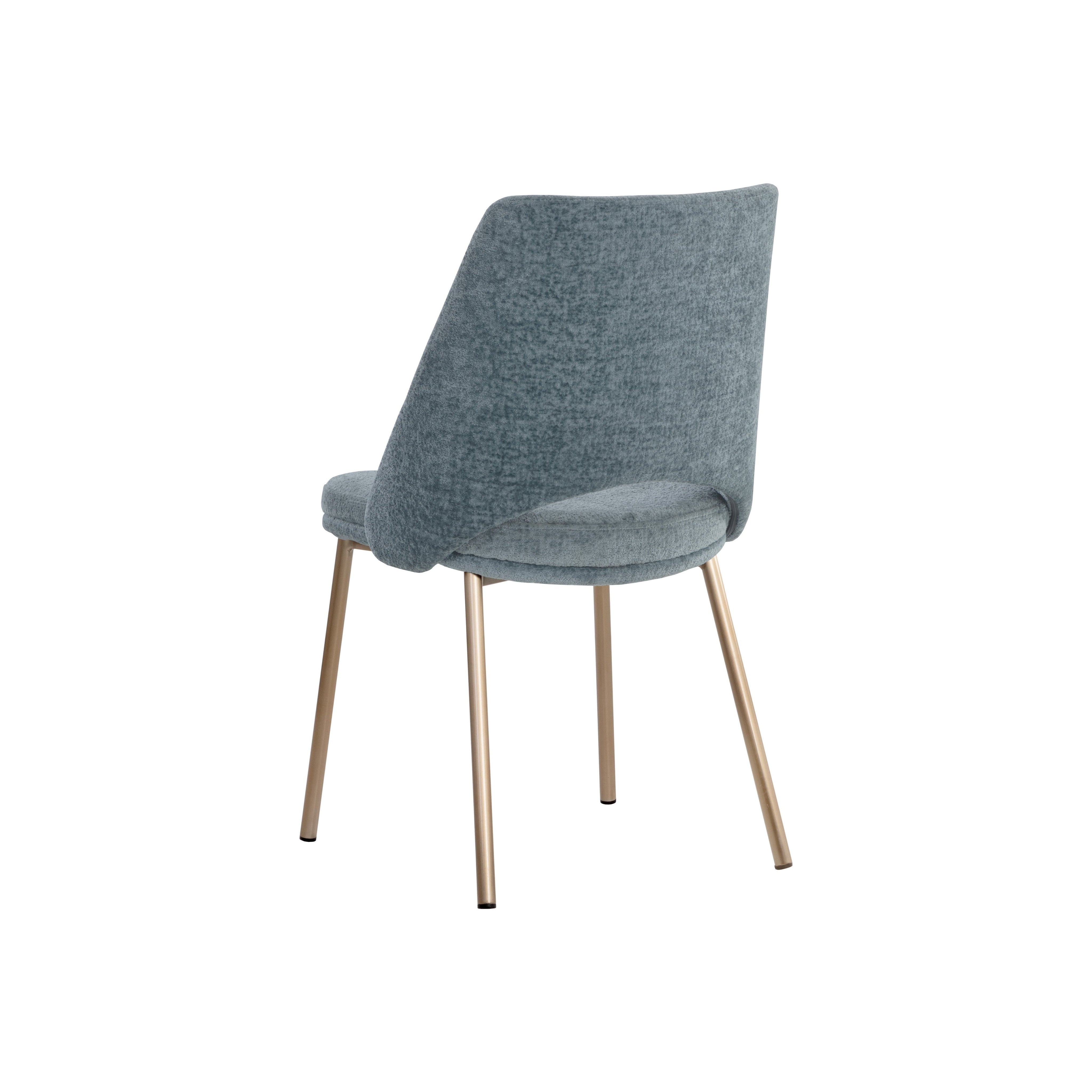 Dashing with contemporary style, this dining chair is designed with a refined touch. Upholstered in bergen french blue fabric with a stylish cutout on the seatback. Completed with an antique brass stainless steel base.