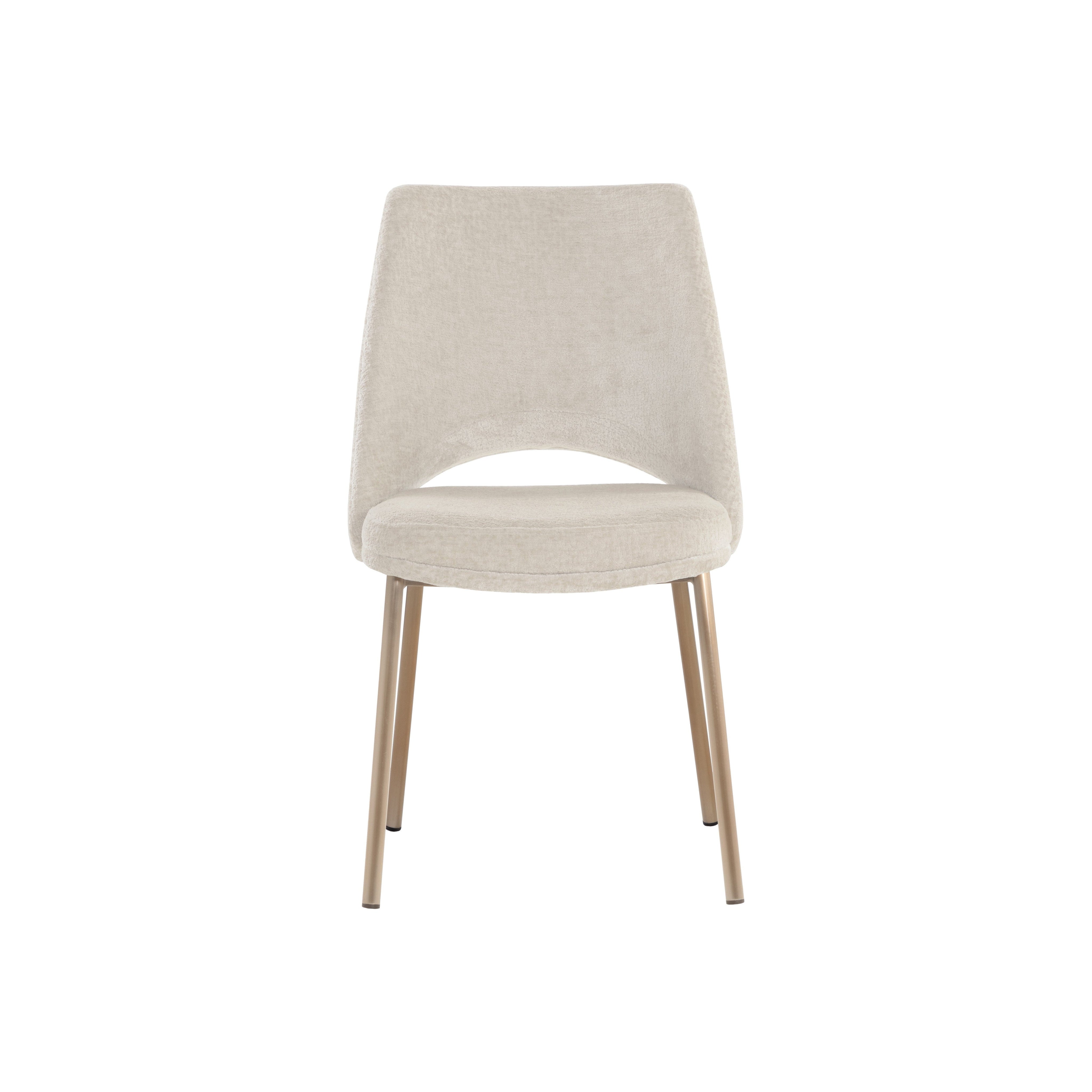 Dashing with contemporary style, this dining chair is designed with a refined touch. Upholstered in bergen taupe fabric with a stylish cutout on the seatback. Completed with an antique brass stainless steel base.