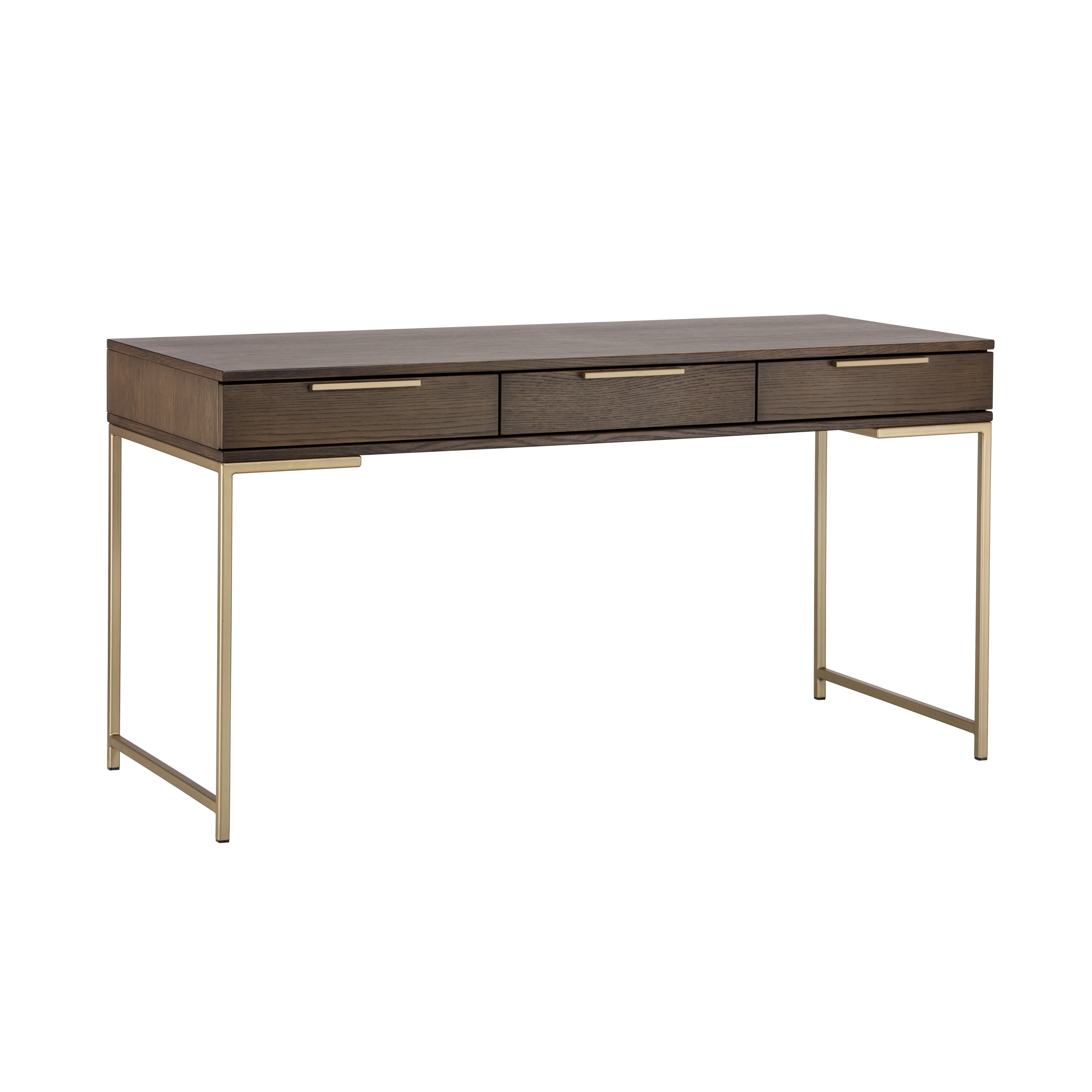 A modern desk designed to add a beautiful touch to office spaces. Crafted from raw umber oak wood veneer with three soft closing drawers for ample storage. Brushed gold iron hardware completes the look. As wood is an organic, porous material, these pieces will contain natural variation of texture and may also exhibit fine indentations and cracks. Wood pieces will also display a disparity of colour and grain, and visible knots and burls that add to the character of each piece.