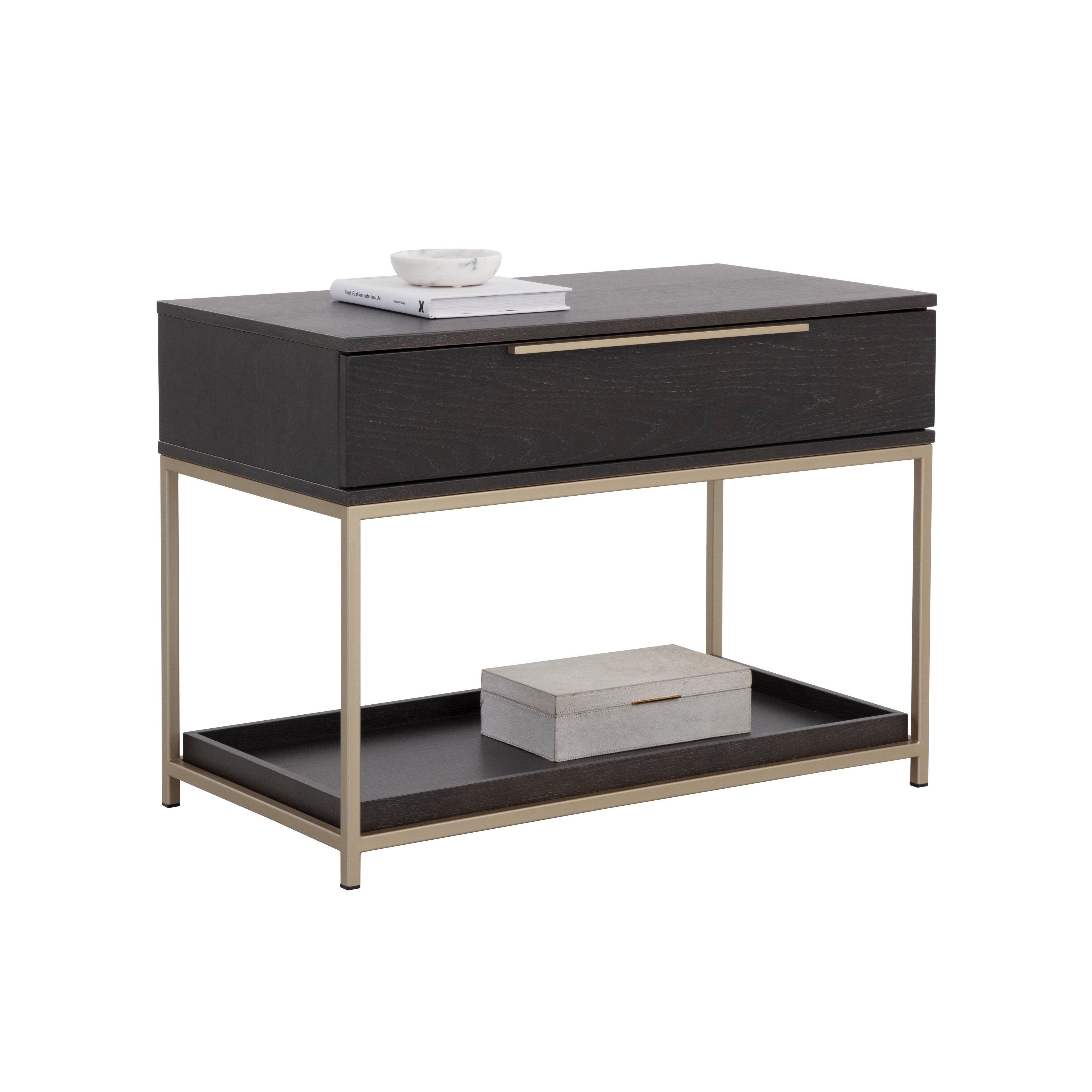 A modern nightstand designed to add a beautiful touch to the bedroom. Crafted from charcoal grey oak veneer with a large soft closing drawer and shelf for added storage. Brushed gold iron hardware completes the look. As wood is an organic, porous material, these pieces will contain natural variation of texture and may also exhibit fine indentations and cracks. Wood pieces will also display a disparity of colour and grain, and visible knots and burls that add to the character of each piece.