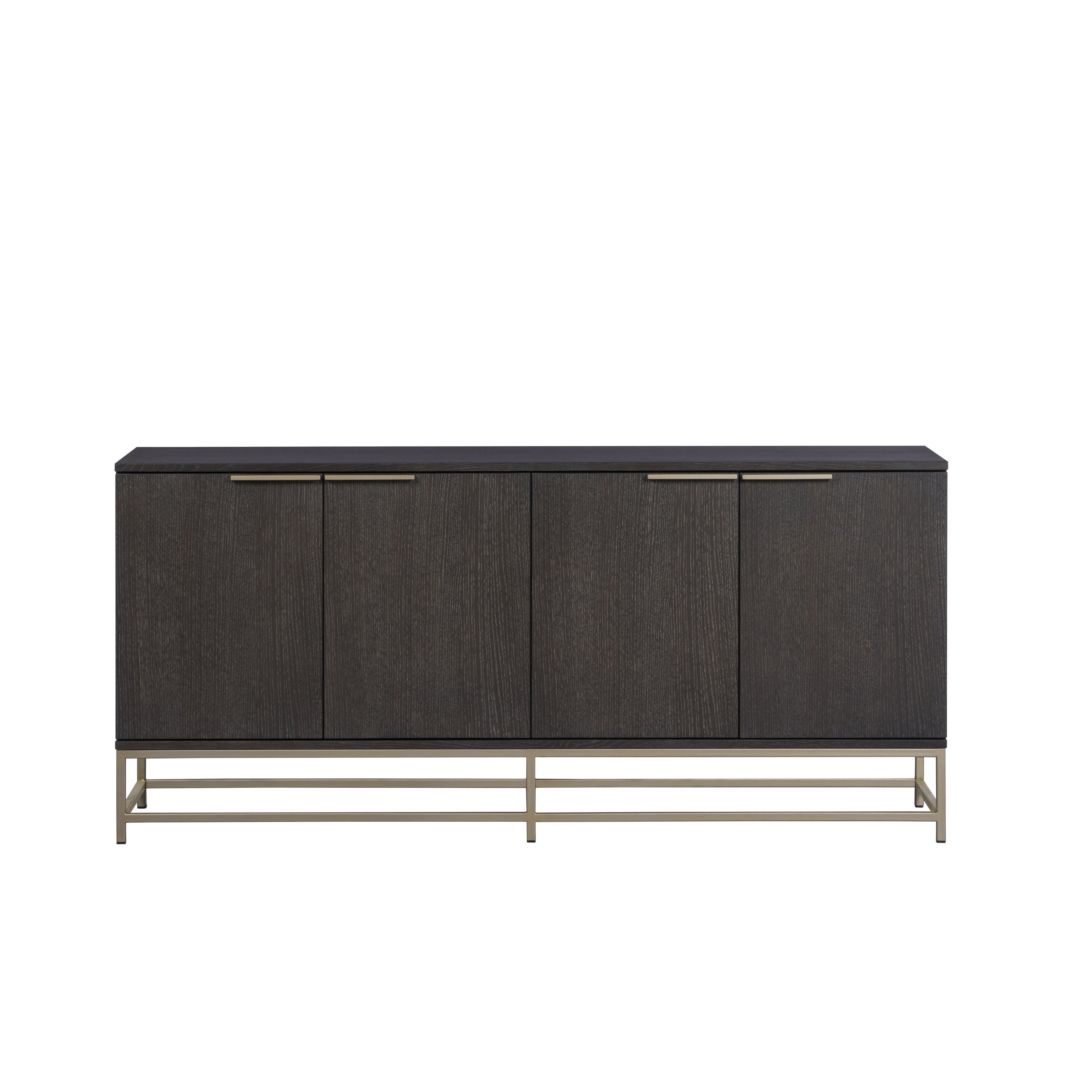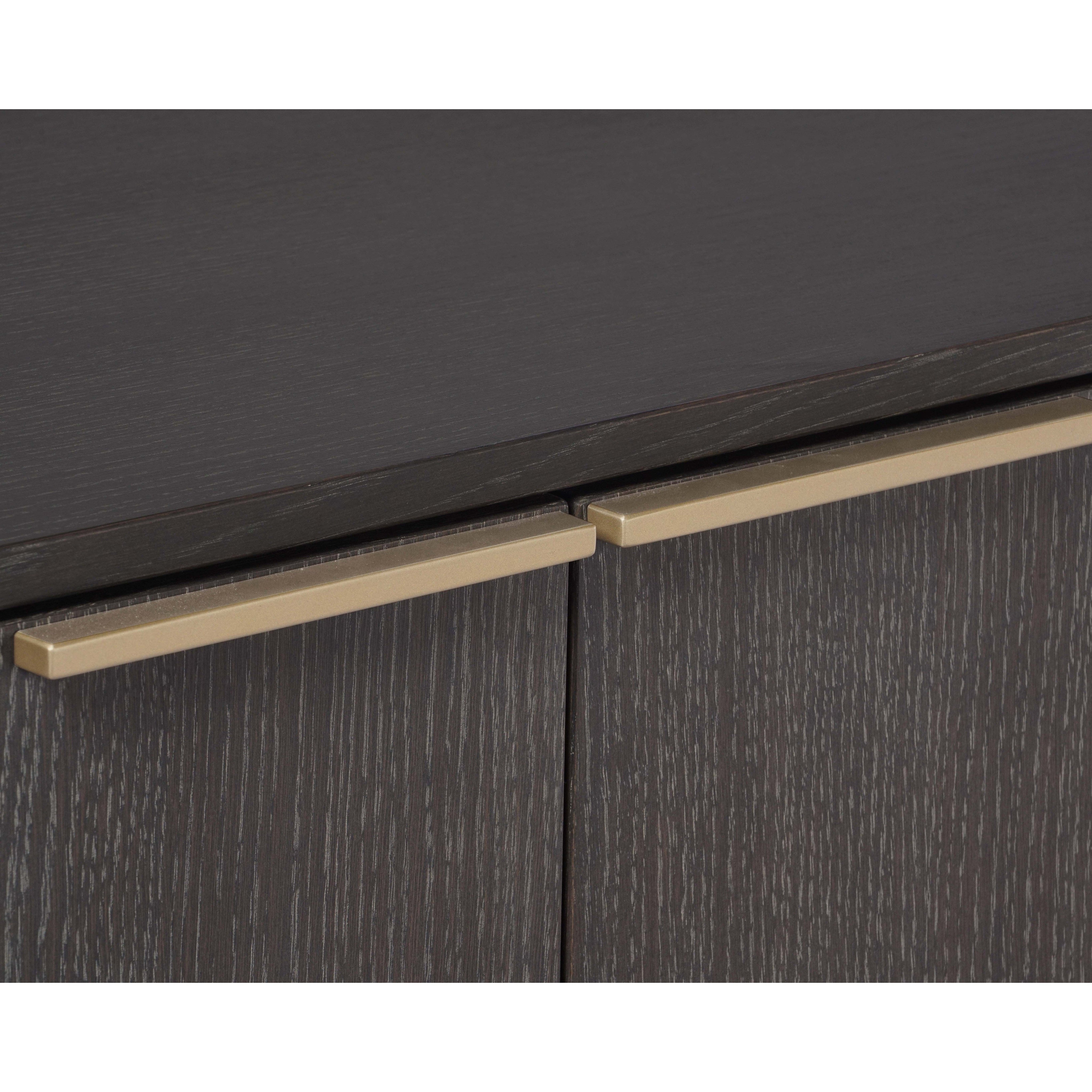 A modern sideboard designed to add a beautiful touch to the living, lounge, office and dining spaces. Crafted from charcoal grey oak veneer with four cabinets and shelves for added storage. Brushed gold iron hardware completes the look. As wood is an organic, porous material, these pieces will contain natural variation of texture and may also exhibit fine indentations and cracks. Wood pieces will also display a disparity of colour and grain, and visible knots and burls that add to the character of each piece.