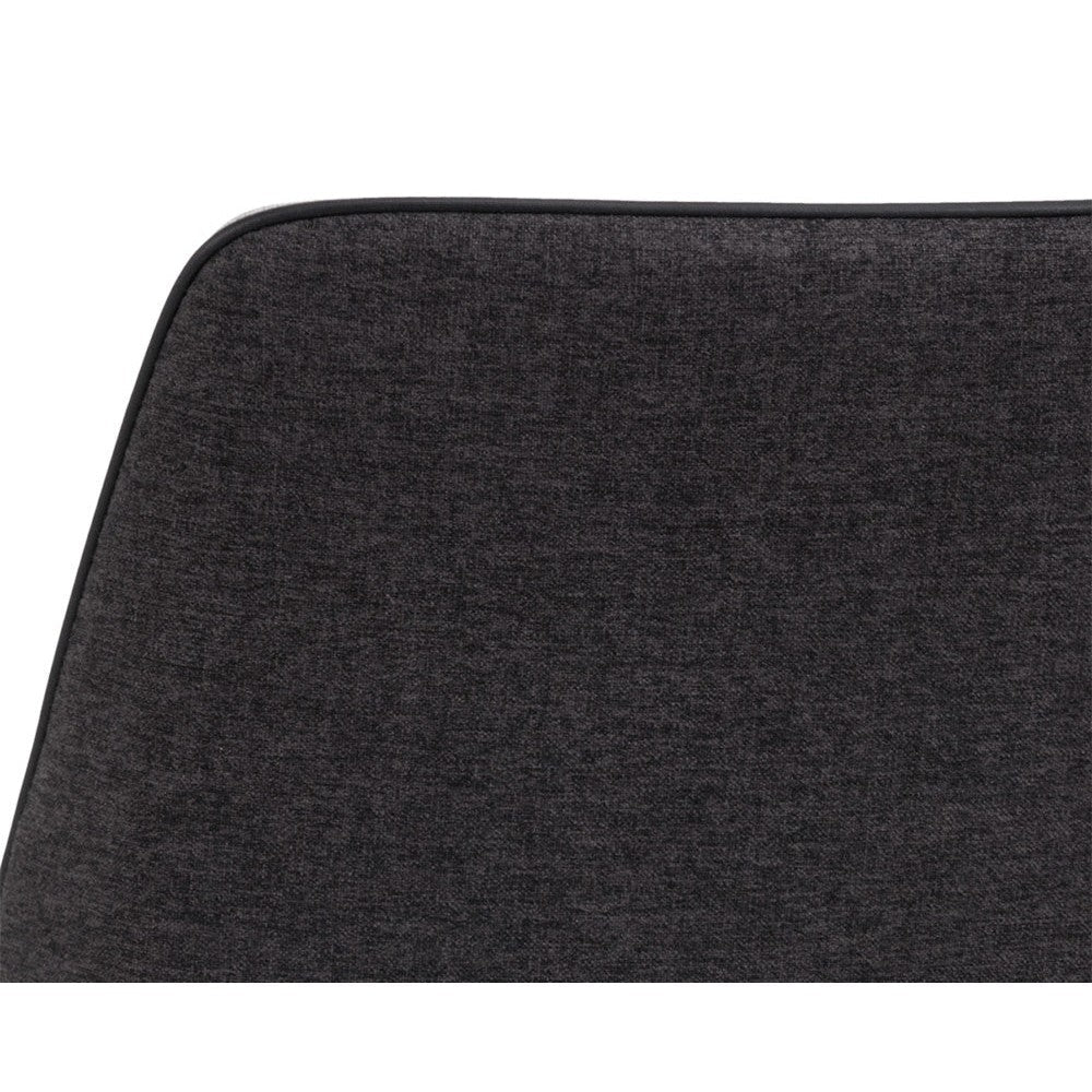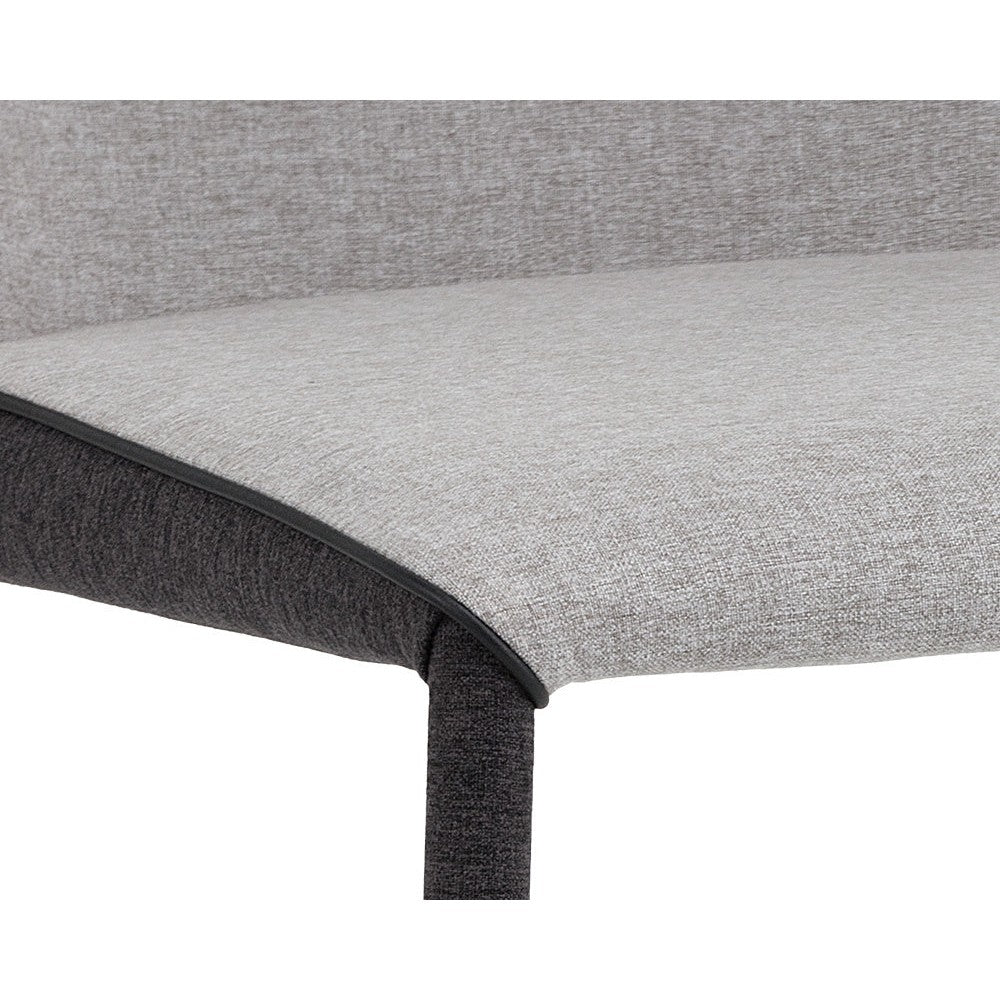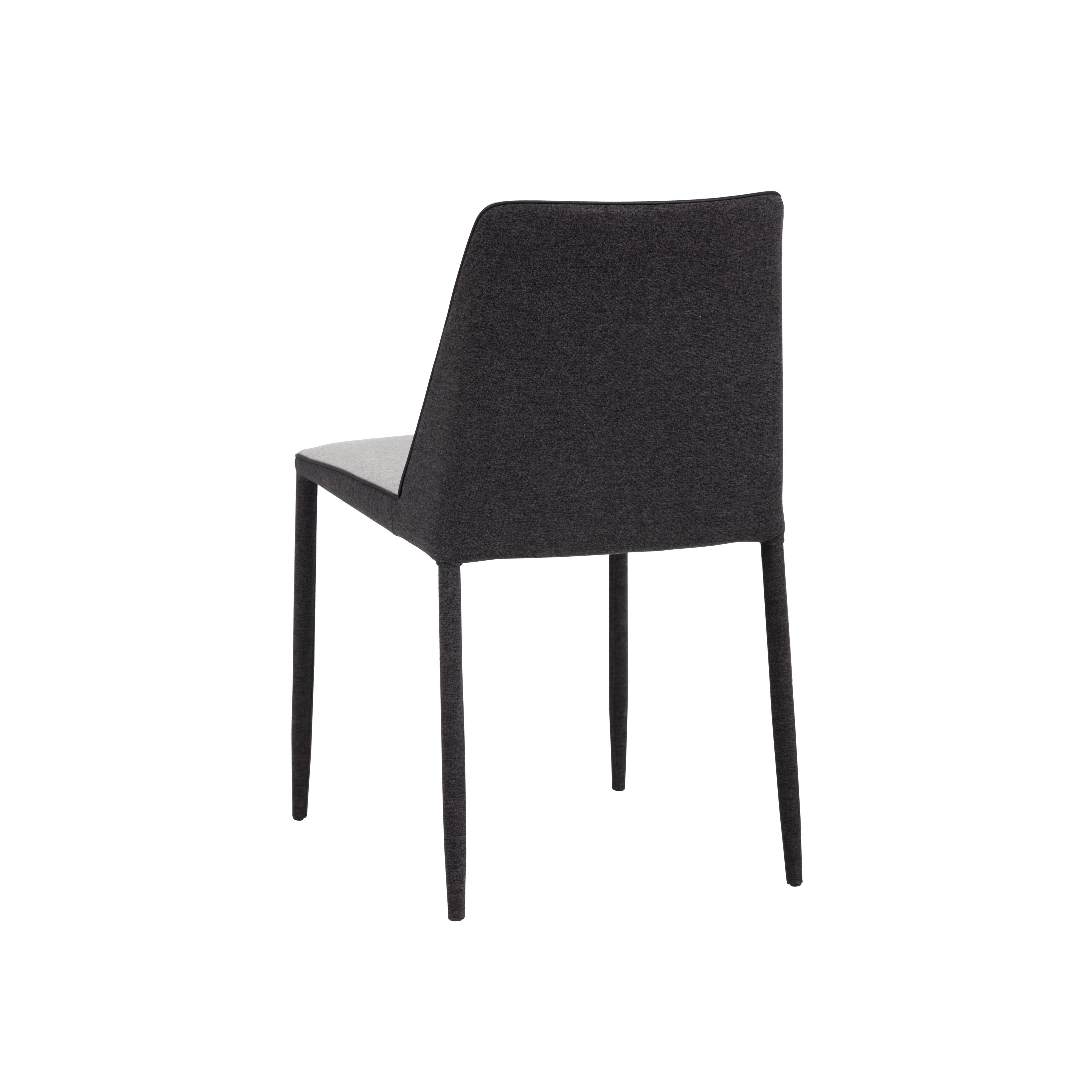 This modern dining chair offers a minimalist silhouette perfect for small urban settings. Features a comfortable seat in armour grey fabric with a contrasting seat back and steel legs upholstered legs in dark slate fabric.