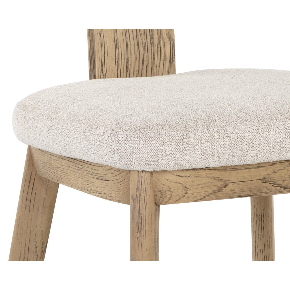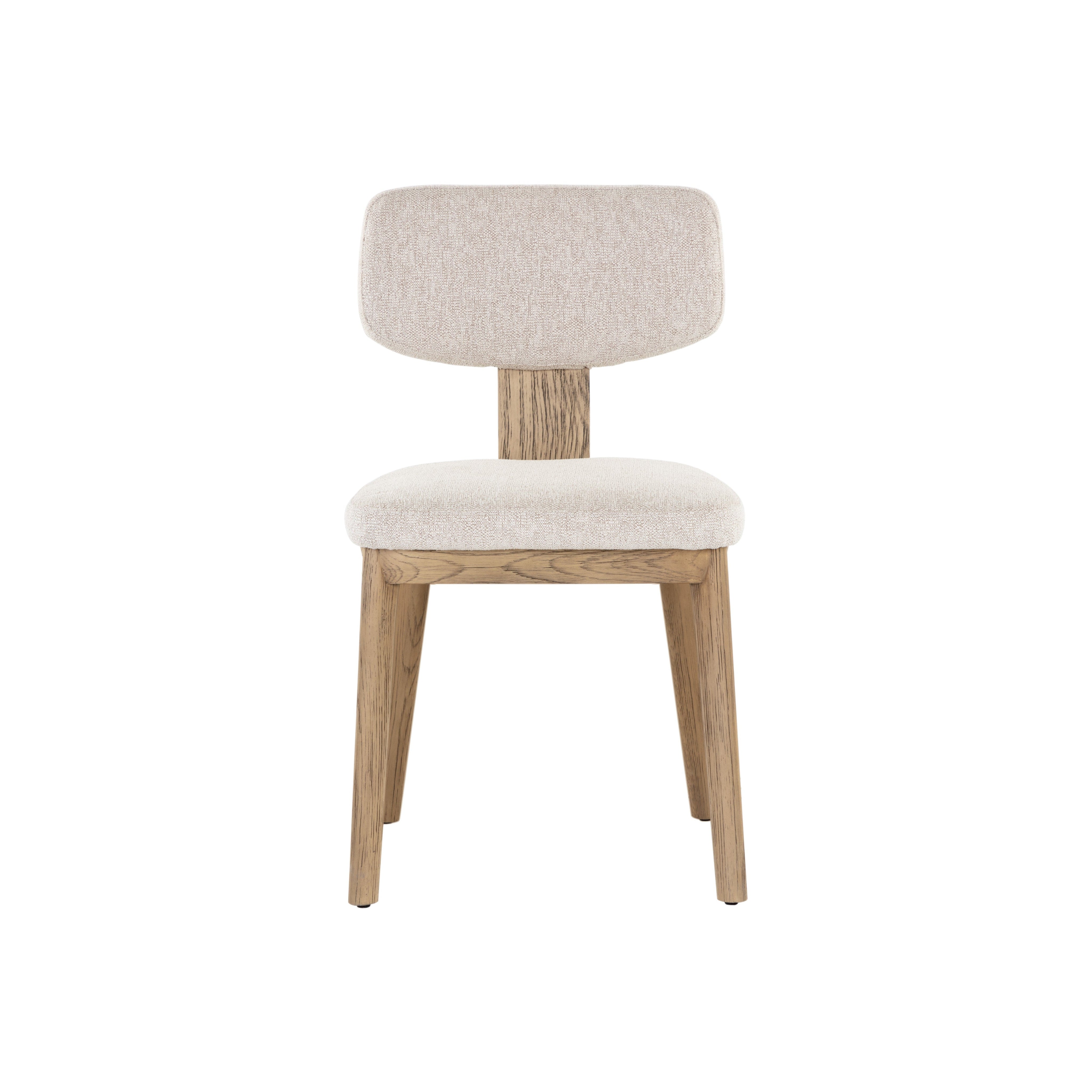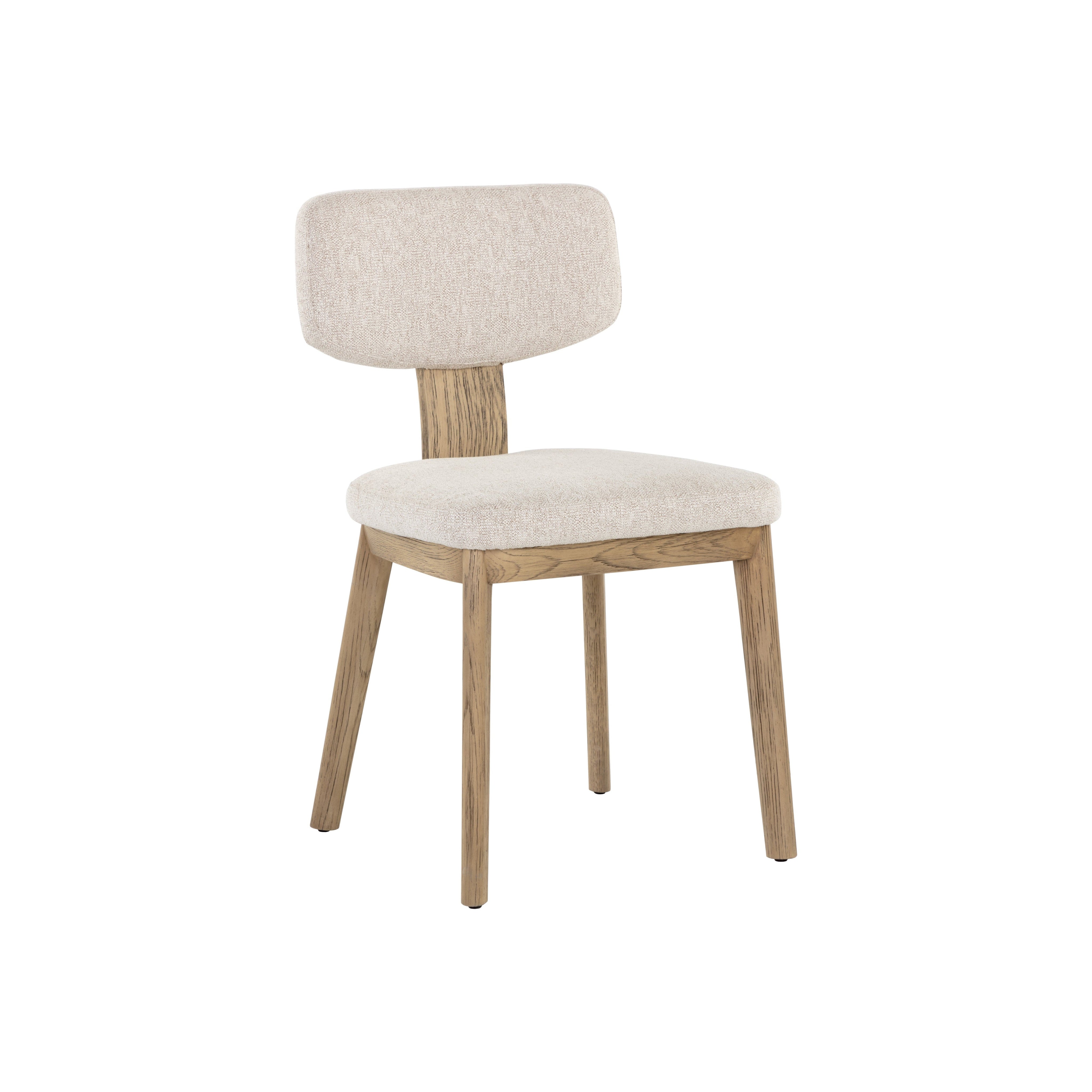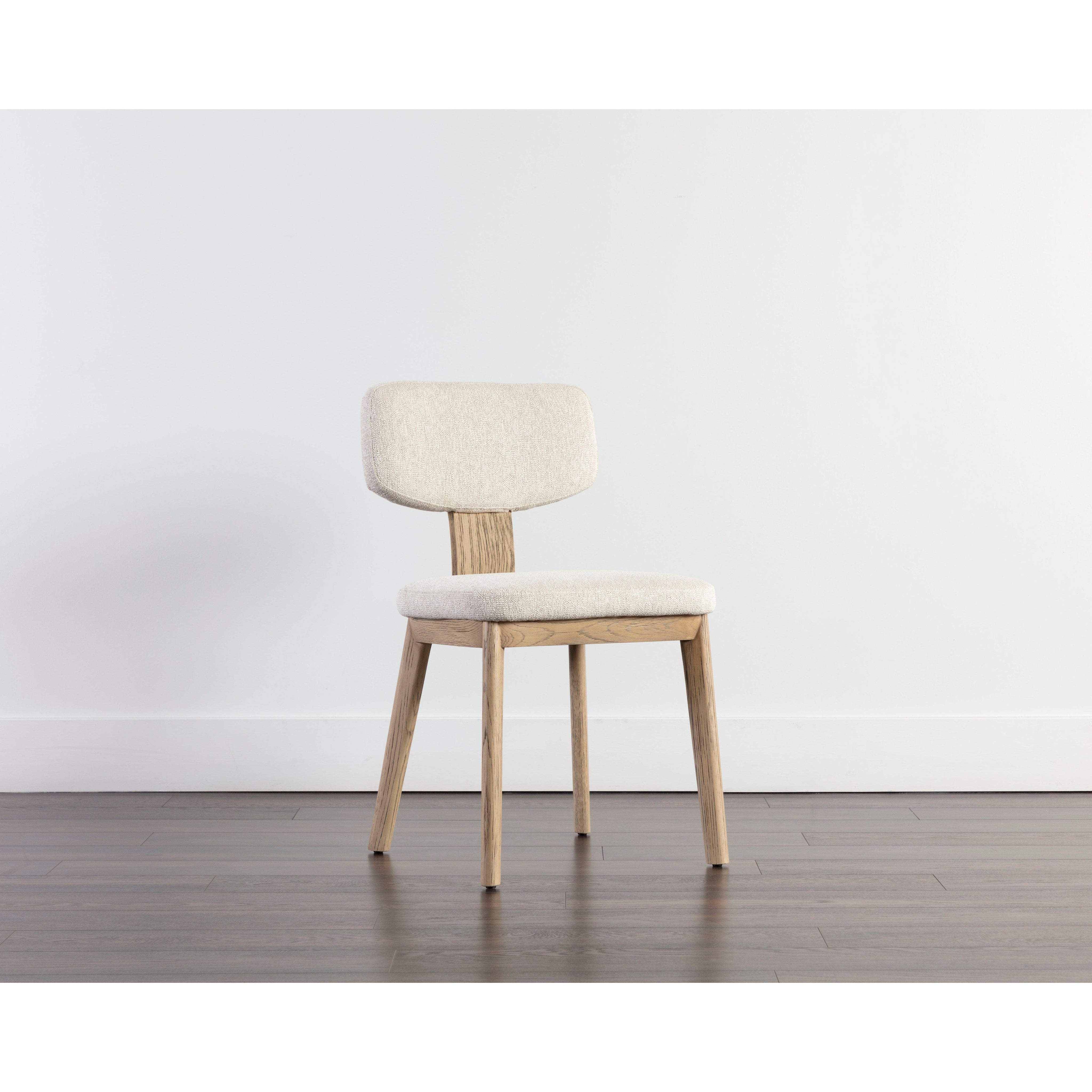 Designed with timeless appeal, this mid-century modern dining chair is a great addition to any dining space. Upholstered in dove cream fabric with a solid weathered oak wood frame.