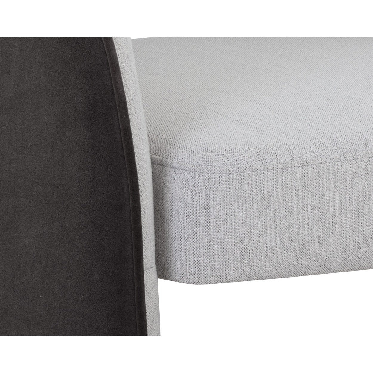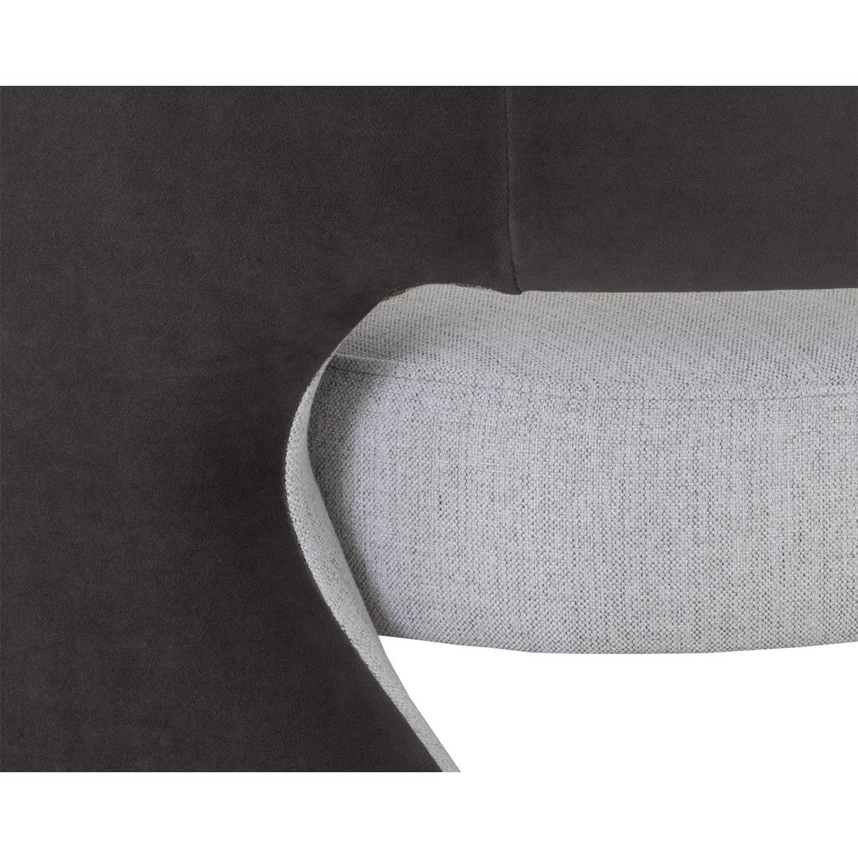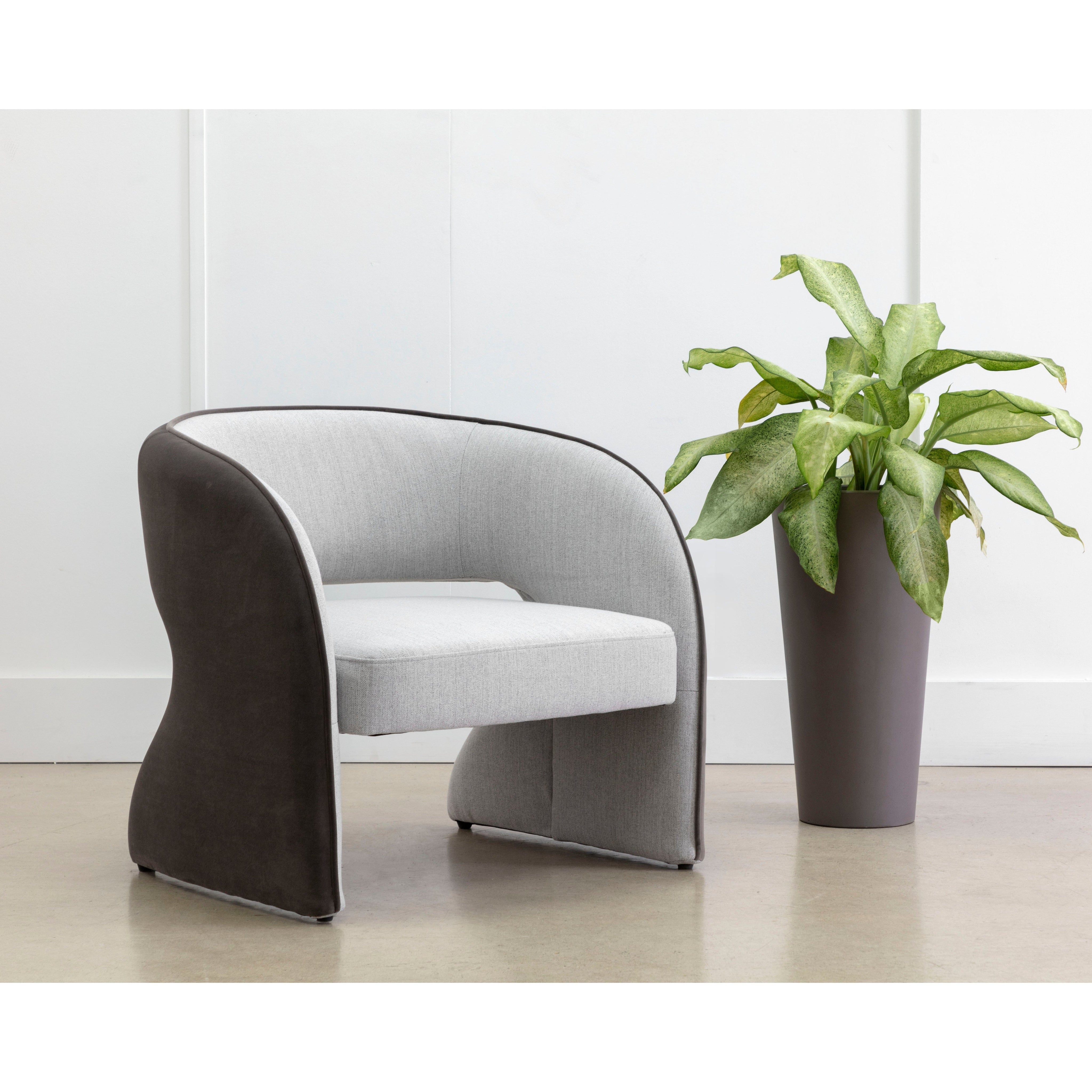 Plush curves characterize this contemporary lounge chair. Features a narrow cutout on the back and piping on the edge for extra definition. This two-toned combination features an interior upholstered in mina light grey fabric and an exterior in meg ash fabric. Also available in a timeless teal fabric and a meg rust fabric.