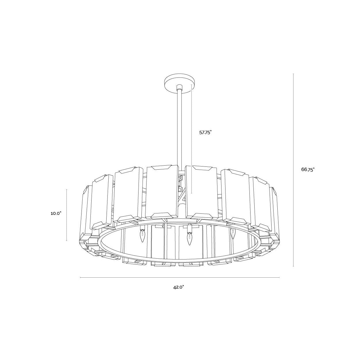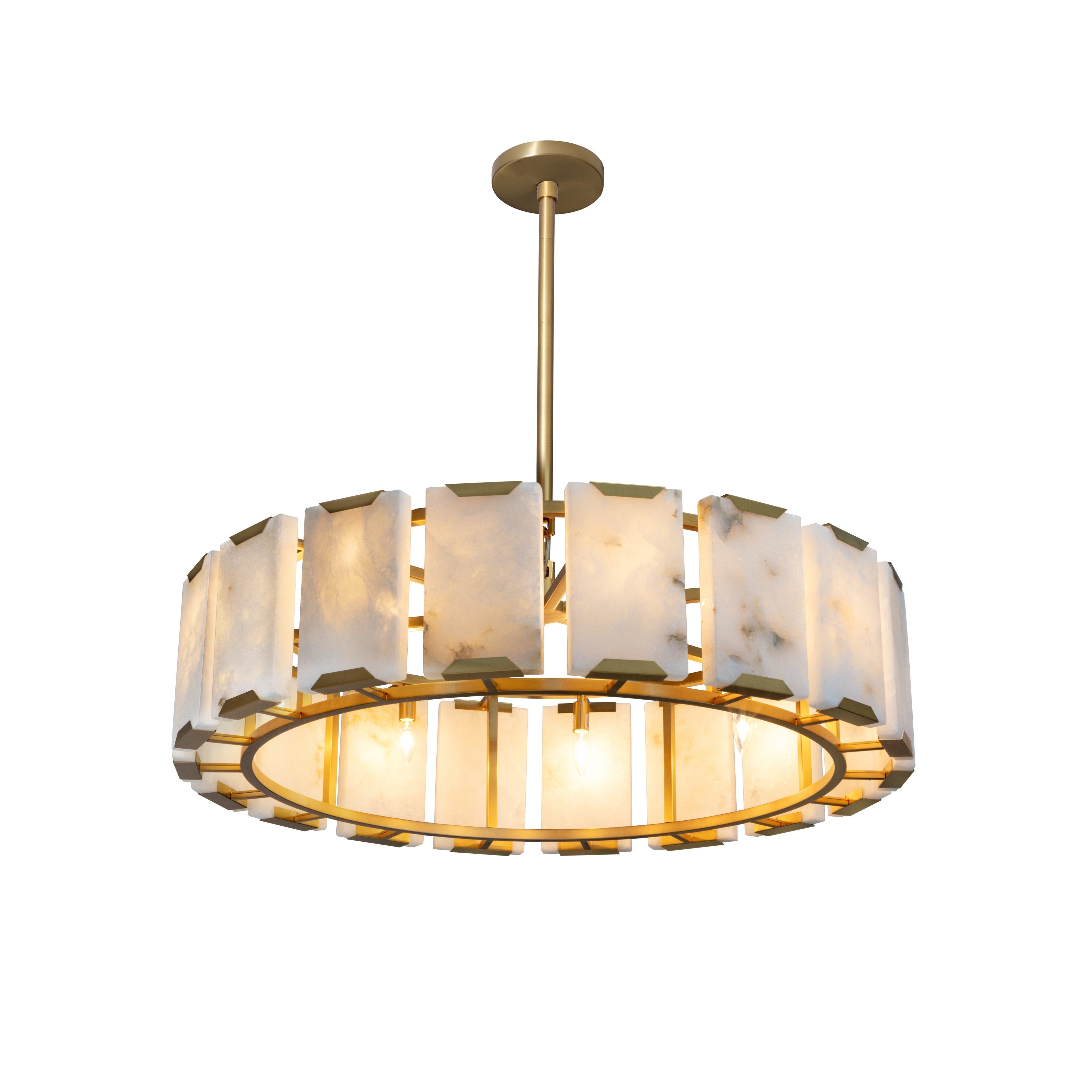 The Rovira Chandelier is an artful examination of the beauty of natural stone. Thick, hand carved panels of alabaster imported from Spain are held between a brushed gold iron circular frame for a dazzling design. The translucent nature of alabaster allows light to flow through, emitting a soft ambient glow. When lit, this design truly comes to life. As alabaster is a natural material, unique veining and colour variations are all characteristics that add to the uniqueness and beauty of each piece.