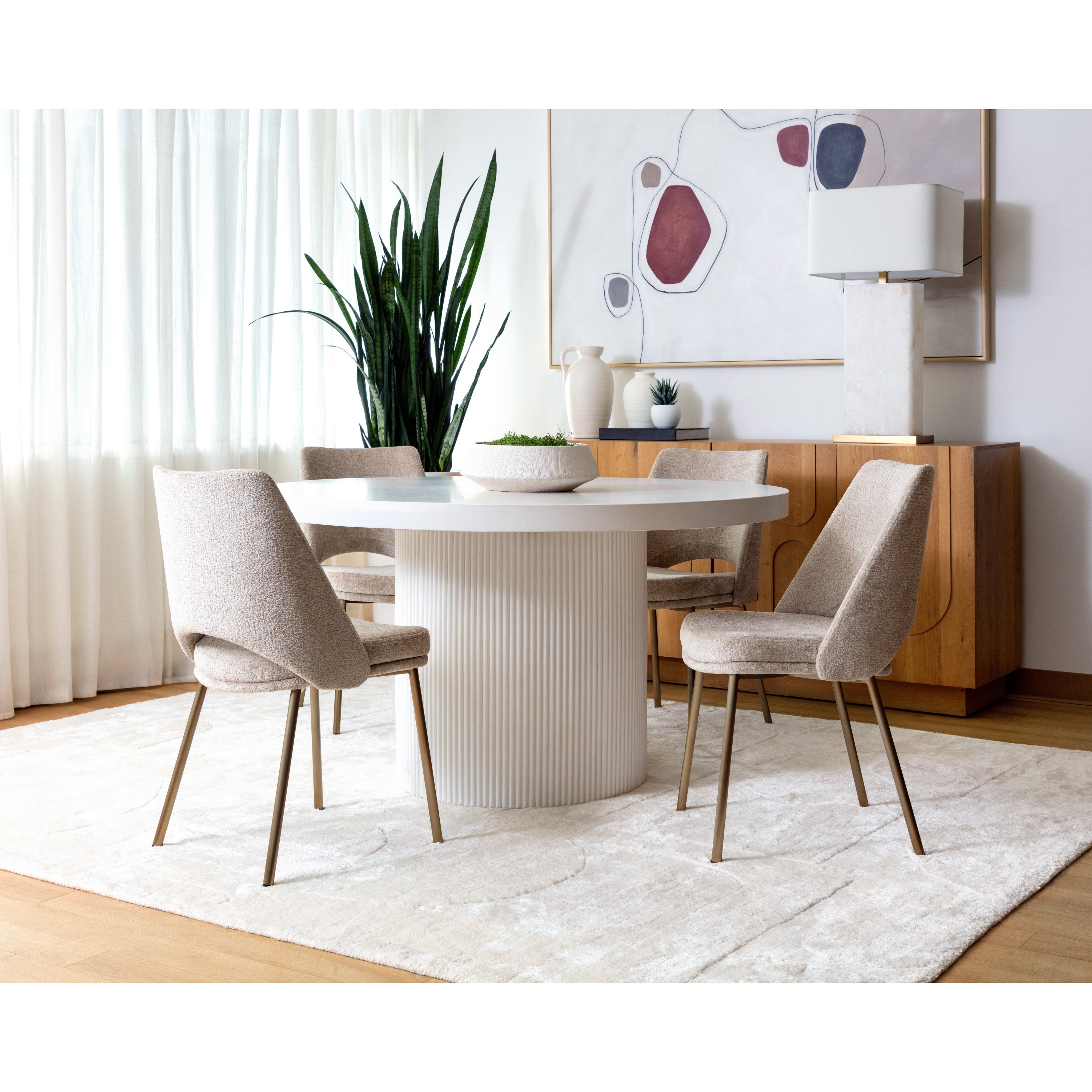 The Rovira Table Lamp is an artful examination of the beauty of natural stone. A thick, hand carved panel of alabaster imported from Spain is displayed on top of a brushed gold iron base for a dazzling design. An off-white linen shade complements the look. The translucent nature of alabaster allows light to flow through, emitting a soft ambient glow. When lit, this design truly comes to life. As alabaster is a natural material, unique veining and colour variations are all characteristics that add to the uniqueness and beauty of each piece.