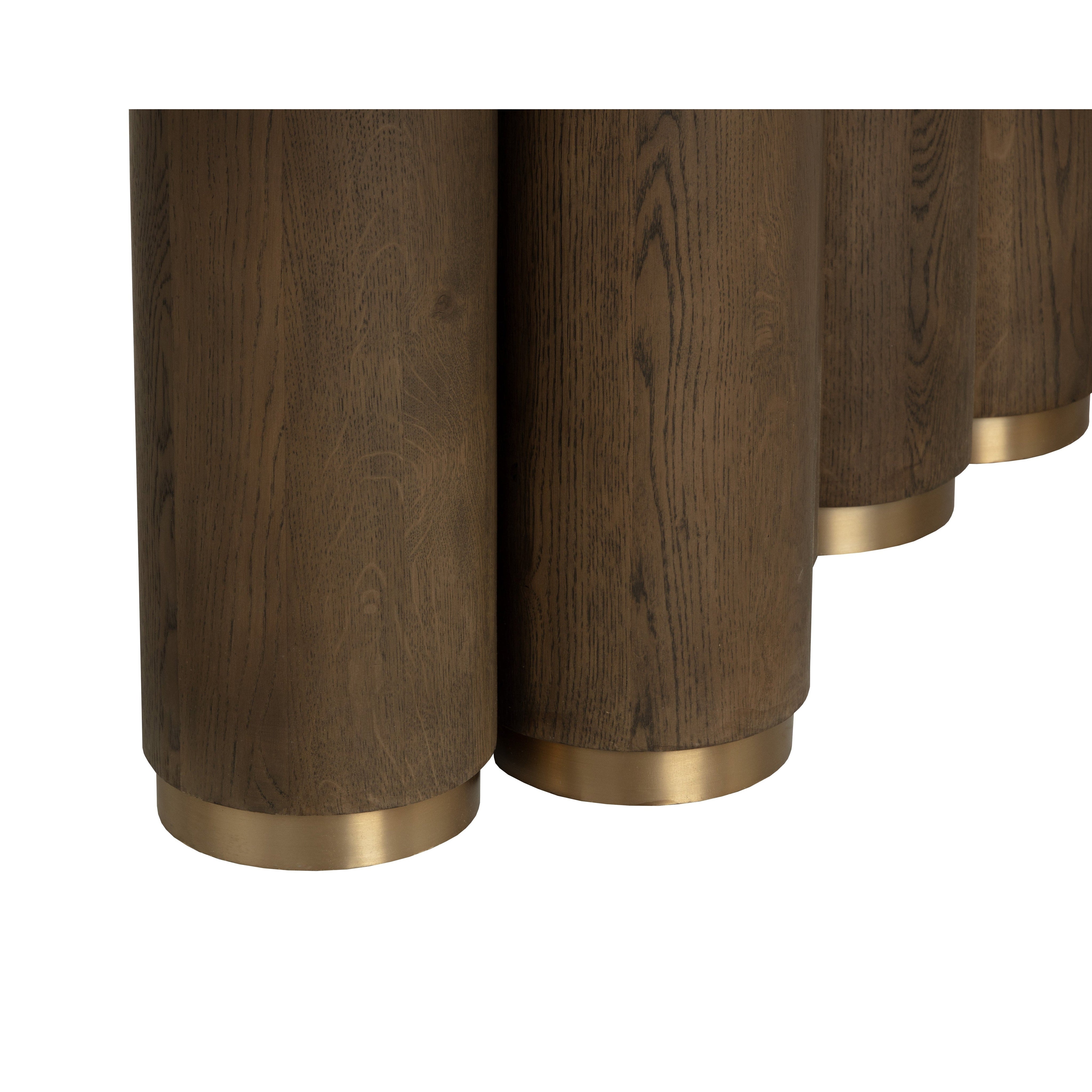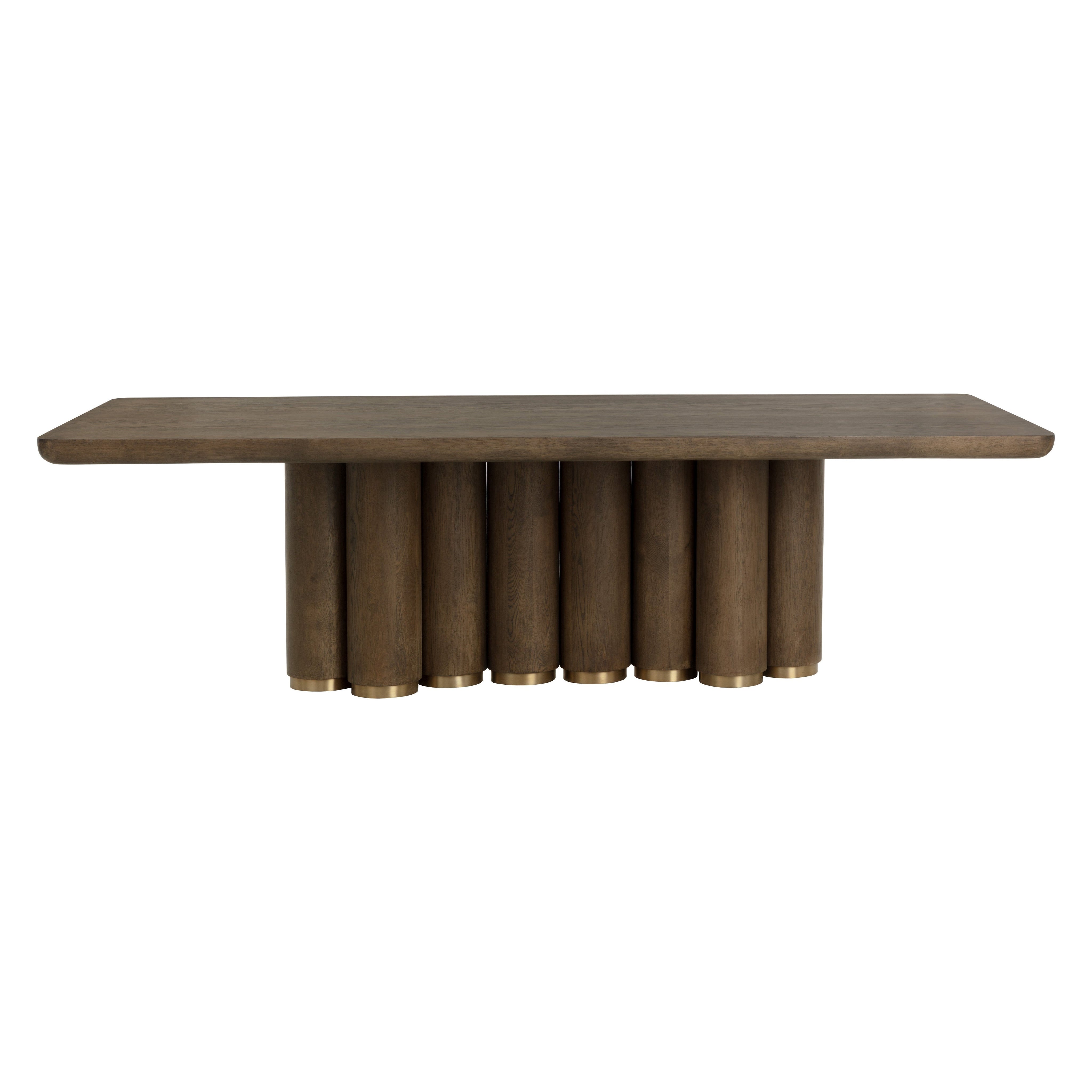The Salix Dining Table is a sculptural centrepiece made for gathering. Crafted in warm chocolate oak, the rounded rectangular top rests on a base of cylindrical pillars, each capped with golden accents that lend a subtle gleam. Bold in form and thoughtful in detail, it anchors any dining space with style.