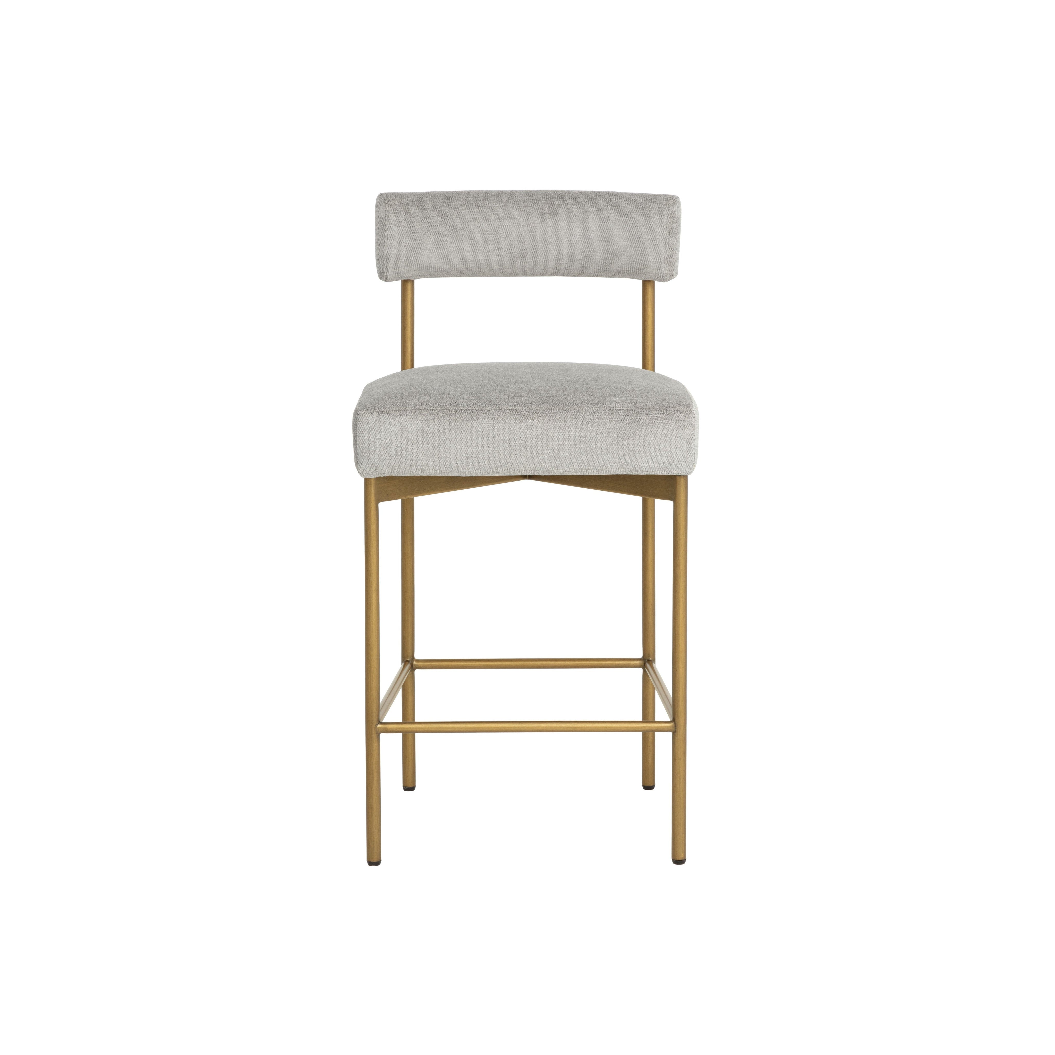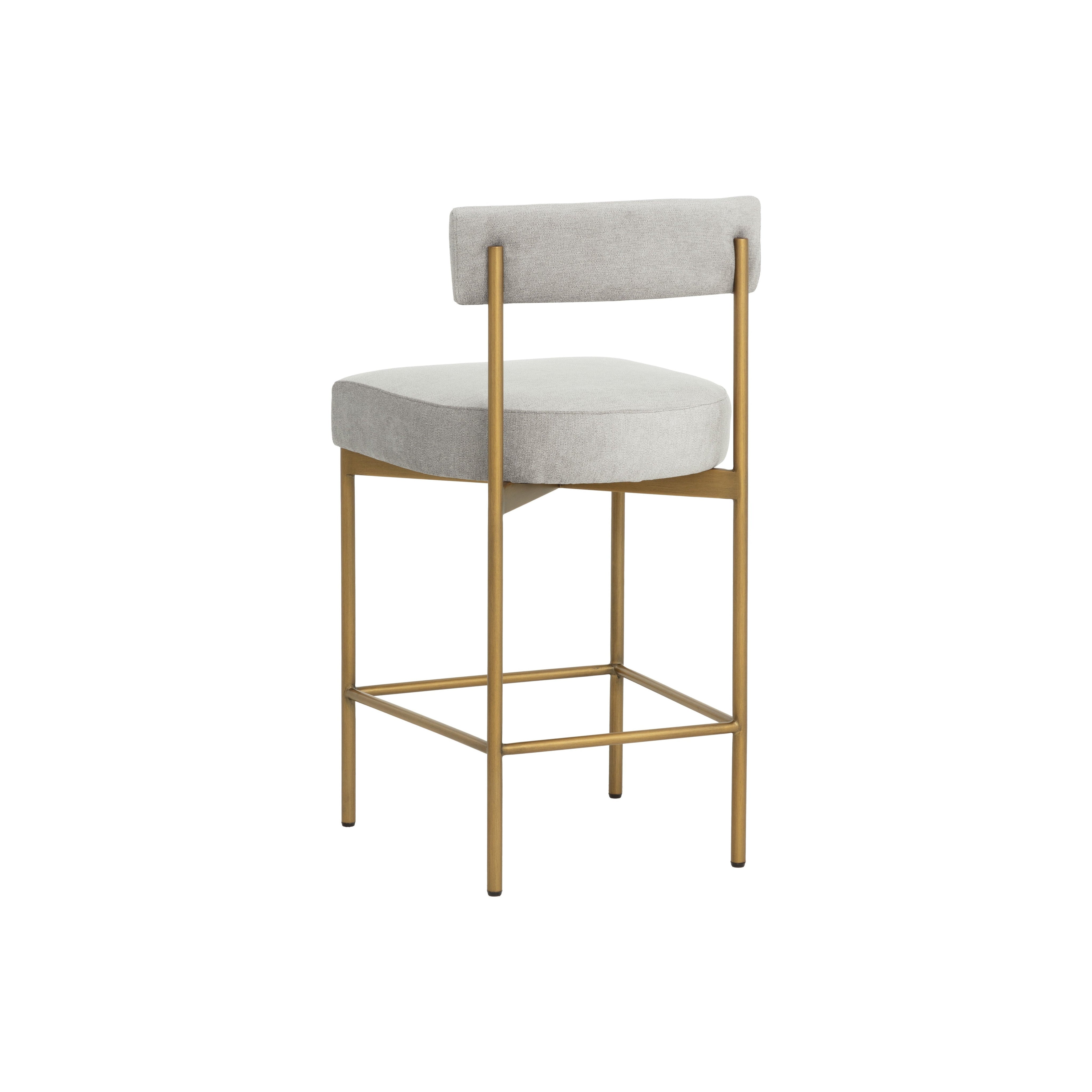 Exude modern style this open back counter stool. Stocked in polo club stone fabric with an antique brass steel frame.