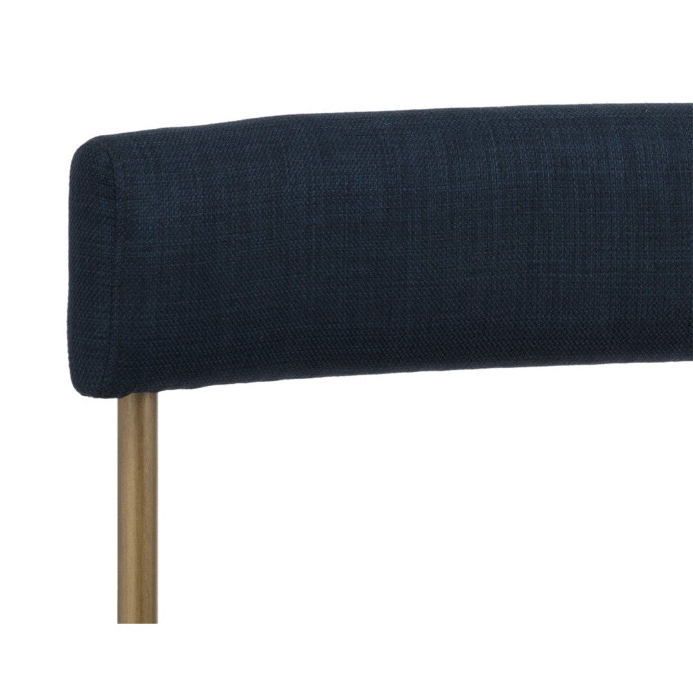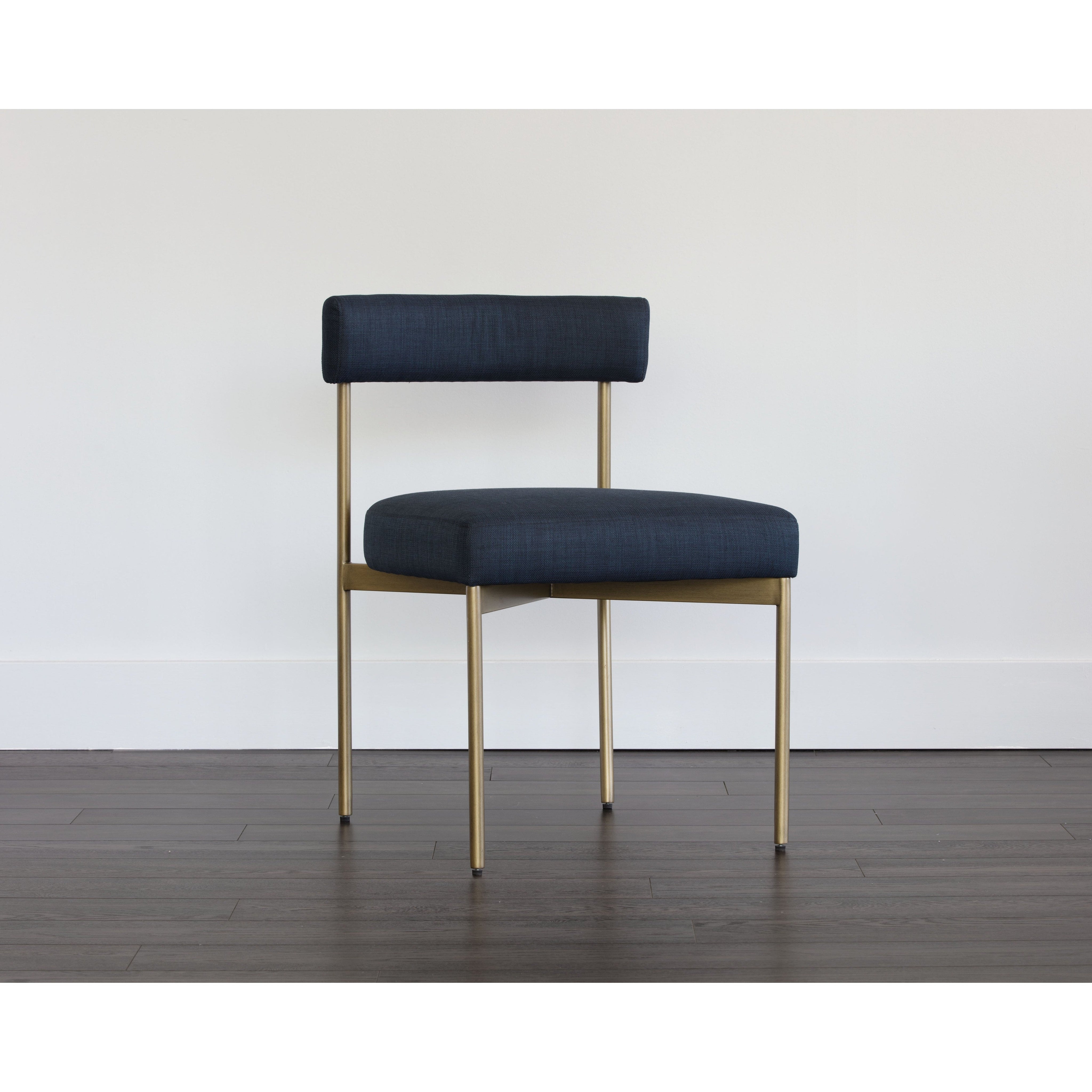 Exude modern style with this open back dining chair. Stocked in arena navy fabric with an antique brass steel frame.