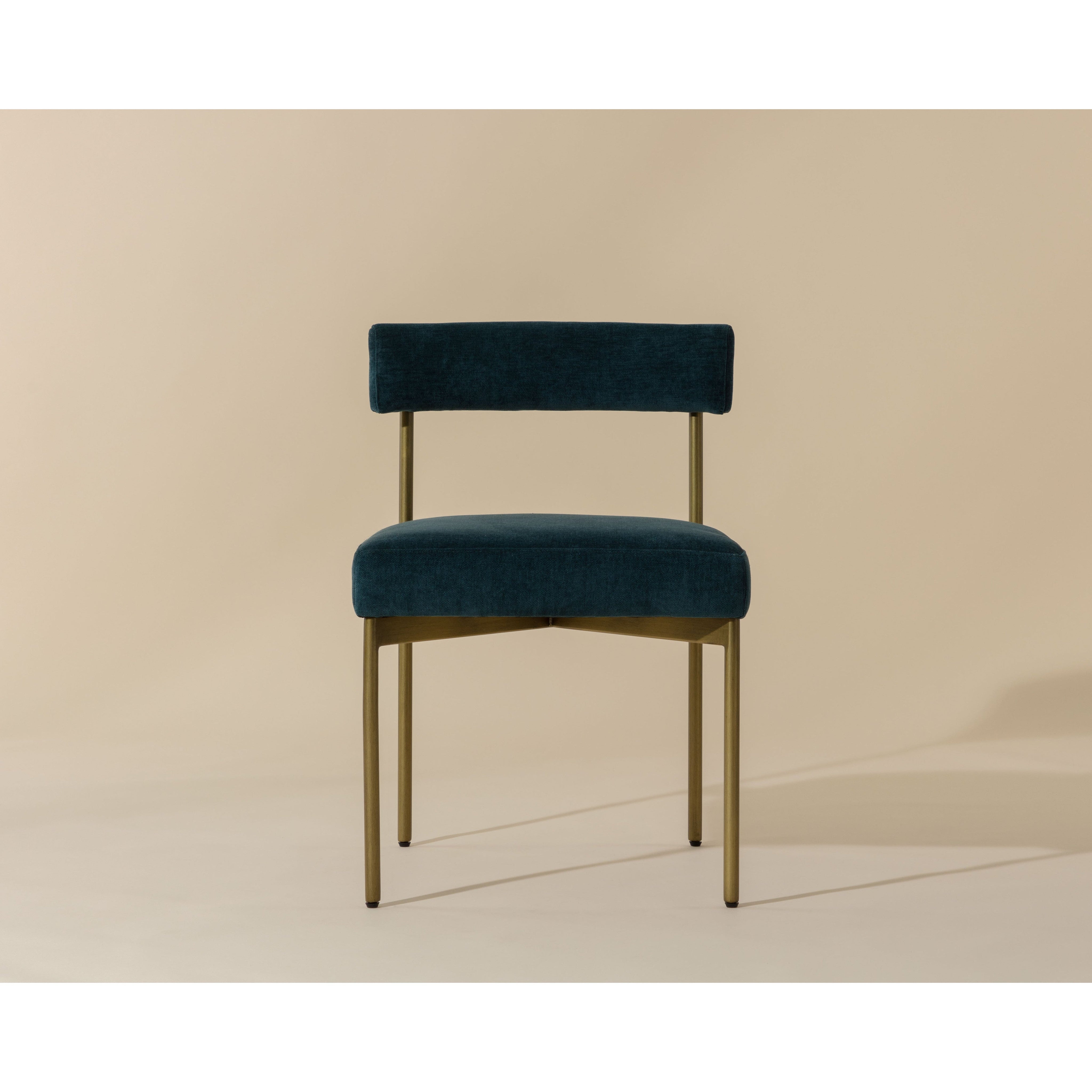 Exude modern style with this open back dining chair. Stocked in danny teal fabric with an antique brass steel frame.