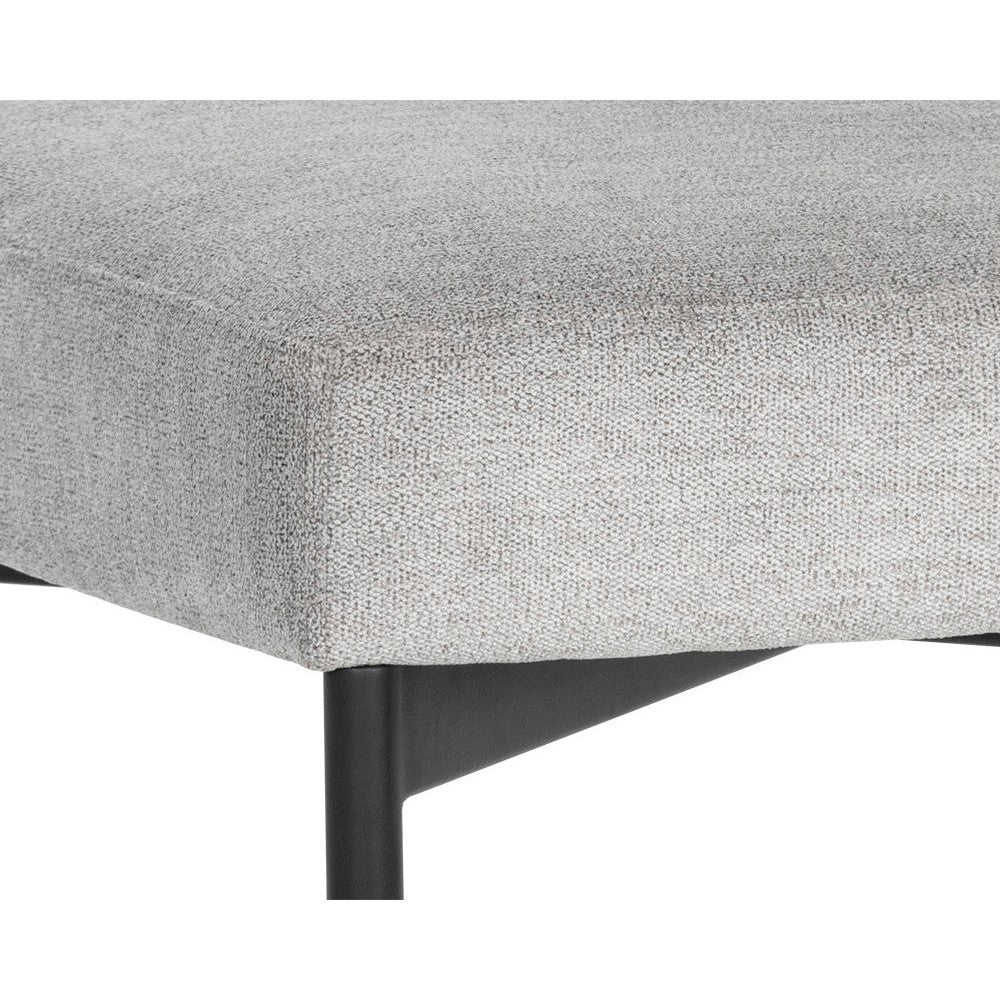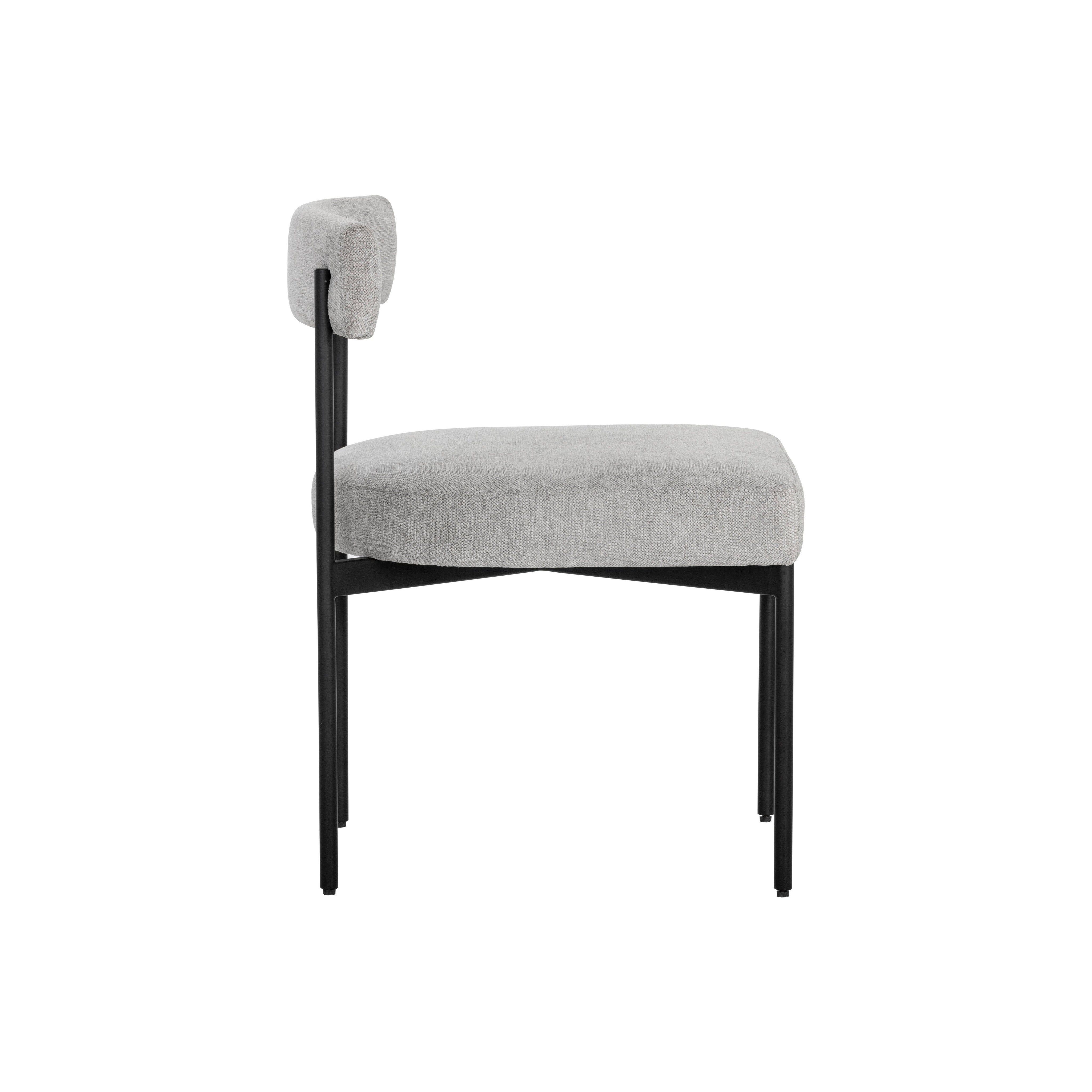 Exude modern style with this open back dining chair. Stocked in polo club stone performance fabric with an black powder-coated steel frame.