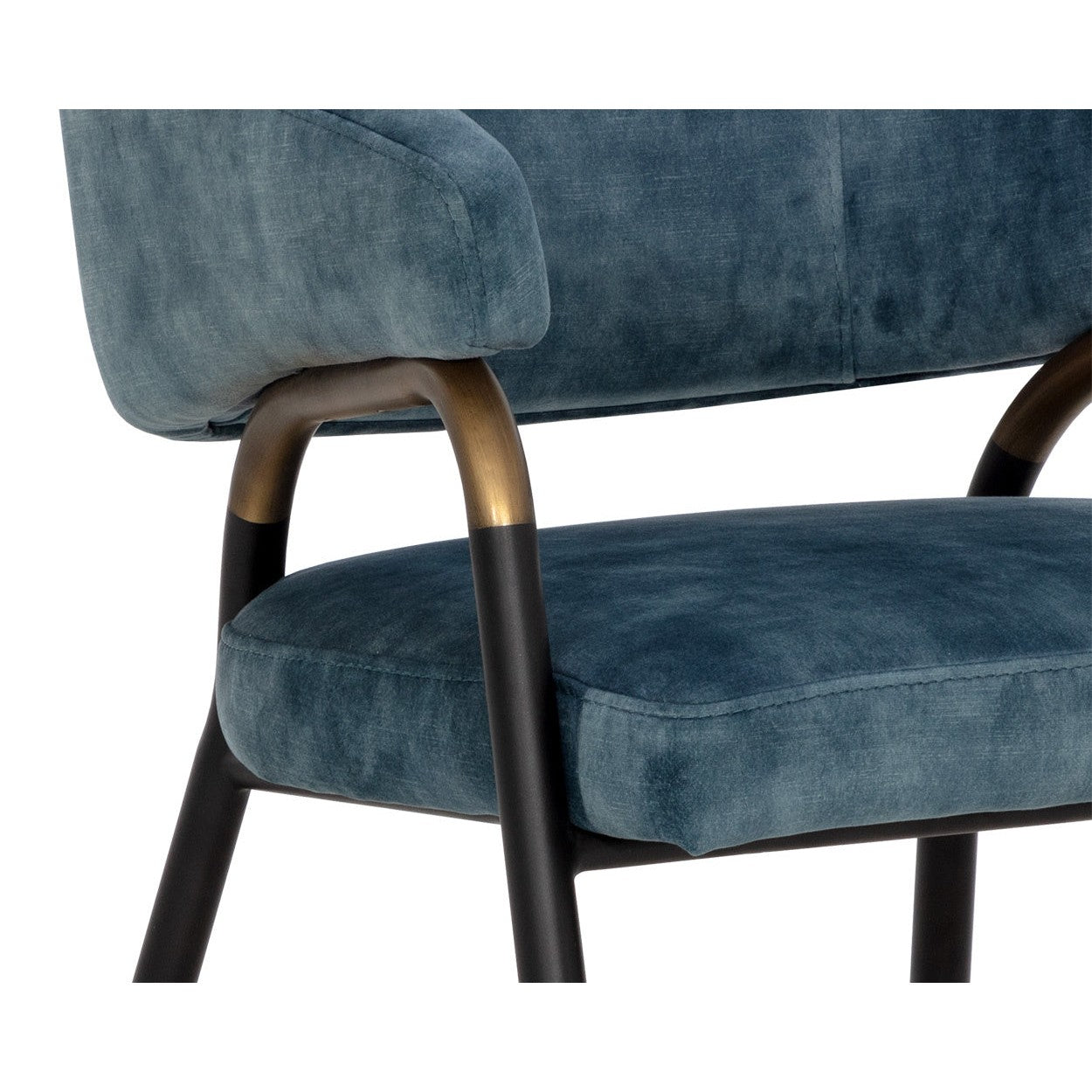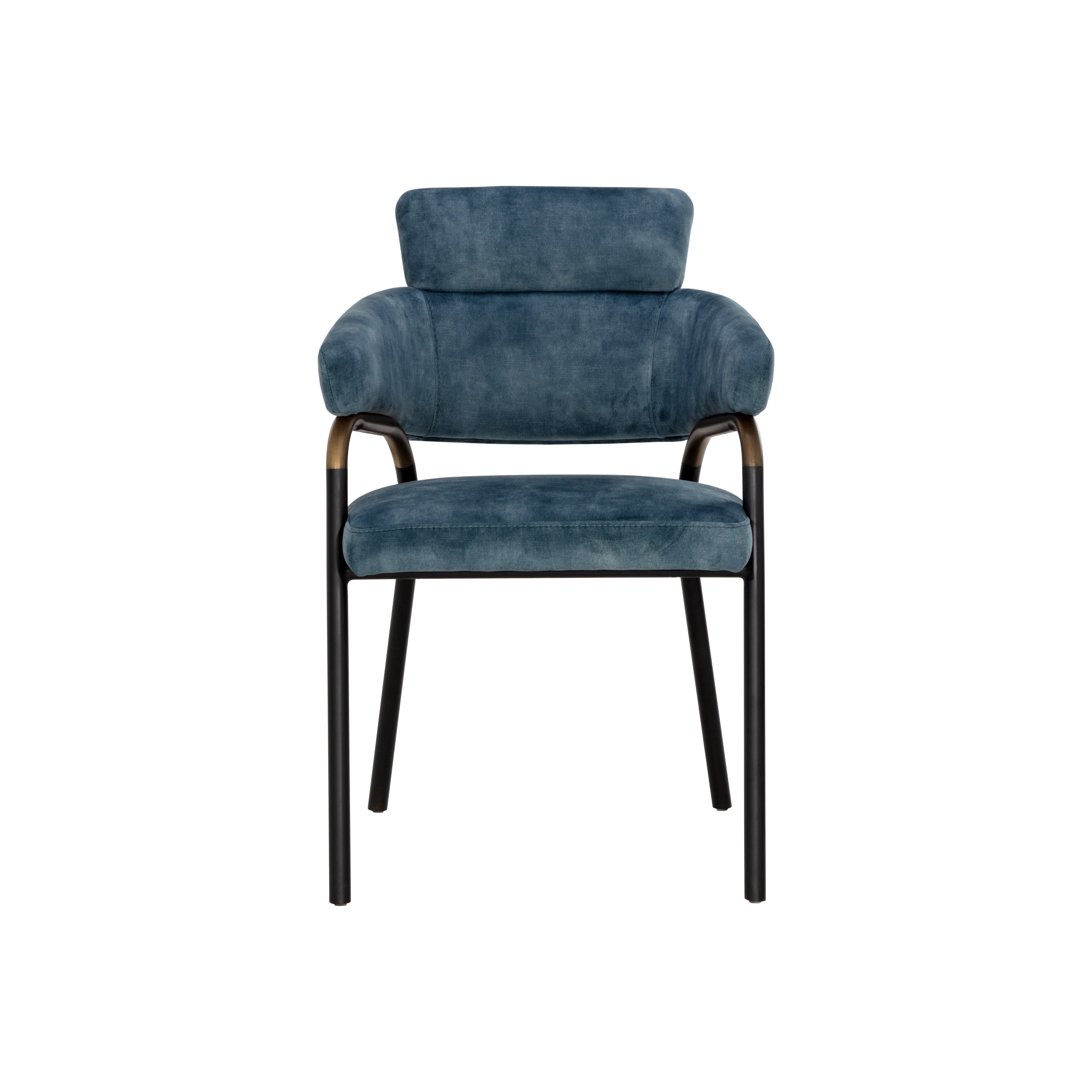 Stun guests with this lavish, contemporary dining armchair that will be sure to turn heads. Stocked in nono petrol fabric and completed with black metal legs that feature a porto bronze armrest accent.